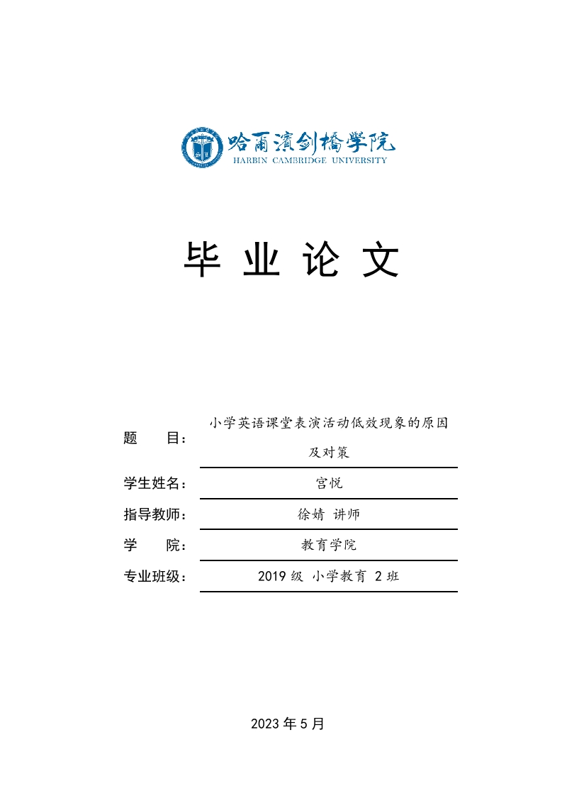 HARBIN CAMBRIDGE UNIVERSITY毕业论文小学英语课堂表演活动低效现象的原因题目:及对策学生姓名:宫悦指导教师:徐婧讲师学院:教育学院专业班级:2019级小学教育2班2023年5月摘要自新课改以来,表演在当前小学教学中的应用日益普遍,对深化教学改革,培养学生综合素养,提高教学效果起到了明显作用。课堂表演活动的形式分为情景表演、说唱表演、书写表演,通过对现有的研究进行分析,发现目前小学英语表演的运用还存在着一定的问题,如课前准备工作不充分、忽视学生的课堂主体性等,造成了课堂教学的效率低下。本文通过对目前我国中小学英语教学中“表演”的现状进行了分析,并提出了相应的改善对策,使“表演”在中小学英语教学中更好地起到应有的效果。为此,本文将英语教学中的表演行为作为一个案例,通过对国内外有关文献的梳理与分析,总结出其基本的理论依据:希望能为今后在课堂上进行表演活动提供一些借鉴。本文运用文献资料法、访谈法、案例分析法等方法,对小学英语教学中的表演形式进行了较为客观的描述,找出了小学英语表演低效的具体表现,并对这些表现产生的原因进行了分析,提出了一些改进的对策。本文旨在通过对英语教学实践活动的分析,来探讨英语教学中表演活动低效的问题。关键词:小学英语:课堂表演活动:低效现象AbstractSince the new curriculum reform,the application of performance in the current primaryschool teaching is increasingly common,which has played an obvious role in deepening theteaching reform,cultivating students'comprehensive quality and improving the teaching effect.Classroom performance activities can be divided into scene performance,rap performance andwritten performance.Through the analysis of existing research,it is found that there are stillsome problems in the application of English performance in primary schools,such asinadequate preparation before class and ignoring students'classroom subjectivity,resulting inlow efficiency of classroom teaching.Based on the analysis of the current situation of"performance"in primary and secondary school English teaching,and put forward thecorresponding improvement measures,make "performance"in primary and secondary schoolEnglish teaching to better effect.Therefore,this paper takes acting behavior in English teachingas a case,and summarizes its basic theoretical basis by combing and analyzing relevantliterature at home and abroad.Hope to provide some reference for performing activities in classin the future.By using the methods of literature,interview and case analysis,this paper objectivelydescribes the performance forms in primary school English teaching,finds out the specificmanifestations of low efficiency in primary school English performance,analyzes the causes ofthese manifestations,and puts forward some countermeasures for improvement.This paperaims to explore the inefficiency of performance activities in English teaching through theanalysis of practical activities in English teachingKeywords:Primary School English;Classroom performance;Inefficiency
