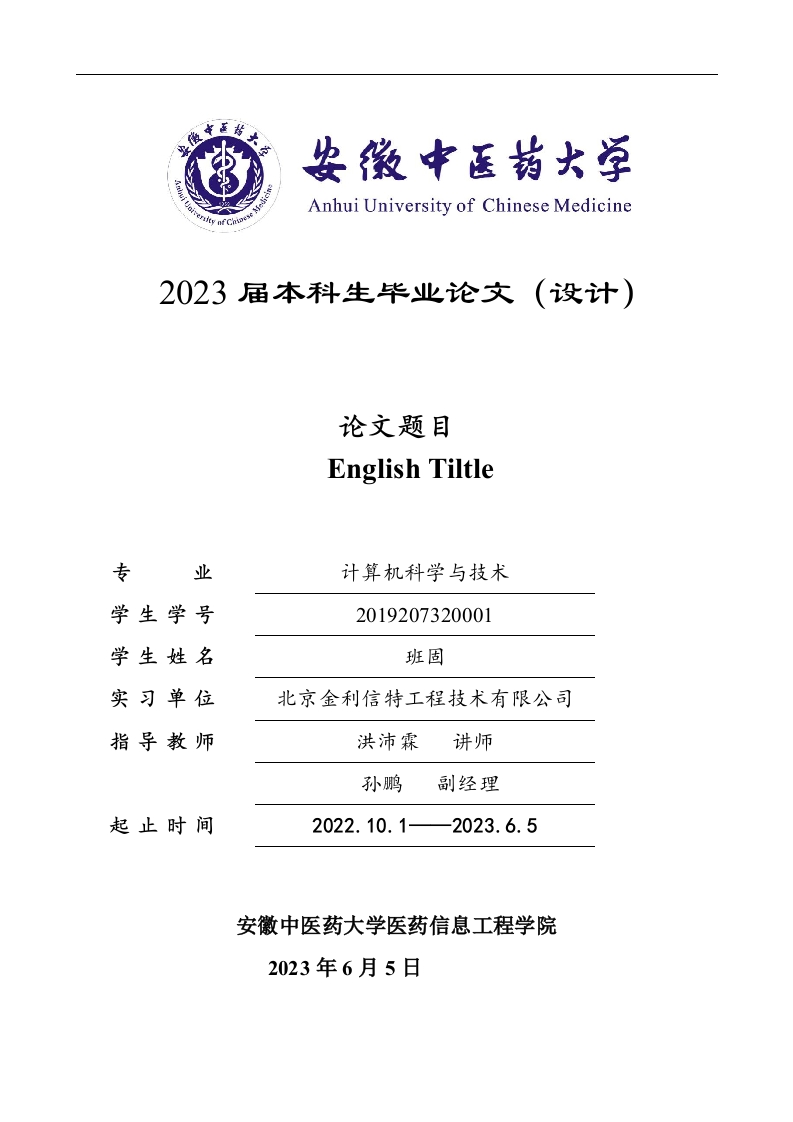 Anhui University of Chinese Medicine2023届本科生毕业论文(设计)论文题目English Tiltle专业计算机科学与技术学生学号2019207320001学生姓名班固实习单位北京金利信特工程技术有限公司指导教师洪沛霖讲师孙鹏副经理起止时间2022.10.1—2023.6.5安徽中医药大学医药信息工程学院2023年6月5日毕业论文(设计)原创性声明本人郑重声明:所呈交的学位论文,是本人在导师的指导下,独立进行研究工作所取得的成果。除文中己经注明引用的内容外,本论文不包含任何其他个人或集体已经发表或撰写过的作品成果。对本文的研究作出重要贡献的个人和集体,均己在文中以明确方式标明。本人完全意识到本声明的法律结果由本人承担。作者签名:班固日期:2023年6月5日公开交流☑同意口不同意摘要中医药的历史发展内容非常丰富,涵盖了对已有体制的传承、应用与继承,理论、实践上的革新以及学术的发展。随着时间的进展和信息技术的提高,以网络为首的新型信息对人们社会的生产、工作、学习甚至到生活,产生着普遍而深远的影响。为了进行对中医药科学知识的宣传,人们有需要建立一种有效、快捷的中医药学习网络解决方案,开发中医药知识网络。该平台采取BS架构,并引入了MWC的设计思路,并引入Jva编程语句,在前台通过HTML+CSS等技术开发,后端则通过SSM和MySQL数据库实施。通过构建中医药知识网站,实现资源的整合以及共享,提供学习服务满足用户学习中药知识的需求。该学习平台有用户和管理员两大功能模块。学习平台为用户提供:课件学习、课后练习、授课视频学习、中药考试、查看错题等功能,管理员通过登录学习平台可以对用户信息、中药信息、中医学习、资源信息以及考试信息进行管理。在网络时代,系统的中医药教育与宣传创造了全新的方法。关键词:中医药知识网站:SSM框架:MySQL