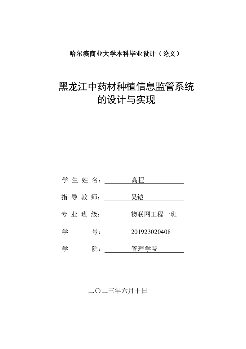 哈尔滨商业大学本科毕业设计(论文)黑龙江中药材种植信息监管系统的设计与实现学生姓名:高程指导教师:吴铠专业班级:物联网工程一班学号:201923020408学管理学院二O二三年六月十日哈尔滨商业大学本科毕业设计(论文)Undergraduate Graduation Project (Thesis)Harbin University of CommerceDesign and Implementation of HeilongjiangTraditional Chinese Medicine PlantingInformation Supervision SystemStudentGaoChengSupervisorWuKaiSpecialtyand ClassInternet of Things Engineering Class 1Student ID201923020408SchoolManagement School2023-06-10哈尔滨商业大学本科毕业设计(论文)摘要随着科学技术的不断进步,电脑技术的优越性与普及性,黑龙江种植业信息化管理体系的建设已势在必行。黑龙江种植业管理信息系统主要依靠电脑,通过对主页,药材信息,个人中心:后端的管理等资料的管理。减轻了管理员的工作量,同时也便于广大职工对黑龙江种植业信息监控系统进行及时的查询和管理。在黑龙江中药材种植信息监管系统的设计中,以Java为主体,以B/S体系结构为核心,并与当前主流的SSM体系结构相融合。中间件服务器是一个使用DEA开发环境的Mysql数据库的Tomcat服务器。该黑龙江种植信息监管系统包括员工和管理员。本论文对黑龙江种植信息监管详细地介绍了开发背景,开发技术,接着对系统的需求进行了分析,详细地阐述了黑龙江中药材种植信息监管系统的业务流程、系统结构等,通过系统后台管理功能管理员工信息、种植户管理、种植信息管理、药品品质规格管理、种植种类管理以及药材采购管理等功能。关键词:黑龙江种植:信息监管系统管理;ue框架;SSM框架