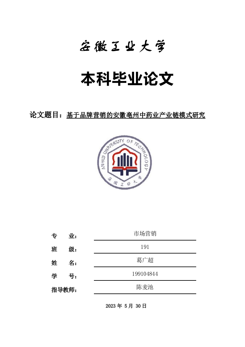 本科毕业论文论文题目:基于品牌茸销的安徽毫州中药业产业链模式研究专市场营销班级191姓葛广超学199104844指导教师:陈麦池2023年5月30日毕业设计(论文)独创性声明本人郑重声明:所呈交的毕业设计(论文),是本人在指导教师指导下,进行研究工作所取得的成果。除文中已经注明引用的内容外,本毕业设计(论文)的研究成果不包含任何他人创作的、已公开发表或没有公开发表的作品内容。对本毕业设计(论文)所涉及的研究工作做出贡献的其他个人和集体,均已在文中以明确方式标明。本毕业设计(论文)独创性声明的法律责任由本人承担。毕业设计(论文)作者签名:葛广超2023年5月30日本人声明:该毕业设计(论文)是本人指导学生完成的研究成果,已经审阅过论文的全部内容,并能够保证题目、关键词、摘要部分中英文内容的一致性和准确性。毕业设计(论文)指导教师签名:2023年5月30日安徽工业大学本科毕业论文摘要中药产业是安徽省亳州市的传统优势产业,具有良好的产业基础和资源优势。基于品牌营销研究亳州中药业产业链对于提升产业高质量发展和毫州市经济发展有重要意义。本文通过查阅数据和文献,从宏观到个体具体总结分析了我国中药产业发展现状,中药业产业链品牌营销概述,毫州中药材的品类与品牌结构,从中发现亳州中药业产业链发展存在的问题,尽管毫州市中药的资源禀赋较高,但是产业类型质量低,产业链的开发仍然不足,人才的缺失,品牌的影响力较低影响产业发展。借鉴其他中药品牌的成功经验,品牌营销对毫州中药产业链高质量发展有促进作用。基于以上分析,毫州中药业产业链从中药生产到加工销售,需提高质量,获得消费者的认可,建立品牌形象。促进产业融合,利用自身优势推进旅游发展,打造城市名片。加强人才培养引进和研发投入。更好促进毫州中药产业发展与经济发展。I