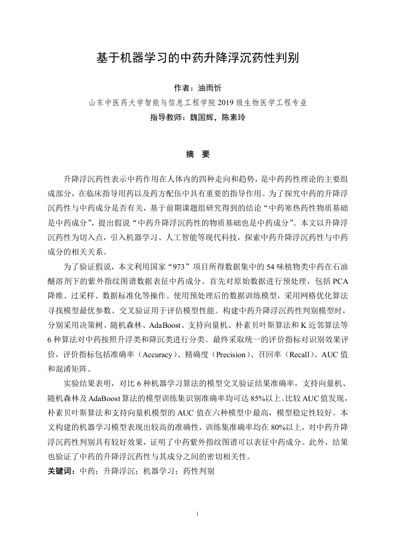 基于机器学习的中药升降浮沉药性判别作者:油雨忻山东中医药大学智能与信息工程学院2019级生物医学工程专业指导教师:魏国辉,陈素玲摘要升降浮沉药性表示中药作用在人体内的四种走向和趋势,是中药药性理论的主要组成部分,在临床指导用药以及药方配伍中具有重要的指导作用。为了探究中药的升降浮沉药性与中药成分是否有关,基于前期课题组研究得到的结论“中药寒热药性物质基础是中药成分”,提出假说“中药升降浮沉药性的物质基础也是中药成分”。本文以升降浮沉药性为切入点,引入机器学习、人工智能等现代科技,探索中药升降浮沉药性与中药成分的相关关系。为了验证假说,本文利用国家“973”项目所得数据集中的54味植物类中药在石油醚溶剂下的紫外指纹图谱数据表征中药成分。首先对原始数据进行预处理,包括PCA降维、过采样、数据标准化等操作。使用预处理后的数据训练模型,采用网格优化算法寻找模型最优参数、交叉验证用于评估模型性能。构建中药升降浮沉药性判别模型时,分别采用决策树、随机森林、AdaBoost、支持向量机、朴素贝叶斯算法和K近邻算法等6种算法对中药按照升浮类和降沉类进行分类。最终采取统一的评价指标对识别效果评价,评价指标包括准确率(Accuracy)、精确度(Precision)、召回率(Recall)、AUC值和混淆矩阵。实验结果表明,对比6种机器学习算法的模型交叉验证结果准确率,支持向量机、随机森林及AdaBoost算法的模型训练集识别准确率均可达85%以上。比较AUC值发现,朴素贝叶斯算法和支持向量机模型的AUC值在六种模型中最高,模型稳定性较好。本文构建的机器学习模型表现出较高的准确性,训练集准确率均在80%以上,对中药升降浮沉药性判别具有较好效果,证明了中药紫外指纹图谱可以表征中药成分。此外,结果也验证了中药的升降浮沉药性与其成分之间的密切相关性。关键词:中药:升降浮沉:机器学习;药性判别The Classification of Traditional Chinese MedicineBased on the Machine LearningABSTRACTIt is a major component of the pharmacological theory of traditional Chinese medicine,and plays an important role in clinical guidance of drug use and prescription compounding.Inorder to investigate whether the rising,falling and sinking properties of Chinese medicine arerelated to the constituents of Chinese medicine,we propose the hypothesis that the materialbasis of the rising,falling and sinking properties of Chinese medicine is also the constituentsof Chinese medicine,based on the conclusion obtained by the previous research group that"the material basis of the cold and hot properties of Chinese medicine is the constituents ofChinese medicine".In this paper,we take the rising,falling and sinking properties of Chinesemedicine as the starting point and introduce modern technology such as machine learning andartificial intelligence to explore the correlation between the rising,falling and sinkingproperties of Chinese medicine and the ingredients of Chinese medicine.In this paper,the ultraviolet fingerprints of 54 botanicals in petroleum ether solvent fromthe dataset of the National "973"Project,"Research on the basic problems related to thepharmacological theory of Chinese medicine",were used to characterize the constituents ofChinese medicines.The UV fingerprint data were used to characterize the components of theChinese medicines.The raw data were first pre-processed,including PCA dimensionalityreduction,oversampling and data normalization.The model was trained using thepre-processed data,and a grid optimization algorithm was used to find the optimal parametersand cross-validation to evaluate the model performance.Six algorithms,including decisiontree,random forest,AdaBoost,support vector machine,plain Bayesian algorithm andK-nearest neighbour algorithm,were used to classify the Chinese medicines according to theascending and descending classes.A unified evaluation index was adopted to evaluate therecognition effect,which included Accuracy,Precision,Recall,AUC value and confusionmatrix.The experimental results show that when comparing the accuracy of modelcross-validation results of the six machine learning algorithms,the recognition accuracy ofthe training set of the models of Support Vector Machine,Random Forest and AdaBoostalgorithms can all reach over 85%.Comparing the AUC values,we found that the AUCvalues of the plain Bayesian algorithm and the support vector machine model were the highestamong the six models,and the model stability was better.The machine learning modelsconstructed in this paper showed high accuracy,with the accuracy of the training set beingabove 80%,and had good results in the discrimination of the lifting and floating properties ofChinese medicines,proving that the UV fingerprinting of Chinese medicines can characterizethe components of Chinese medicines.In addition,the results validated the close correlationbetween the lifting and sinking properties of TCM and its components.Key words:Chinese Medicine;Lifting and Sinking;Machine learning;Pharmaceuticalproperties identify