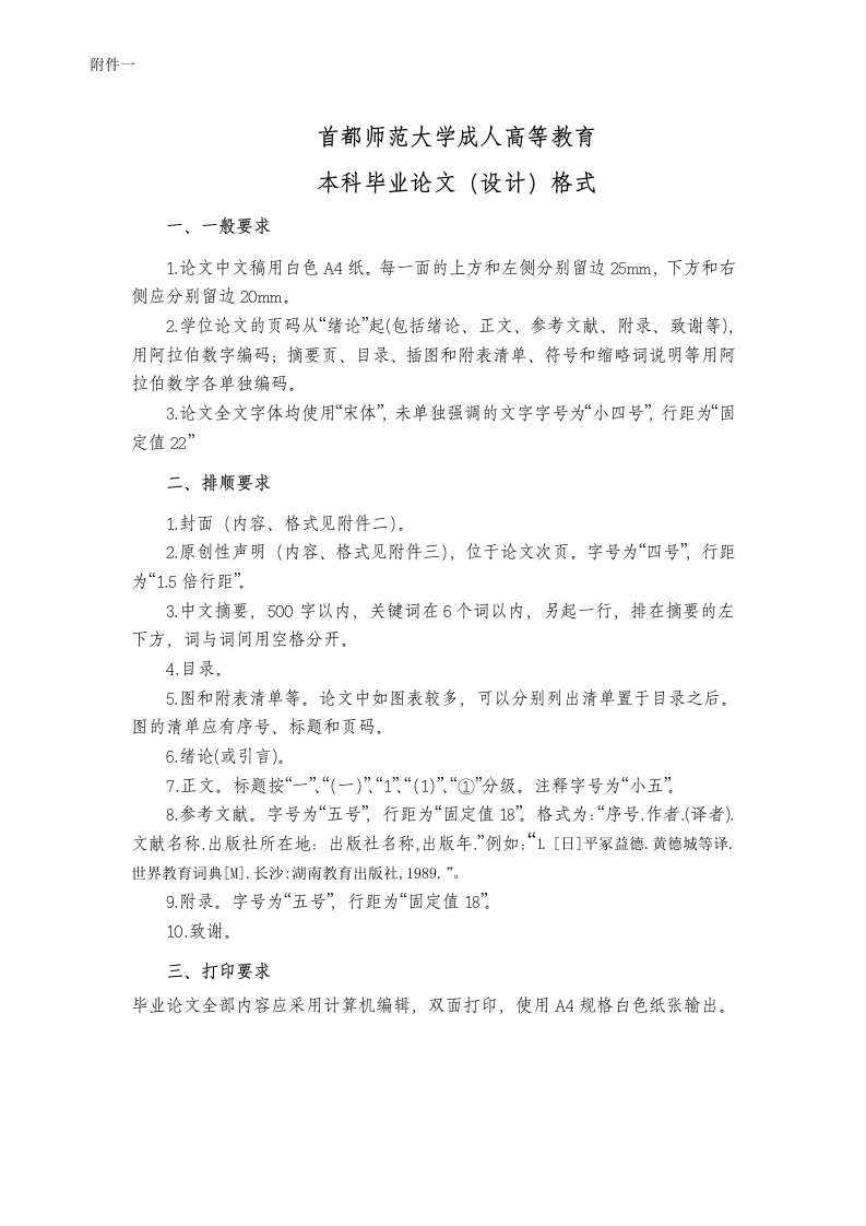 附件一首都师范大学成人高等教育本科毕业论文(设计)格式一、一般要求1.论文中文稿用白色A4纸。每一面的上方和左侧分别留边25mm,下方和右侧应分别留边20mm.2.学位论文的页码从“绪论”起(包括绪论、正文、参考文献、附录、致谢等),用阿拉伯数字编码;摘要页、目录、插图和附表清单、符号和缩略词说明等用阿拉伯数字各单独编码。3论文全文字体均使用“宋体”,未单独强调的文字字号为“小四号”行距为“固定值22”二、排顺要求1.封面(内容、格式见附件二)。2.原创性声明(内容、格式见附件三),位于论文次页。字号为“四号”,行距为“1.5倍行距”3.中文摘要,500字以内,关键词在6个词以内,另起一行,排在摘要的左下方,词与词间用空格分开。4.目录。5.图和附表清单等。论文中如图表较多,可以分别列出清单置于目录之后。图的清单应有序号、标题和页码。6,绪论(或引言)7.正文。标题按“一”“(一)”“1“(1)”“①”分级。注释字号为“小五”8.参考文献。字号为“五号”行距为“固定值18”格式为:“序号.作者(译者),文献名称出版社所在地:出版社名称,出版年”例如:“1[日]平冢益德.黄德城等译世界教育词典[.长沙:湖南教育出版社,1989.”。9.附录。字号为“五号”,行距为“固定值18”10.致谢三、打印要求毕业论文全部内容应采用计算机编辑,双面打印,使用A4规格白色纸张输出。