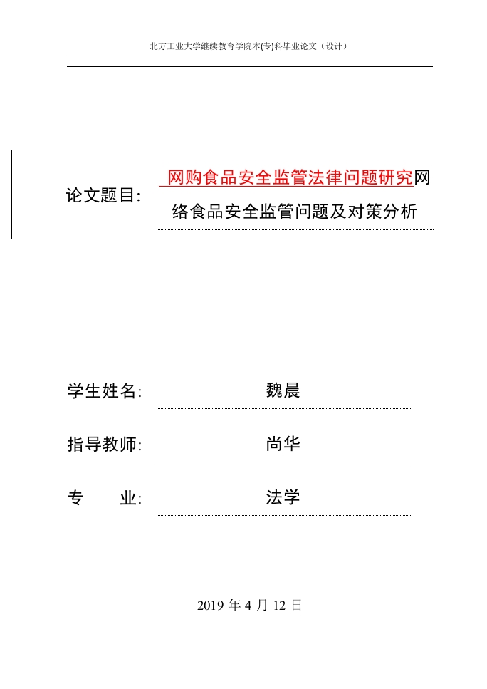 北方工业大学继续教育学院本(专)科毕业论文(设计)网购食品安全监管法律问题研究网论文题目:络食品安全监管问题及对策分析学生姓名:魏晨指导教师:尚华专业:法学2019年4月12日北方工业大学继续教育学院本(专)科毕业论文(设计)摘要网络食品市场的兴起促进了经济增长和市场结构多元化,与此同时也存在企业进入市场限制低、产品质量良莠不齐、虚假宣传及售后维权困难等一系列的安全隐患。网上购物食品质量问题逐渐严重,非法交易现象也不断增多,严重制约着食品行业电子商务的发展。目前,我国在食品市场共同治理模式中初步形成了行政法律、经济、社会三大监管手段,但食品安全监管仍存在诸多问题。在互联网不断发展的背景下,食品流通渠道不再仅仅只是传统的流通,众多商家进入到电子商务平台进行交易,因此,交易的虚拟性使以前的监管政策逐渐变得不适用,加大了食品安全监管工作的难度。本研究根据中国网购食品市场的特点,通过改进现有的系统和优化监管工具,提出了加强网购食品安全监管的几点建议,以维护消费者合法权益、保障人们生命安全,从而推进网购市场食品行业的稳定有序发展。关键词网购食品:食品安全:监管北方工业大学继续教有学院本(专)科毕业论文〔设计)ABSTRACTThe rise of network food market and promote diversified economicgrowth and market structure,at the same time there are also restrictions onenterprises to enter the market is low and the product quality is uneven inquality,false advertising and customer service rights difficult a series ofsafety problems.The quality of online shopping food is becoming more andmore serious,and the phenomenon of illegal trade is also increasing,whichseriously restricts the development of e-commerce in food industry.Atpresent,our country has formed the administrative law,the economy,thesociety three supervisory methods in the food market common managementpattern,but the food safety supervision still has many problems.Thecontinuous development in the context of the Internet,the food circulationchannel is not simply the traditional circulation,many businesses into thee-commerce trading platform,therefore,virtual transactions makeregulatory measures before becoming not applicable,increase food safetysupervision difficult.According to the characteristics of online shoppingfood market China,put forward by combining the improvement of existingsystems and optimize the regulatory tools,some suggestions onstrengthening food safety supervision of online shopping,in order tosafeguard the legitimate rights and interests of consumers,protect the safetyof the people,so as to promote the network market food industry stable andorderly development.Keywords Online shopping food;Food safety;Regulation