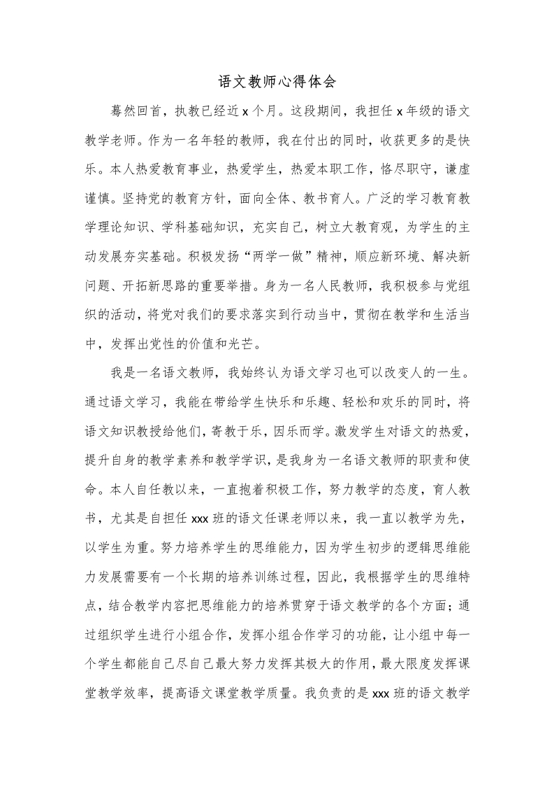 语文教师心得体会蓦然回首,执教已经近x个月。这段期间,我担任X年级的语文教学老师。作为一名年轻的教师,我在付出的同时,收获更多的是快乐。本人热爱教育事业,热爱学生,热爱本职工作,恪尽职守,谦虚谨慎。坚持党的教育方针,面向全体、教书育人。广泛的学习教育教学理论知识、学科基础知识,充实自己,树立大教育观,为学生的主动发展夯实基础。积极发扬“两学一做”精神,顺应新环境、解决新问题、开拓新思路的重要举措。身为一名人民教师,我积极参与党组织的活动,将党对我们的要求落实到行动当中,贯彻在教学和生活当中,发挥出党性的价值和光芒。我是一名语文教师,我始终认为语文学习也可以改变人的一生。通过语文学习,我能在带给学生快乐和乐趣、轻松和欢乐的同时,将语文知识教授给他们,寄教于乐,因乐而学。激发学生对语文的热爱,提升自身的教学素养和教学学识,是我身为一名语文教师的职责和使命。本人自任教以来,一直抱着积极工作,努力教学的态度,育人教书,尤其是自担任x班的语文任课老师以来,我一直以教学为先,以学生为重。努力培养学生的思维能力,因为学生初步的逻辑思维能力发展需要有一个长期的培养训练过程,因此,我根据学生的思维特点,结合教学内容把思维能力的培养贯穿于语文教学的各个方面;通过组织学生进行小组合作,发挥小组合作学习的功能,让小组中每一个学生都能自己尽自己最大努力发挥其极大的作用,最大限度发挥课堂教学效率,提高语文课堂教学质量。我负责的是xx班的语文教学工作,因此我十分注重对学生自主学习和自主探究能力的培养,希望他们能在小学阶段初步建立起主观能动的学习意识,有助于他们之后的语文学习。因此,我依照教学计划,合理地布置语文的前置作业,学生通过前置作业能够主观能动的探究课程中的问题和知识点之间的关系,这是一个培养学生主动学习、自主探索的过程。有效的前置性作业能够带动课堂的气氛,能够帮助学生找到知识点中的问题,也能协助我更好地进行课堂互动,进而营造一种有趣、充满求知欲的课堂环境。基于自身对本职工作的理解,我认为小学生由于只经历过一些基础语文教学,导致其认知能力存在一定的问题,其主要的问题表现在认知能力的不足上。学生对基础的小学语文知识,比如如何发声,跟着教师一起学的过程中,不会有什么认知的问题,但是遇到小学语文知识的难点或是需要运用综合性思维对其进行理解和运用的,就会发生认知能力不足导致无法按时按量地完成语文教学任务的情况。小学语文教学中,教师通常会运用一些基本的语文教学手段,例如:图文结合,或是情景模拟等方式来促进学生更好地进行小学语文知识的学习。但是在小学语文教学的过程中,教师、学校往往会忽视学生学习的兴趣度,以及对小学语文知识的理解能力等问题,而一味地强调语文教学的过程,遗漏了语文教学的效果的提升。在小学中,小学语文教学通过运用静态语文教学,即:读书本知识,教师讲解,学生接受,或是动态的语文教学方式,即教师通过课堂互动,带动学生一起学习小学语文知识,但是从这类的语文教学方式中可以发现,学习小学语文语文教学的机制单一,语文教学机制不完善。通过在xx的学习和进一步提高,我在小学语文的教学方面展开了深刻地思考:首先,是对于小学阅读教学学生学习活动设计而言,语文阅读教学可以巩固和扩大学生的词汇量,培养学生的语感,是学生学习语言和感受语言的重要途径。所以目前,小学生语文阅读教学越来越受到关注。在语文阅读教学中,策略的实施、技巧的运用极为重要,它是培养学生阅读能力的关键所在。因此,对小学生语文阅读能力培养中存在的问题进行分析及对策的探究有着很高的价值和很深的意义。小学语文教师在语文阅读教学中普遍存在只注重语文阅读教学的方式,但忽视了知识点在学习过程中的用法和实际的应用。学生不能将知识运用到实际的学习中,也存在知识运用的疑惑,但教师却在语文阅读教学中很少提及如何运用,而注重的只是如何把只是教好。因此,打造一个合理的、有趣的阅读环境、设计一场参与度高的阅读活动,是阅读教学过程中必不可少的一个环节。其次,小学语文识字写字的教学,以及专题日记与习作的教学,都需要教师能够很好地激发起学生的学习兴趣。因为,小学语文语文识字写字教学主要是培养学生的思维能力的教学。学生初步的逻辑思维能力的发展需要有一个长期的培养训练过程。语文识字写字教学的思维能力的培养,是根据学生的思维特点,结合教学内容在教学过程中实现的。课堂教学是对学生进行思维能力培养的主阵地。所以要把思维能力的培养贯穿于语文识字写字教学的各个方面。小学语文识字写字教学从一年级起就担负着培养学生思维能力的重要任务。同时,
