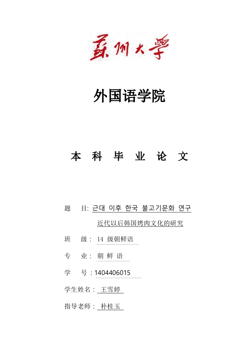 外国语学院业论文题目:근대이후한국불고기문화연구近代以后韩国烤肉文化的研究班级:14级朝鲜语专业:朝鲜语学号:1404406015学生姓名:王雪婷指导老师:朴桂玉论文提交日期:2018年4月12日苏州大学外国语学院2018届学士学位论文근대이후한국불고기문화연구专业:朝鲜语学号:1404406015作者:王雪婷指导教授:朴桂玉2018.4