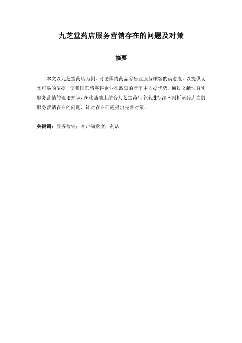 九芝堂药店服务营销存在的问题及对策摘要本文以九芝堂药店为例,讨论国内药品零售业服务顾客的满意度,以提供切实可靠的依据,使我国医药零售企业在激烈的竞争中占据优势。通过文献法夯实服务营销的理论知识,在此基础上结合九芝堂药店个案进行深入剖析该药店当前服务营销存在的问题,针对存在问题提出完善对策。关键词:服务营销:客户满意度:药店目录引言…1九芝堂药店现状分析…1.1优势1.2劣势….22九芝堂药店服务营销存在的问题.…22.1不负责任的药品推介…22.2药品销售任务指标化2.3药店的服务意识不强.32.4营销人员缺乏专业素质.32.5营销态度和营销礼仪不当43九芝堂药店服务营销问题解决措施…3.1针对药品走服务的差异化、有形化、规范化的道路.43.2拒绝业绩指标化,以消费者为中心.3.3锁定销售目标,评价消费者购买过程,维护客户关系.53.4实施内部营销3.5鼓励消费者维权结论6致谢7参考文献…引言药品是一种特殊的商品,其高质量性、高专业性、生命相关性、公共福利性、品种多样性以及产量有限等特点决定了其具有特殊的用途。由于药品的众多性质,导致了药品被国际上列入制约最严格的商品之一,因此各国政府也都非常重视对药品的监督管理以及控制,这同时造成了药品的销售方式不同于其他普通货物,受到一些限制。纵观整个营销市场,传统营销方式费用不仅越来越高并且渠道越来越窄,其销售效果也并不理想,企业为了花费较少的运营成本来取得较高的药品市场占有率,国内医药生产与销售的企业也持续推出新的营销方式来提升企业的经济效益。然而,只有少数药店认识到药品的营销不只有形商品的本身,大部分企业还是忽略了无形服务的重要性。本文通过分析服务营销中的客户满意研究和服务质量管理之间联系,研究影响服务营销质量存在的问题和提出解决问题的措施。加强服务质量来提升客户满意度,从而使企业在竞争中占据优势,提高企业的实力与经济效益,最终达到企业的长期可持续发展。1九芝堂药店现状分析1.1优势(1)交通便利,客源稳定九芝堂药店选址有严格的考察调研,大都在交通便利人流量较多,九芝堂药房装修一向给消费者以专业、严谨和值得信赖的印象,为很多消费者选择药房作为日常必需品这一采购场所的心理依据,拥有较为稳定的老客源。(2)中西药结合在销售西药的同时也有销售中药,店里有着坐诊医师,对病人望闻问切。九芝堂药店不仅出售中药,也有医生为病人把脉抓中药。非处方药是由国务院药品监督管理部门发布的不需要执业医师和执业助理医师处方,消费者可以自行判断、购买和使用药品[8]。消费者可以选择在没有医生指导的情况下购买和服用药物,类似于普通的食品,但由于药品自身的特殊性,消费者在购买和使用过程中仍然希望能得到专业医师的指导,降低乱用药品的危险。(3)代熬中药九芝堂药店一半都具有熬煮中药的机器,将要熬制的中药自动装在一定容量的袋中,不需患者回家自己熬中药,为购买重要的消费者提供不少便利。九芝堂