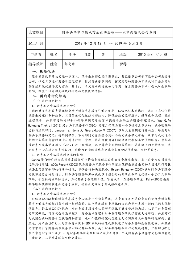 论文题目财务共享中心模式对企业的影响一以中兴通讯公司为例起止年月2018年12月12日~2019年6月2日申请者姓名李浩性别男班级2015会计(1)班指导教师姓名郭晓玲职称一、选题依据随着我国改革开放的进一步深入,很多企业都已经日渐壮大,甚至很多公司都下设分公司或者子公司。但是其在进行财务管理过程中,依然存在很多问题,探究更好的财务共享模式对于企业的财务管控来说就显得尤为重要。基于此,本文就中兴通讯公司为例,探索财务共享中心模式对企业的影响,希望可以为相关领域的研究和发展提供借鉴。二、国内外研究综述(一)国外研究评述1、财务共享中心模式理论研究国际财务共享服务管理协会对“财务共享服务”的定义是,以信息技术为依托,通过以流程化的操作来处理财务和业务,其目的是优化组织内部结构、降低企业的运营成本、规范业务流程、提升流程效率,并从市场的内部和外部等不同角度给客户提供专业的生产服务管理模式。YoQ,AoH,Huang T,etal(2012)提出共享服务中心(SSC)的建立必须要有一个在性质上独立的、业务明确的支持与组织部门。Janssen M,Joha A,Weerakkody V(2007)在用大量案例进行分析后,给出对财务共享服务的定义:将不同单位、不同部门的资源整合到一个新的业务单元中去,从中形成的这个新的业务单元负贡对母子公司进行统一管理,旨在为使用者们提供高效率和高价值的服务。普华永道财务及成本管理团队(2017)进一步明确,无论作为企业的组成单位还是法律上独立的实体,共享服务中心在确定服务协议后,才能为企业的区域或全球业务经营提供咨询、会计等服务。2、财务共享中心模式对企业的影响Dona等(1996)指出采用共享服务可以将业务经理从日常业务中抽离出来,集中力量为公司做长远的战略计划。ACCA Report(2002)认为财务共享服务中心的建立使得企业更全面和真实地取得跨区域甚至跨国家分部的信息和情况,以供分析和决策服务。Bryan Bergeron(2003)在对财务共享服务的优势进行分析后指出,财务共享服务的影响就是在于整合后的新的业务单元就像一个公开竞争的市场,管理机构被单独设立,其优势在于创造附加值、节省成本、改善服务质量。Fhy(2005)指出,共享服务使得吸收兼并更易于成功,使企业更专注于形成核心竞争力。(二)国内研究评述1、财务共享中心模式理论研究孙红卫(2016)指出财务共享服务中心就是一个业务单元,这个业务单元是由企业内部负责财务核算有关的业务的部门集中到一起形成的,这个单元通过市场化的方式为整个集团内部的不同主体提供服务。钟立岩(2017)认为,对财务共享服务中心的研究深化了财务管理的内涵,拓宽了财务管理的研究领域,对深化会计集中核算、财务集中管理和财务共享服务的认识有极大地帮助,并且可以为我国企业的财务管理提思路和借鉴,是一个值得研究的理论意义与实践意义并存的研究课题。张庆龙,周书圣(2017)认为贸易自由化和ERP系统的快速成熟促进了财务业务的数据化进程,并且在文章中指出了财务共享服务中心的优势和劣势。关于财务共享服务中心的发展趋势,汪振坤(2018)在文章总结了以下几点:一是财务共享将会从区域化逐步全球化:二是财务共享服务中的影响力会进一步扩大:三是共享服务可能会外包。2、财务共享中心模式对企业的影响高唯微(2016)认为财务共享中心模式的构建对于企业的发展来说极为重要,是企业能够做到财务一体化的重要路径。相关人员需要对此财务管理模式予以关注和重视,探索更好的路径对其予以优化,让其能够为公司的发展贡献更大的力量。管勇(2017)主要从财务共享中心的基本概念、运作机制、财务共享中心的优势及局限性方面展开对财务共享中心的论述,通过长虹公司财务共享中心的具体实例来分析财务共享中心的共享模式,通过分析研究了解财务共享中心的运作情况,并对目前的运作中的问题进行分析,提出优化改进措施。张延平(2017)财务共享服务中心是一种新的财务管理模式,它是通过一种有效的运作模式来解决大型集团公司财务职能建设中的重复投入和效率低下的弊端。总体来说,财务共享服务中心是通过对分布在不同地区的公司分支机枸的财务数据进行统一的整合,从而将公司内部财务工作流程简单化和标准化处理。三、研究内容(要求写到二级标题)1绪论1.1研究背景及意义1.2国内外研究现状1.3研究内容及框架2财务共享中心模式相关研究2.1财务共享中心的概念2.2财务共享中心理论基础3中兴通讯公司实施财务共享中心模式应用分析4.1中兴通讯公司基本情况4.2中兴通讯公司财务管理情况4中兴通讯公司实施财务共享中心模式中存在的问题4.1核心价值财务工作缺失4.2流程管理制度执行不力4.4信息系统整合程度不高5中兴通讯公司实施财务共享中心模式中存在的问题元分析5.1财务人员整体素质不高5.2财务人员对流程管理制度认同度不高5.3内部绩效考核执行力差5.4信息系统缺少优化整合6完善中兴通讯公司实施财务共享中心模式应用的对策6.1提高财务人员的整体素质6.2提高流程管理观念6.3强化流程管理制度的执行力6.4优化财务共享服务信息化平台四、研究的重点和难点重点:财务共享服务中心在中兴通讯公司具体实践中遇到了很多的问题,致使它没有办法充分发挥自己的特长,这都是需要进一步去探讨和解决的,这也是本