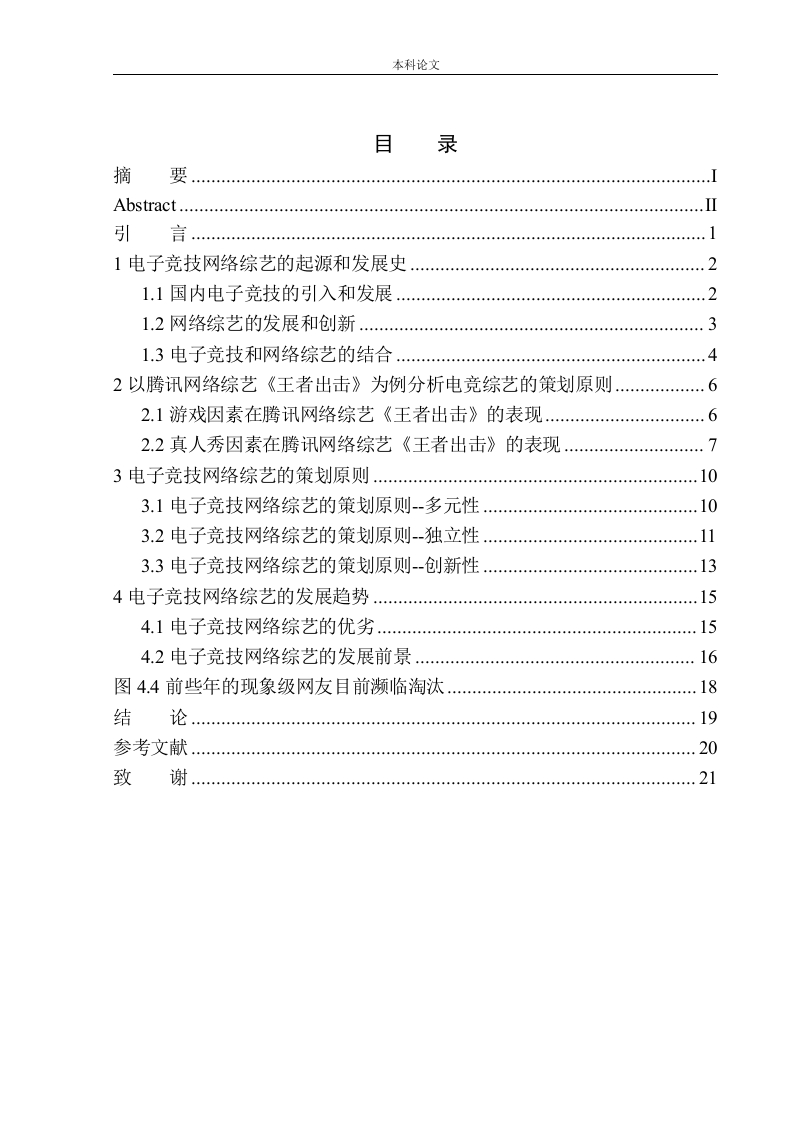本科论文目录摘要Abstract…引11电子竞技网络综艺的起源和发展史21.1国内电子竞技的引入和发展.…21.2网络综艺的发展和创新.…1.3电子竞技和网络综艺的结合2以腾讯网络综艺《王者出击》为例分析电竞综艺的策划原则2.1游戏因素在腾讯网络综艺《王者出击》的表现2.2真人秀因素在腾讯网络综艺《王者出击》的表现73电子竞技网络综艺的策划原则…3.1电子竞技网络综艺的策划原则-多元性103.2电子竞技网络综艺的策划原则-独立性3.3电子竞技网络综艺的策划原则-创新性.134电子竞技网络综艺的发展趋势.…154.1电子竞技网络综艺的优劣…154.2电子竞技网络综艺的发展前景…16图4.4前些年的现象级网友目前濒临淘汰18结论19参考文献20致谢21本科论文摘要随着电子竞技和网络综艺的发展,出现大量质量良莠不齐的电竞主题网络综艺,各大平台都有尝试,大家对文化娱乐需求越来越大,本课题拟以腾讯平台为例分析主流电竞网综的发展趋势和主要模式。深入探讨如何脱离传统综艺模式,探索新的策划原则。分析电子竞技与网络综艺的结合要遵循那些策划原则,由于电子竞技和网络综艺节目的爆发式发展,两者被很多的结合到了一起。两者结合的模式收到了很大的欢迎,有大量电子竞技爱好者观看了此种类型的网络综艺,并积极地进行了评价与反馈。各种电子竞技项目都推出了自己的综艺节目,而不再是处在一个看客的位置。这种合体给双方都带来了巨大的收益,带动了视频平台和电子竞技产业的发展。国内电子竞技于2016年井喷式发展,电子竞技衍生出大量周边产品和p,由于国内大多数知名电竞p皆有腾讯平台代理,所以腾讯平台率先对电子竞技网络综艺进行了尝试。采用跨行明星与电竞选手相结合的模式,吸引了大量游戏爱好者。之后与酷我音乐和中国青年报联合出品《电竞人物志》正式进入大众视野,使电竞综艺的受众不仅仅是电竞游戏爱好者这个小众的圈子,使其走向了大众。关键词:电子竞技:创新结合:表现方式:发展前景本科论文AbstractWith the development of E-sports and network variety,there are a largenumber of E-sports theme network variety with different quality.Each majorplatform has tried,and everyone needs more and more culture and entertainment.This topic plans to take Tencent platform as an example to analyze thedevelopment trend and main mode of mainstream E-sports network integration.The combination of the two has been very popular,a large number of e-sportsfans have watched this type of network variety show,and actively evaluated andfeedback.Various e-sports have launched their own variety show,rather than ina spectator position.This integration has brought huge benefits to both sides,and has driven the development of video platform and e-sports industry.Now,this mode is used for reference in a new E-sports variety show,which is called"beyond!Hero".It will be updated in Tencent video soon.Before that,the waysof E-sports variety show have been experimented many times,such as "comeon!Dota","the king strikes",etc.,but from the data and feedback,they are notvery satisfactory.No matter how strong the e-sports gene is,It seems that it'shard to stand up in the derivative content of variety show.Domestic E-sportsdeveloped in a blowout way in 2016,and E-sports derived a large number ofperipheral products and IP.Because most of the well-known E-sports IP inChina have Tencent platform agents,Tencent platform took the lead in tryingE-sports network variety.The combination of cross-border star and electroniccampaign hand has attracted a large number of game enthusiasts.After that,withthe joint production of KuWo music and China Youth Daily,"E-sports people'sChronicle"officially entered the public vision,making the audience of E-sportsvariety show not only the small circle of e-sports game enthusiasts,but also thepublicKeywords E-sports;combination of innovation;mode of expression;development prospect