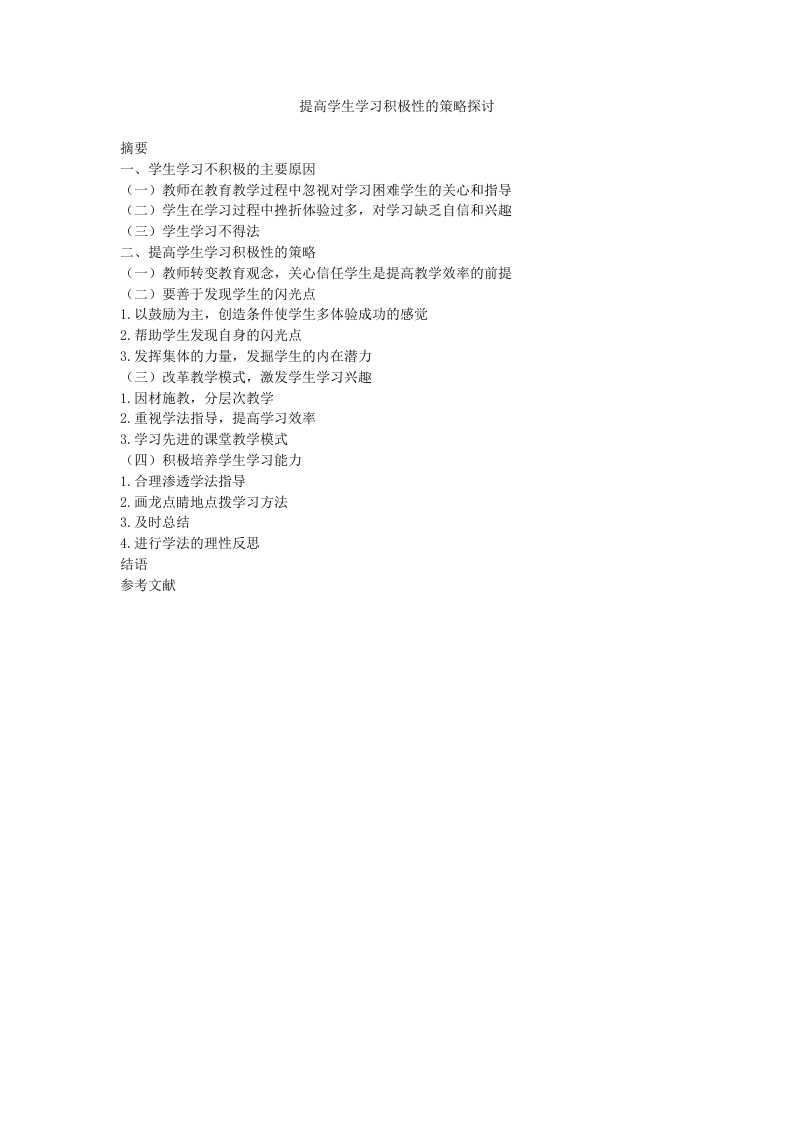 提高学生学习积极性的策略探讨摘要一、学生学习不积极的主要原因(一)教师在教育教学过程中忽视对学习困难学生的关心和指导(二)学生在学习过程中挫折体验过多,对学习缺乏自信和兴趣(三)学生学习不得法二、提高学生学习积极性的策略(一)教师转变教育观念,关心信任学生是提高教学效率的前提(二)要善于发现学生的闪光点1.以鼓励为主,创造条件使学生多体验成功的感觉2.帮助学生发现自身的闪光点3.发挥集体的力量,发掘学生的内在潜力(三)改革教学模式,激发学生学习兴趣1.因材施教,分层次教学2.重视学法指导,提高学习效率3.学习先进的课堂教学模式(四)积极培养学生学习能力1.合理渗透学法指导2.画龙点睛地点拨学习方法3.及时总结4.进行学法的理性反思结语参考文献