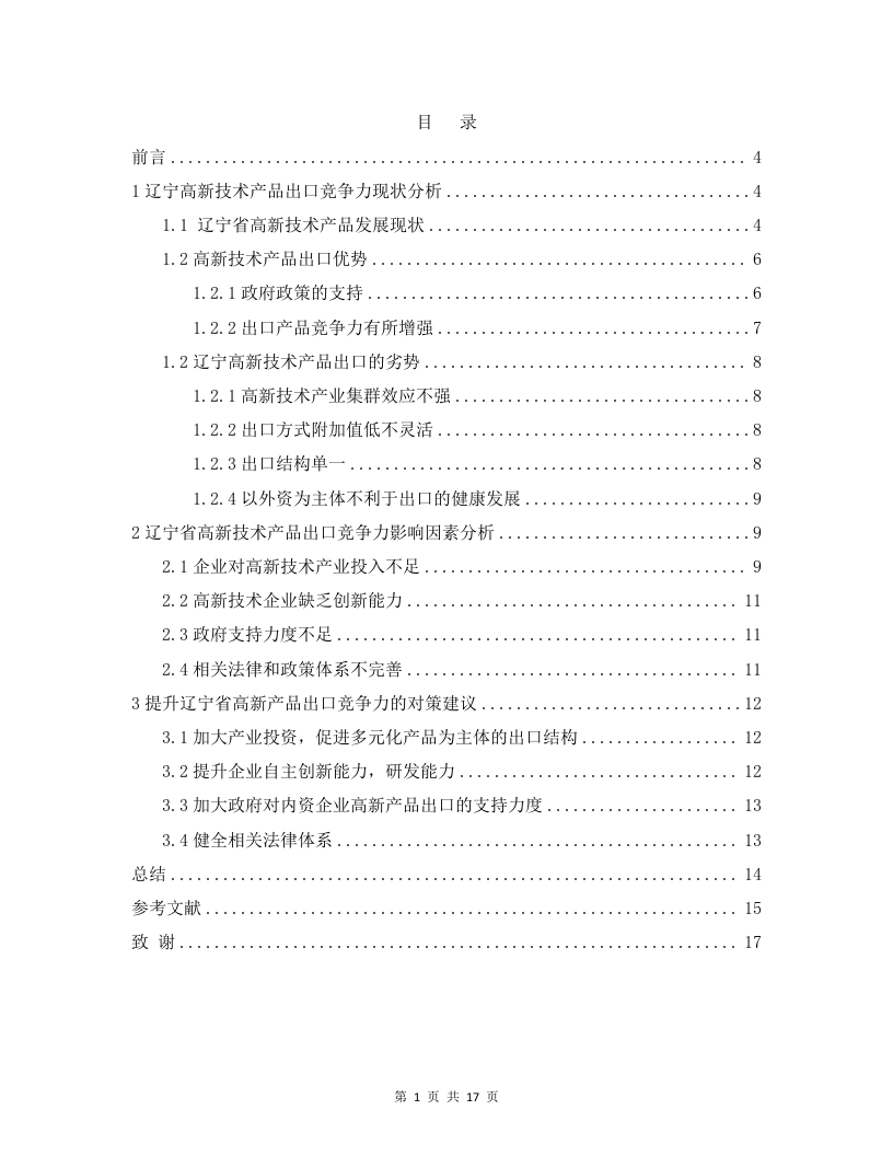 前言…1辽宁高新技术产品出口竞争力现状分析..1.1辽宁省高新技术产品发展现状..1.2高新技术产品出口优势...61.2.2出口产品竞争力有所增强...1.2辽宁高新技术产品出口的劣势...81.2.1高新技术产业集群效应不强..1.2.2出口方式附加值低不灵活....1.2.4以外资为主体不利于出口的健康发展2辽宁省高新技术产品出口竞争力影响因素分析2.1企业对高新技术产业投入不足....92.2高新技术企业缺乏创新能力....112.3政府支持力度不足…112.4相关法律和政策体系不完善..3提升辽宁省高新产品出口竞争力的对策建议...·3.1加大产业投资,促进多元化产品为主体的出口结构....123.3加大政府对内资企业高新产品出口的支持力度.....133.4健全相关法律体系....13141517第1页共17页提升辽宁高新技术产品出口竞争力的对策分析摘要在知识经济时代,高新技术产品的出口反映了一个国家或地区的经济实力和国际竞争力。为了赶上世界先进水平,完善辽宁省产业结构,有必要提高辽宁省高新技术产品出口的国际竞争力。因此,探讨如何提高辽宁省高新技术产业的出口竞争力具有重要意义。本文从辽宁省高新技术产品出口现状出发,分析了辽宁省高新技术产业出口竞争力的优缺点。最后,从加大产业投资、提升企业自主创新、加大政府支持力度以及健全法律体系四个方面加强辽宁省高新技术产业出口竞争力的对策。[关键词]高新技术产品:高新技术产业:出口竞争力第2页共17页AbstractIn the era of knowledge economy,the export of high-tech products reflects a countryor region's economic strength and international competitiveness.In order to catch up withthe world advanced level,improve the industrial structure of Liaoning Province,LiaoningProvince,it is necessary to improve the international competitiveness of high-techexports.Therefore,it is of great significance to discuss how to improve the exportcompetitiveness of high-tech industry in Liaoning Province.This paper analyzes theadvantages and disadvantages of the high -tech industry export competitiveness ofLiaoning Province from the present situation of the export of high -tech products inLiaoning Province.Finally,the countermeasures of strengthening the exportcompetitiveness of high tech industry in Liaoning province are put forward from fouraspects:enlarging industry investment,promoting enterprise independent innovation,strengthening government support and perfecting legal system.Key words:High-tech products;high-tech industries;export competitiveness第3页共17页