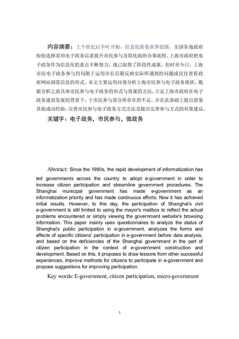 内容摘要:上个世纪后半叶开始,信息化席卷世界范围,全国各地政府纷纷选择采用电子政务以求提升市民参与及简化政府办事流程。上海市政府把电子政务作为信息化的重点不断努力,现已取得了阶段性成果。但时至今日,上海市民电子政务参与仍局限于运用市长信箱反映实际所遇到的问题或仅仅查看政府网站浏览信息的形式。本文主要运用问卷分析上海市民参与电子政务现状,数据分析之前具体市民参与电子政务的形式与效果的方法,立足上海市政府在电子政务建设发展的背景下,于市民参与部分所存在的不足,并在此基础上提出借鉴其他成功经验,完善市民参与电子政务方式方法及提出完善参与方式的对策建议。关键字:电子政务,市民参与,微政务Abstract:Since the 1990s,the rapid development of informatization hasled governments across the country to adopt e-government in order toincrease citizen participation and streamline government procedures.TheShanghai municipal government has made e-government as aninformatization priority and has made continuous efforts.Now it has achievedinitial results.However,to this day,the participation of Shanghai's civile-government is still limited to using the mayor's mailbox to reflect the actualproblems encountered or simply viewing the government website's browsinginformation.This paper mainly uses questionnaires to analyze the status ofShanghai's public participation in e-government,analyzes the forms andeffects of specific citizens'participation in e-government before data analysis,and based on the deficiencies of the Shanghai government in the part ofcitizen participation in the context of e-government construction anddevelopment.Based on this,it proposes to draw lessons from other successfulexperiences,improve methods for citizens to participate in e-government andpropose suggestions for improving participation.Key words:E-government,citizen participation,micro-government目录…3(一)研究背景……3(二)上海市电子政务的发展与现状…3(三)选题目的与意义…3二、市民参与电子政务具体方式…(一)调查问卷…(二)市民参与电子政务具体方式…9…92.政府信箱…93.政务微博4.政务微信……14三、上海市政府电子政务中市民参与现状问题分析…17四、上海市政府电子政务中市民参与的对策优化…20五、结论…22致谢…24参考文献……25附录…26上海市政府电子政务中市民参与现状研究一、绪论(一)研究背景电子政务的发展是顺应了时代发展的需求而产生的,因此可以说政务电子化、信息化成为政府与时俱进调整自身职能的必然选择。随着时间不断推移,政府对电子信息技术的运用逐渐增多,这也引起了社会各界的广泛关注。所谓电子政务,其实就是将政务的电子化、信息化,是政府充分利用现代信息技术的结果,在此基础上实现政府工作和信息技术的有效结合,为政府管理和履行职能提供全新的手段,那就是网络。在网路的作用下,政府开展工作不再受限于时间和空间等客观条件,而且还可以促进政府服务质量的提高。(二)上海市电子政务现状从上个世纪世纪90年代开始,上海市就开始引进电子政务系统,这在全国范围内领先于其他省市,发展至今,已经初见成效。尤其是“九五”期间技术设施整体水平得到质的提高以后,上海市电子政府系统的发展有了更先进的基础措施,发展速度显著加快。截止到目前,上海市从县级开始所有部门都有了自己的网站,网站的中总数已经达到143个,2市政府委办局的有51个区县政府网站则有19个,剩下的则是属于中央政府部门和其他省区市。在这些网站当中,对于政府部门的办事指南都有相应的指导,具体服务包括下载表格、网上投诉等。3上海市政府“中国上海”门户网站,创造了全新的参政议政的手段,在保障政府工作透明度兼顾了公民知情权。另一方面,政府增设了在线服务这一举措,为民众办理相关事务提供了很大的方便。如市工商局的“网络版企业证照审验申请”、市人事局的“紧缺人才引进申请”等都能够在线办理,市民只需要使用社保卡,就可以轻松进入到社会保障和市民服务信息系统,在系统中完成就医办理等多项业务。第三,重新组织业务流程,为政府行政效率的提高提高支持。距今为止,就上海市的政府部门来说,没有在网络上建立办公自动化系统部门总数不到20%。而且,现在促进市政府所有部门、区县政府及有关单位实现专用计算机1曾昭慧.我国电子政务现状及发展.法治与社会,201531:153-1542范希平.上海电子政务建设的实践与思考).中国信息导报,20034):2931张虹.电子政务与城市竞争力研究D).贵州大学.2008