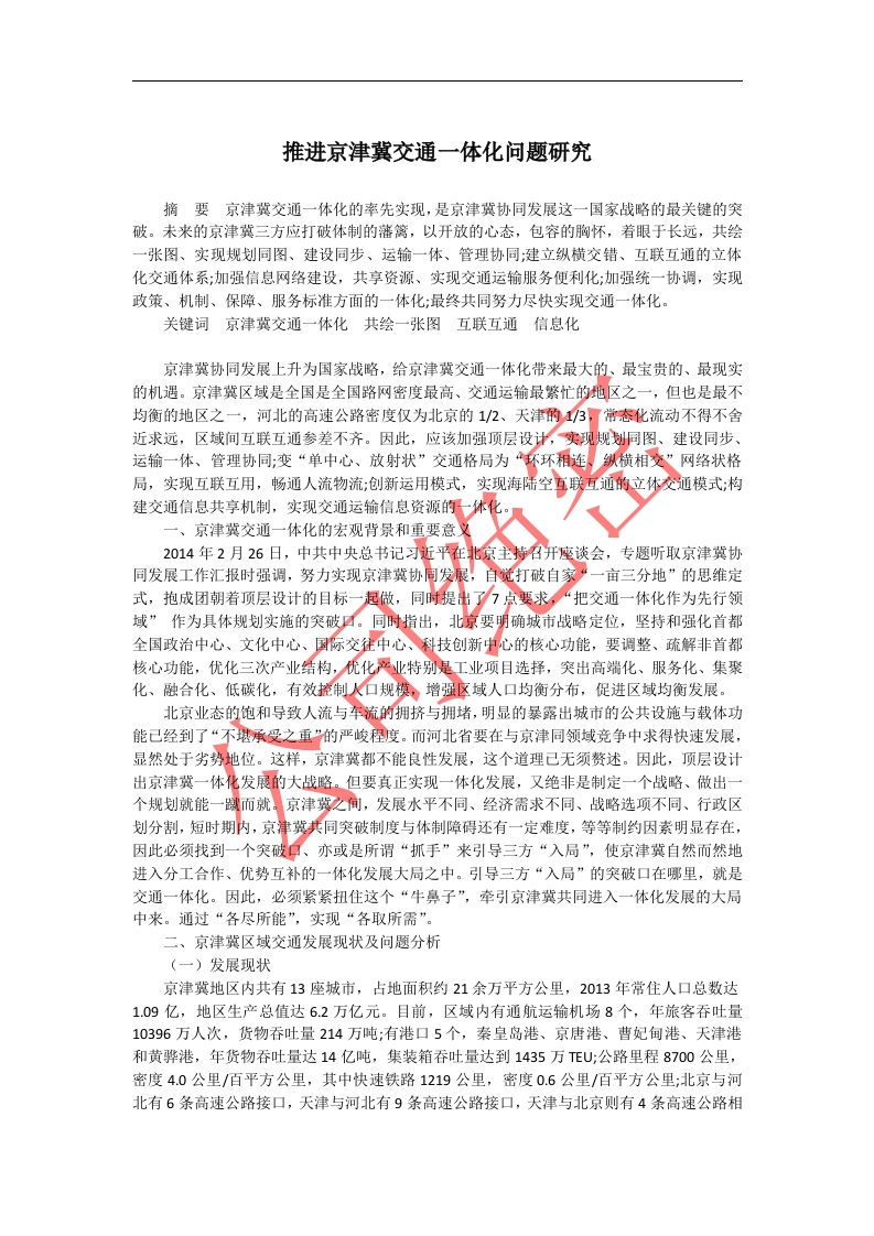 推进京津冀交通一体化问题研究摘要京津冀交通一体化的率先实现,是京津冀协同发展这一国家战略的最关键的突破。未来的京津冀三方应打破体制的藩篱,以开放的心态,包容的胸怀,着眼于长远,共绘一张图、实现规划同图、建设同步、运输一体、管理协同:建立纵横交错、互联互通的立体化交通体系:加强信息网络建设,共享资源、实现交通运输服务便利化:加强统一协调,实现政策、机制、保障、服务标准方面的一体化:最终共同努力尽快实现交通一体化。关键词京津冀交通一体化共绘一张图互联互通信息化京津冀协同发展上升为国家战略,给京津冀交通一体化带来最大的、最宝贵的、最现实的机遇。京津冀区域是全国是全国路网密度最高、交通运输最繁忙的地区之一,但也是最不均衡的地区之一,河北的高速公路密度仅为北京的1/2、天津的13,常态化流动不得不舍近求远,区域间互联互通参差不齐。因此,应该加强顶层设计,实现规划同图、建设同步、运输一体、管理协同:变“单中心、放射状”交通格局为“环环相纵横相交”网络状格局,实现互联互用,畅通人流物流:创新运用摸式,实现海陆空通的立体交通模式:构建交通信息共享机制,实现交通运输信息资源的一体一、京津冀交通一体化的宏观背景和重要意2014年2月26日,中共中央总书记习近平在主特召开座谈会,专题听取京津冀协同发展工作汇报时强调,努力实现京津冀协觉打破自家一亩三分地”的思维定式,抱成团朝着顶层设计的目标一起做,同时提出京要求,“把交通一体化作为先行领域”作为具体规划实施的突破口。同时指出,北京要明确城市战略定位,坚持和强化首都全国政治中心、文化中心、国际交往中心、科技创新中心的核心功能,要调整、疏解非首都核心功能,优化三次产业结构,优化严业特别是工业项目选择,突出高端化、服务化、集聚化、融合化、低碳化,有效制人口规模,增强区域人口均衡分布,促进区域均衡发展。北京业态的饱和导致人流与车流的拥挤与拥堵,明显的暴露出城市的公共设施与载体功能已经到了“不堪承受之重”的严峻程度。而河北省要在与京津同领域竞争中求得快速发展,显然处于劣势地位。这样,京津冀都不能良性发展,这个道理已无须赘述。因此,顶层设计出京津冀一体化发展的大战略。但要真正实现一体化发展,又绝非是制定一个战略、做出一京津冀之间,发展水平不同、经济需求不同、战略选项不同、行政区划分割,短时期内,京津冀共同突破制度与体制障碍还有一定难度,等等制约因素明显存在,因此必须找到一个突破口、亦或是所谓“抓手”来引导三方“入局”,使京津冀自然而然地进入分工合作、优势互补的一体化发展大局之中。引导三方“入局”的突破口在哪里,就是交通一体化。因此,必须紧紧扭住这个“牛鼻子”,牵引京津冀共同进入一体化发展的大局中来。通过“各尽所能”,实现“各取所需”。二、京津冀区域交通发展现状及问题分析(一)发展现状京津冀地区内共有13座城市,占地面积约21余万平方公里,2013年常住人口总数达1.09亿,地区生产总值达6.2万亿元。目前,区域内有通航运输机场8个,年旅客吞吐量10396万人次,货物吞吐量214万吨:有港口5个,秦皇岛港、京唐港、曹妃甸港、天津港和黄骅港,年货物吞吐量达14亿吨,集装箱吞吐量达到1435万TEU:公路里程8700公里,密度4.0公里/佰平方公里,其中快速铁路1219公里,密度0.6公里/佰平方公里:北京与河北有6条高速公路接口,天津与河北有9条高速公路接口,天津与北京则有4条高速公路相连:区域内有京津城际高铁、京沪高铁、京冀高铁、津秦高铁四条高铁。这些交通网络的建设极大的带动了区域的人流、物流、信息流、技术流、资金流的发展,满足了大部分群众的需求,促进了社会经济的快速发展。(二)存在的主要问题分析1空间距离近,时间距离长,轨道交通不畅。“东西不畅南北不通”,是河北省内交通的写照,甚至有人说河北的交通是“亲京津远亲戚”。唐山则是典型代表一一到北京、天津的客运班次每天有几十趟,而到张家口、保定、廊坊、邢台的车次却是个位数,唐山到承德至今没有通火车,这种局面要到张唐铁路建成才会改变。河北没有自己的公司绝密