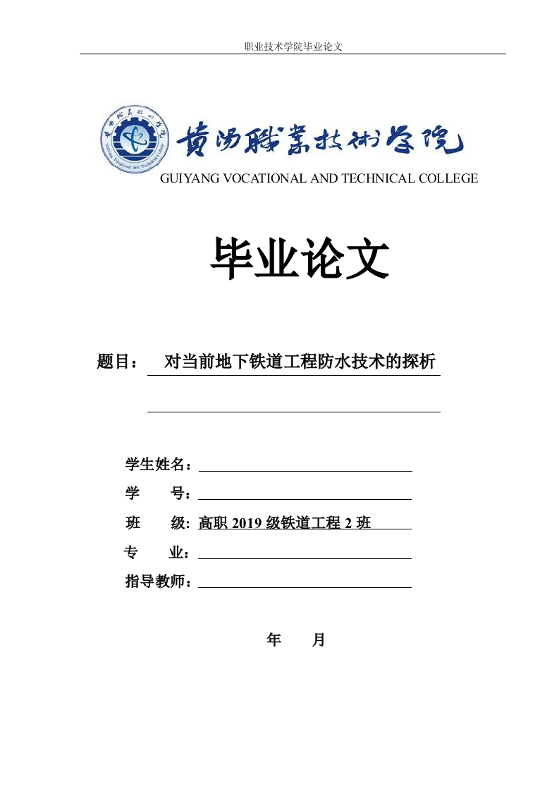 职业技术学院毕业论文GUIYANG VOCATIONAL AND TECHNICAL COLLEGE毕业论文题目:对当前地下铁道工程防水技术的探析学生姓名:学班级:高职2019级铁道工程2班专业:指导教师:年月职业技术学院毕业论文对当前地下铁道工程防水技术的探析摘要地下铁道受地下水的影响,随着城市化进程的加快,越来越多的铁路通道修建在地底,这使地下工程的防水技术越发重要。防水问题不仅影响工程本身的使用寿命和质量,还影响到整个地下工程的运行。可以客观的说,地下铁路工程防水技术直接决定了地下工程的使用年限和使用效果,要系统的从工程个个方面采取防水措施,现阶段的地下铁路防水技术来言,一方面克制自然环境的威胁,另一方面以暗挖隧道、明挖结构为例,详细阐述围岩防水、结构自防水、附加防水层以及排水系统等防水技术,指出对于具体工程,应根据基本特征选择不同的防水技术。关键词:地下铁路:工程防水技术:地下水:隧道职业技术学院毕业论文目录11.1研究背景....1.2研究目的与意义1.3研究方法.…12地下铁道工程防水技术概述.....2.1地铁施工过程中防水工程的重要性..22.1.1防水工程关乎整个地铁施工建设的成败.·22.1.2防水工程事关整个地铁是否能正常运营...........22.1.3良好的防水工程能够有效降低运营和维护的成本...·22.2地下铁道工程的防水技术...2.2.1围岩防水技术..2.2.2结构自防水技术.....32.2.3辅助防水层的设立技术32.2.4永久性排水系统施工技术32.2.5施工缝隙的防水施工技术4454.1初期柔性支护..54.2暗挖隧道二次衬砌5附加防水层.65.1防水卷材的施工...75.2传统防水卷材的缺陷777接缝处理和施工缝的处理881011