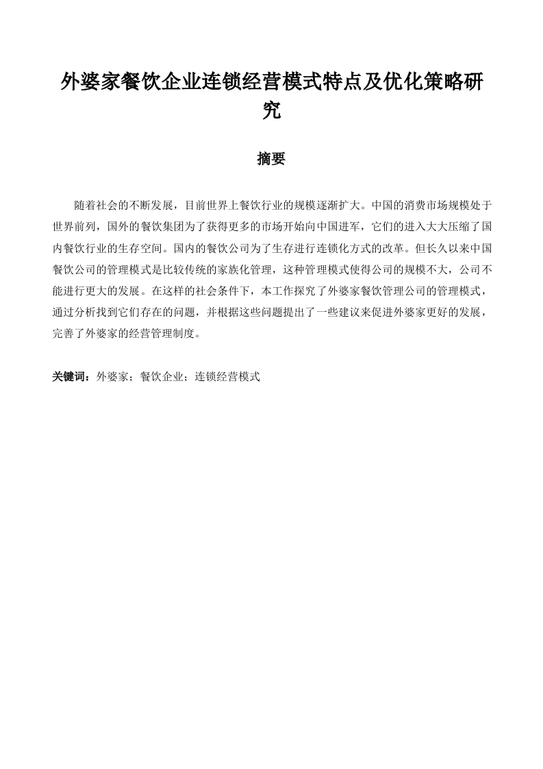 外婆家餐饮企业连锁经营模式特点及优化策略研究摘要随着社会的不断发展,目前世界上餐饮行业的规模逐渐扩大。中国的消费市场规模处于世界前列,国外的餐饮集团为了获得更多的市场开始向中国进军,它们的进入大大压缩了国内餐饮行业的生存空间。国内的餐饮公司为了生存进行连锁化方式的改革。但长久以来中国餐饮公司的管理模式是比较传统的家族化管理,这种管理模式使得公司的规模不大,公司不能进行更大的发展。在这样的社会条件下,本工作探究了外婆家餐饮管理公司的管理模式,通过分析找到它们存在的问题,并根据这些问题提出了一些建议来促进外婆家更好的发展,完普了外婆家的经营管理制度。关键词:外婆家:餐饮企业:连锁经营模式目录二、连锁经营模式相关概念.......................................(一)连锁经营的定义(二)经营模式概念.三、外婆家餐饮企业连锁经营模式现状及特点分析2(一)外婆家餐饮企业基本情况(二)外婆家经营管理现状2(三)外婆家餐饮企业连锁经营模式存在问题21.原材料的选购难以实现标准化2.烹饪技术标准化难题33.服务与环境标准化程度低…34.品牌意识落后…3四、外婆家餐饮企业连锁经营模式优化建议3(一)构建外婆家标准化连锁经营体系31.标准严格的选材、配送…2.标准化的烹饪设备和工艺3.标准化的菜品搭配和调制方法…4.标准化的菜品研发5.标准化的服务和就餐环境(二)完善外婆家连锁经营保障制度1.创新理念驱动标准化连锁经营2.确立菜品的流行指数…3.建立适当的标准成本率五、结论6参考文献7致谢…一、绪论本世纪以来,人们的社会水平得到长足的发展,物质生活有了极大的提高,这使得人们更加关注餐饮行业,世界上餐饮需求的市场规模也在逐渐增加。在社会利益的驱动下,餐饮行业的规模逐渐扩大,相关的生产技术也逐渐完善,餐饮行业进入发展的快车道。此外,中国的经济正在快速发展,发生过的经济危机造成的影响也在逐渐消失。这些社会背景使得餐饮行业能够有很大的发展空间,我国餐饮也能够进行新一轮发展。但值得注意的是,餐饮市场的规模不断增大,进入这一市场的公司也越来越多,这一行业的竞争也越来越大。在全球通货膨胀的背景下,餐饮行业的原材料成本不断增加,这压缩了行业的利润。随着时间的发展,餐饮行业的竞争愈发激烈。对比于传统的生产方式来说,公司连锁化不仅使得餐饮公司获得规模化的效益,同时还让人们的管理观念与思维方式发生了改变。人们不再局限于传统的经营模式中,转而探索新的经营方式从而促进餐饮行业的进一步发展。新的餐饮行业经营模式使得它们更加适应当代的社会背景,让省会节变得更快。但是这种连锁经营的方式应该怎样进一步完善是值得人们关注的问题。这种连锁经营模式的特点是亟需人们总结出来的。基于此,研究者将外婆家作为例子来进行研究,详细探究连锁经营的特点以及进一步发展连锁经营的方法。二、连锁经营模式相关概念(一)连锁经营的定义世界上第一家连锁经营的公司1859年诞生在美国纽约,在当时就启用了统的出资和管理,在美国各地开设茶叶连锁店。在此之前,传统经营模式多以个体门店的独立经营为主,采购和销售、收银与核算都独立操作,不存在企业间分工也没有门店间统一的店面形象、服务标准、经营制度。连锁经营则是在统一的企业主和公司管理层下,执行统一的标准,包括门店形象、门店名称、产品、服务标准,以及统一的制度员工规范、宣传规范、管理规范,来运作多个门店。通过实施专业化的分工和协作,有效提高企业经营效率和规模竞争力。而比较常见的经营模式是单体经营,与之相对的就是连锁经营。这是一种依靠公司品牌支撑起来的经营模式。这一种经营模式的重点在于公司的品牌效应。只有将公司的品牌树立起来,建立比较出名的品牌时才能够进行这种经营模式。连锁经营的运营模式偏向于集团化,这种经营模式的管理方式是集团化管理。在这种经营模式下,处于全国不同地区的门店都有着统一的管理方式,他们的商品价格也是一样的。连锁经营模式的定义普遍被人们接受的一种说法是,各个门店在总公司的战略下给他们的客户提供相同的服务和具有相同产品的价格。(二)经营模式概念1