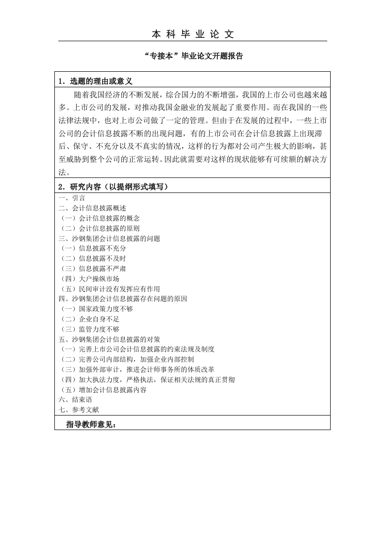 本科毕业论文“专接本”毕业论文开题报告1.选题的理由或意义随着我国经济的不断发展,综合国力的不断增强,我国的上市公司也越来越多。上市公司的发展,对推动我国金融业的发展起了重要作用。而在我国的一些法律法规中,也对上市公司做了一定的管理。但由于在发展的过程中,一些上市公司的会计信息披露不断的出现问题,有的上市公司在会计信息披露上出现滞后、保守、不充分以及不真实的情况,这样的行为都对公司产生极大的影响,甚至威胁到整个公司的正常运转。因此就需要对这样的现状能够有可续额的解决方法。2.研究内容(以提纲形式填写)一、引言二、会计信息披露概述(一)会计信息披露的概念(二)会计信息披露的原则三、沙钢集团会计信息披露的问题(一)信息披露不充分(二)信总披露不及时(三)信息披露不严肃(四)大户操纵市场(五)民间审计没有发挥应有作用四、沙钢集团会计信总披露存在问题的原因(一)国家政策力度不够(二)企业自身不足(三)监管力度不够五、沙钢集团会计信息披露的对策(一)完善上市公司会计信息披露的约束法规及制度(二)完善公司内部结构,加强企业内部控制(三)加强外部审计,推进会计师事务所的体质改革(四)加大执法力度,严格执法,保证相关法规的真正贯彻(五)增加会计信息披露内容六、结束语七、参考文献指导教师意见:本科毕业论文指导教师:年月日南京财经大学会计学院“专接本”毕业论文开题报告题目:我国上市公司会计信息披露问题研究一以上市公司沙钢集团为例学生姓名:惠可馨学号:054317232054院(系):经济管理系专会计指导教师:郭静娟2019年03月02日本科毕业论文目录(一)会计信息披露概念1(二)会计信息披露的原则.…1.客观性原则…12.定量定性原则.…23.自愿与强行相结合的原则2二、沙钢集团会计信息披露的问题..1.研发信息不充分.…2.人力资源会计信息披露不充分3.对偿债能力披露不充分(二)信息披露不及时,3(三)信息披露不严肃…(四)大户操纵市场,3(五)民间审计没有发挥应有作用.…三、沙钢集团会计信息披露存在问题的原因4(一)国家政策力度不够.…4(二)企业自身不足…(三)监管力度不够.…(一)完善上市公司会计信息披露的约束法规及制度…5(二)完善公司内部结构,加强企业内部控制…5