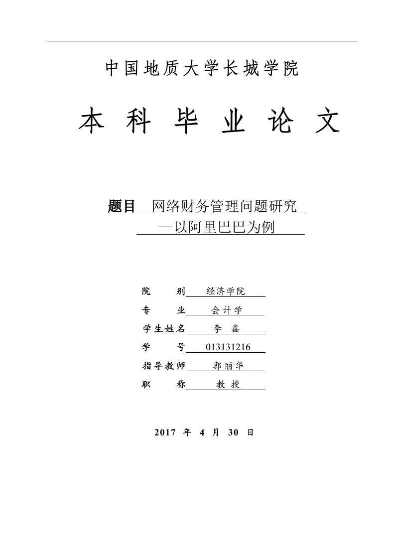 中国地质大学长城学院本科毕业论文题目网络财务管理问题研究一以阿里巴巴为例院别经济学院专业会计学学生姓名李鑫学号013131216指导教师郭丽华职称2017年4月30日本科毕业生毕业论文(设计)诚信承诺书毕业论文网络财务管理问题研究一一以阿里巴巴为例(设计)题目学生姓名李鑫专业会计学学号013131216指导老师郭丽华职称教授所在系别13级经济系诚信承诺本人慎重承诺和声明:我承诺在毕业论文(设计)活动中遵守学校有关规定,恪守学术规范,在本人的毕业论文中不剽窃、抄袭他人的学术观点、思想和成果,不篡改研究数据,如有违规行为发生,我愿承担一切责任,接受学校的处理。学生(签名):李鑫2017年4月30日中国地质大学长城学院毕业论文任务书学生姓名李鑫学号013131216专业班级会计学十二班指导教师郭丽华职称教授单位河北农业大学毕业论文网络财务管理问题研究一一以阿里巴巴为例毕业论文主要内容和要求:主要内容:针对当下企业财务管理所面临的问题并结合阿里巴巴的管理模式,提出一些技术手段和管理制度以改善当下网络环境下的财务管理所面临的问题,以期创新财务管理模式以适应电子商务新环境。要求:论文撰写要求思路清晰、内容充实、论点明确,论据充分,论证严密,语言通顺。撰写论文前应首先阅读相关的研究资料,掌握学术前沿动态,对相关理论著作要很好的把握,提高理论水平及思想深度。根据开题报告和老师提出的意见对论文提纲进行修改,确定大纲后认真撰写毕业论文。撰写论文结束后要根据老师的修改意见,认真反复的修改论文,并按照要求参加毕业论文的答辩,严格按照论文进度安排进行论文的写作。论文的格式、字数等撰写方面的要求参照《中国地质大学长城学院毕业论文(设计)撰写规范》。毕业论文主要参考资料:山陈晓红中小企业融资M.北京:中国金融出版社,2001.[2]朱尧.浅析网络环境下的企业财务管理转型.河南师范大学学报:哲学社会科学版,2013,3:8890.)李燕华.浅谈网络环境下的网络财务管理).文摘版:经济管理,2015,7):250-250.4吴大军.管理会计学(第三版M.东北财经大学出版社,2013.)]荆新,王化成,刘俊彦.财务管理学(第七版)M.中国人民大学出版社,2015.[6朱绪蜡.网络环境下中小企业财务管理模式创新反思).经济管理(文摘版),2016,(2:155-255.门)刘东波.网络环境下的企业财务管理研究.经济研究导刊,2013,23):226-227.⑧]马海亮.基于网络环境的企业集团财务管理创新探析.集团经济研究,2007,09S)33-34.9]周迎春加强企业财务管理及会计核算的对策探讨.产业与科技论坛2011.01.0710]徐章楠.网络环境下中小企业财务管理模式的创新思考.2016.06[11]Stephen a.Ross,[the]Randolph w.west field,[the]Bradford d.Jordan.Corporate finance (press edition)[M].Mechanicalindustry publishing house.2015.[12]Richard a.bradely,[the]Stuart c.myers,[the]franklin.Ellen.The company's financial principle [M].Mechanical industry