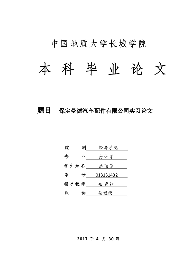 中国地质大学长城学院本科毕业论文题目保定曼德汽车配件有限公司实习论文院别经济学院专业会计学学生姓名张丽芬学号013131432指导教师安存红职称副教授2017年4月30日本科毕业生毕业论文(设计)诚信承诺书毕业论文保定曼德汽车配件有限公司实习论文(设计)题目学生姓名张丽芬专业会计学学号013131432指导老师安存红职称副教授所在系别经济学院诚信承诺本人慎重承诺和声明:我承诺在毕业论文(设计)活动中遵守学校有关规定,恪守学术规范,在本人的毕业论文中不剽窃、抄袭他人的学术观点、思想和成果,不篡改研究数据,如有违规行为发生,我愿承担一切责任,接受学校的处理。学生(签名):年月日保定曼德汽车配件有限公司实习论文摘要实习,即在实践中学习。在经过一段时间的学习之后,作为大学生的我们将要走出大学校门,踏入社会。而实习,作为校园到社会的桥梁,对我们来说,至关重要。在当今严峻的就业形势下,大学生只有在精通专业知识的同时,还需要积累社会经验,在社会上多加历练,不断地进行反思,从中汲取经验和教训,不断提高自己分析和解决问题的能力,人际交往的能力等,才能在激烈的竞争环境下占取优势,这也正是我们这些大学生现在所缺少却尤为重要的东西。对于我们大学生而言,初步踏入社会,在很多方面都不能很快适应,而这次实习不仅可以初步感受企业文化氛围,了解企业管理模式,而且给了我体验工作,提高沟通能力和人际交往能力的机会,使我尽早地适应社会。并且由于工作性质,可以不断增强了我的毅力,培养了我的耐心和细心,逐渐改变了我做事鲁莽、思考不周的恶习,让我以后遇事变得更加冷静、沉着稳重。本次实习,虽然与我所学专业毫不相关,但我认为任何一项工作都有值得我们学习的地方,都存在着它的价值,我们只有在不同的职业实践中,体验不同的职业生活,才会真正找到自己感兴趣并且适合自己的行业,从而更好地规划我们的职业生涯,为将来真正就业打下基础。关键词:企业文化;人际交往:社会实践:终身学习ABSTRACTPractice,that is learning in practice.After a period of study,as college students,we will go outof college and step into society.The practice,as a bridge to the campus to the community,for us,it is essential.Under the severe employment situation,Only when the students master theprofessional knowledge,also need to roll up social ecperience,need more experience in thecommunity,constant reflection,learn from experience and lessons,continuously improveanalytical and problem solving skills,interpersonal skills,etc,ability to dominate in the fierceenvironment,This is precisely what we lack of college students is particularly important.For ourcollege students,step into society preliminarily,in many ways can not adapt quickly,and thispractice can not only feel the corporate culture,understanding enterprise management model,butalso it gives me the opportunity to experience work,improve the communication skills andinterpersonal interaction skills,enable me to adapt to society as soon as possible.And because ofthe nature of work,can continue to enhance my perseverance,cultivate my patience andcarefulness,gradually changed the way I do things recklessly,not thinking,Let me later becomemore calm and steady.Although this practice has nothing to do with my major,I think any job hassomething to learn from,and has the value of existence.Only different practice,experiencedifferent careers,can we find interesting and suitable job,in order to better plan our career,lay thefoundation for future employment.Key words:Corporate Culture;Interpersonal Interaction;Social Practice;Lifelong Learning