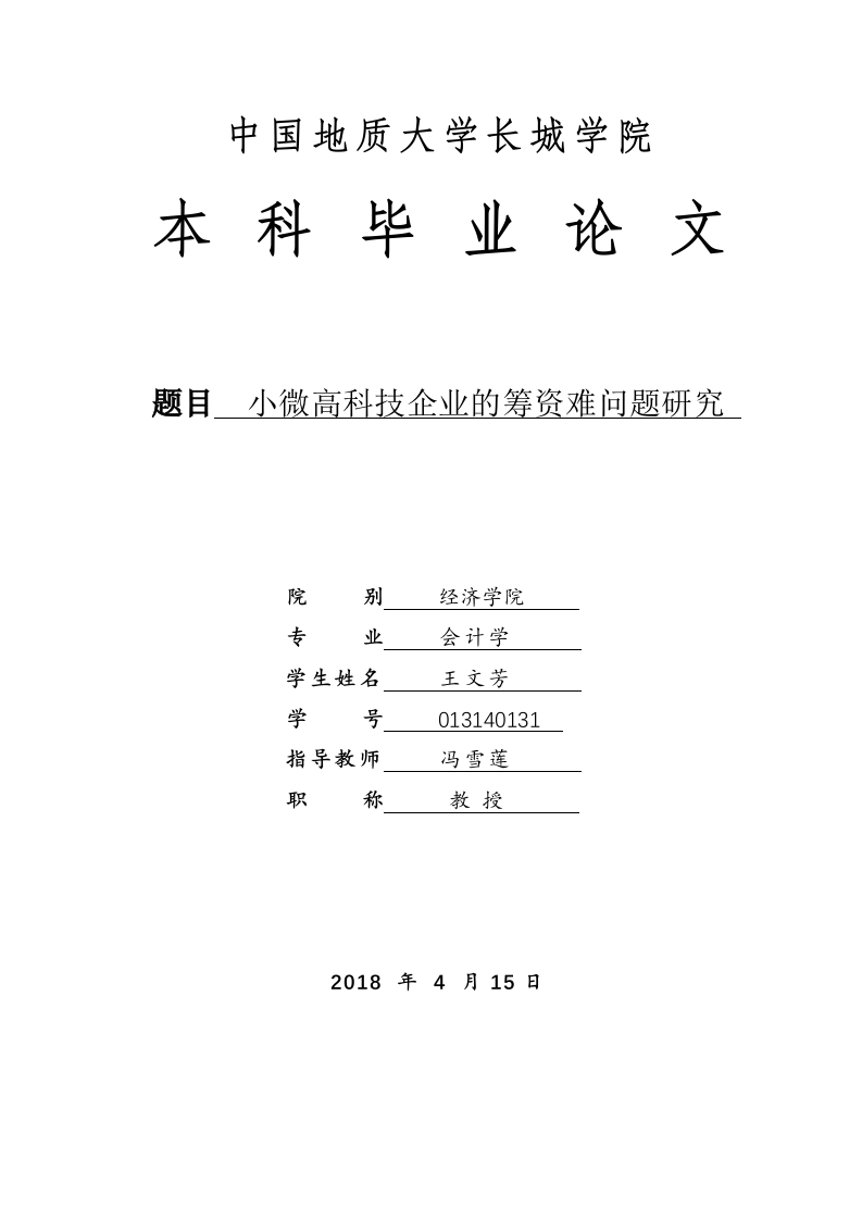 中国地质大学长城学院本科毕业论文题目小微高科技企业的筹资难问题研究院别经济学院专业会计学学生姓名王文芳学号013140131指导教师冯雪莲职称2018年4月15日本科毕业生毕业论文(设计)诚信承诺书毕业论文(设计)题目小微高科技企业的筹资难问题研究学生姓名王文芳专业会计学学号013140131指导老师冯雪莲职称教授所在院别经济学院诚信承诺本人慎重承诺和声明:我承诺在毕业论文(设计)活动中遵守学校有关规定,恪守学术规范,在本人的毕业论文中不剽窃、抄袭他人的学术观点、思想和成果,不篡改研究数据,如有违规行为发生,我愿承担一切责任,接受学校的处理。学生(签名):王文芳年月中国地质大学长城学院毕业论文任务书学生姓名王文芳号013140131专业班级会计学一班指导教师冯雪莲职称单位中国地质大学长城学院毕业论文题目小微高科技企业的筹资难问题研究毕业论文主要内容和要求:主要内容:本文主要分析小微高科技企业筹资困难问题,首先对筹筹资的概念进行概述,从小微高科技企业筹资难的原因、筹资的模式、筹资的机制等方面进行分析,剖析小微高科技企业筹资存在筹资成本过高、筹资渠道不通畅、小微企业自身缺陷影响、筹资体制不健全等问题,最后提出合理规划筹资成本、拓宽筹资渠道、树立良好的筹资信誉、完善小微企业筹资体制建设等防范措施。要求:论文撰写要求思路清晰、内容充实、论点明确,论证严密,语言通顺。撰写论文前应首先阅读相关的研究资料,掌握学术前沿动态,提高理论水平及思想深度。根据开题报告和老师提出的意见对论文提纲进行修改,确定大纲后认真撰写毕业论文。撰写论文结束后要根据老师的修改意见,认真反复的修改论文,并按照要求参加毕业论文的答辩,严格按照论文进度安排进行论文的写作。论文的格式、字数等撰写方面的要求参照《中国地质大学长城学院毕业论文(设计)撰写规范》。毕业论文主要参考资料:[1]范小雯.科技型小微企业融资的财务治理改善[J刀.经济研究参考,2015,(07):82-87.[2]赵颗,蔡俊英.高科技中小企业众筹筹资模式探究[J刀.科技管理研究,2016,36(15):122-127.[3]方圆.基于生命理论的科技型小微企业融资路径选择探析[J刀.时代金融旬刊,2016,(10).[4]郑霞.政策视角下小微企业融资机制创新研究[J小.中央财经大学学报,2015,(01):41-46.[5]裴旭东,黄聿舟.创业支持政策对科技型小微企业孵化的影响一资源整合的中介作用[J刀.科技进步与对策,2016,33(12):109-114.[6】刘君庆,杨柳.科技型小微企业融资创新问题研究[J刀.中国高新技术企业,2016,(16):3-4.[7]张亚欣.科技型小微企业股权众筹融资探讨[J刀.科学管理研究,2016,(05):85-88.褚颗.科技型小微企业融资问题刍议[J刀.中国农业会计,2016,(01):36-39.[9]宋晓芹.科技型小微企业融资能力评价与提升策略[J刀.现代营销,2016,(03):106-107.[10]张莉敏,李凯旭.初创期科技型小微企业融资问题研究[J刀.商场现代化,2016,(10):233-234.[11]苗秀杰,戚静静.基于自身角度对科技型小微企业融资难的处理策略[J刀.改革与开发,2015,(14):27-28.[12]Kim,S.,Lee,H.,Kim,J.Divergent effects of external financing on technonlogyinnovation activity Koream evidence[J].Technonlogical Forecasting Social Change,2016,106:22-30.
