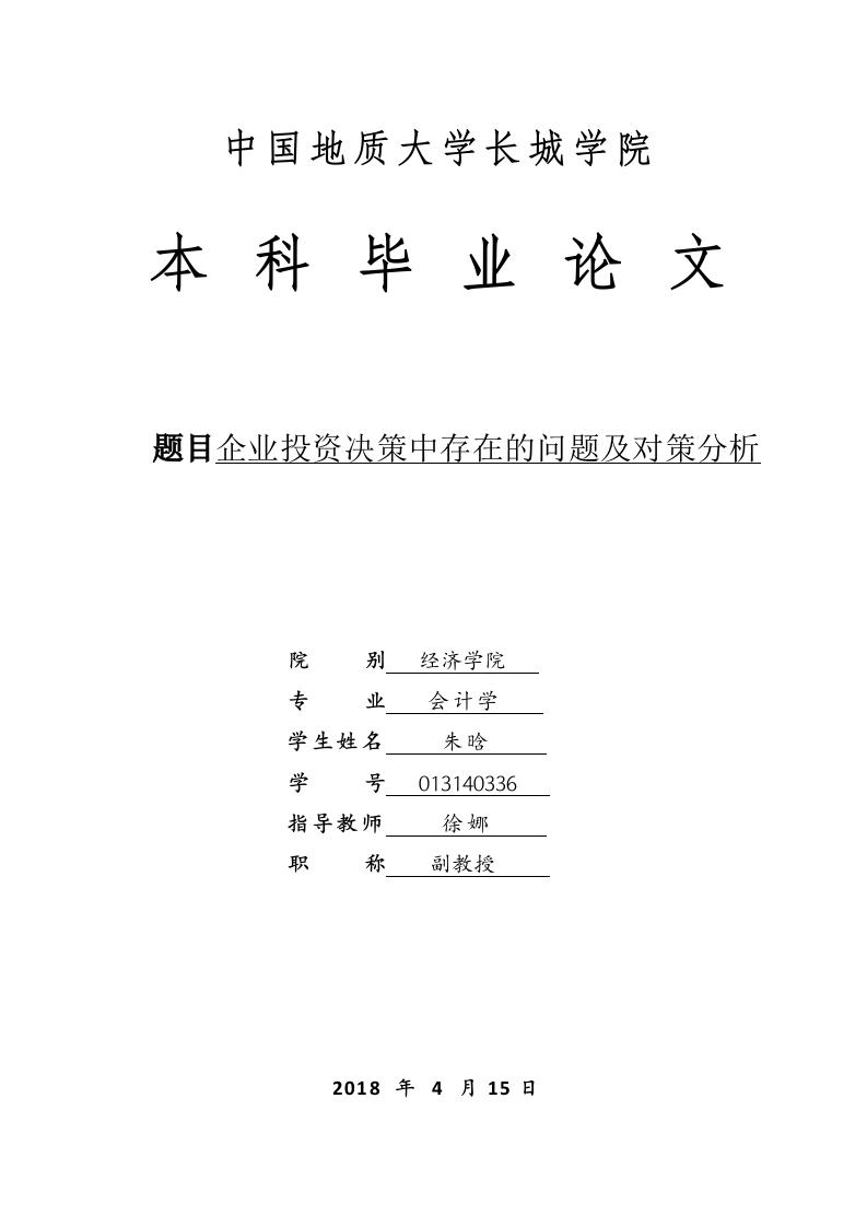 中国地质大学长城学院本科毕业论文题目企业投资决策中存在的问题及对策分析院别经济学院专业会计学学生姓名朱晗学号013140336指导教师徐娜职称副教授2018年4月15日本科毕业生毕业论文(设计)诚信承诺书毕业论文企业投资决策中存在的问题及杜策分析(设计)题目学生姓名朱晗专业会计学学号013140336指导老师徐娜职称副教授所在院别经济学院诚信承诺本人慎重承诺和声明:我承诺在毕业论文(设计)活动中遵守学校有关规定,恪守学术规范,在本人的毕业论文中不剽窃、抄袭他人的学术观点、思想和成果,不篡改研究数据,如有违规行为发生,我愿承担一切责任,接受学校的处理。学生(签名):年月日中国地质大学长城学院毕业论文任务书学生姓名朱晗学号013140336专业班级会计学三班指导教师徐娜职称副教授单位中国地质大学长城学院毕业论文题目企业投资决策中存在的问题及对策分析毕业论文主要内容和要求:主要内容:本文主要分析企业投资决策中存在的问题及对策分析,首先对企业投资决策的概念进行概述,进而阐述我国企业投资决策中存在的问题,然后从企业的投资规模、投资结构、投资成本等方面对投资决策的影响进行分析,最后提出对企业投资决策中存在问题的对策及建议。要求:论文撰写要求思路清晰、内容充实、论点明确,论据充分,论证严密,语言通顺。撰写论文前应首先阅读相关的研究资料,掌握学术前沿动态,对相关理论著作要很好的把握,提高理论水平及思想深度。根据开题报告和老师提出的意见对论文提纲进行修改,确定大纲后认真撰写毕业论文。撰写论文结束后要根据老师的修改意见,认真反复的修改论文,并按照要求参加毕业论文的答辩,严格按照论文进度安排进行论文的写作。论文的格式、字数等撰写方面的要求参照《中国地质大学长城学院毕业论文(设计)撰写规范》。毕业论文主要参考资料:[1]李红梅.浅谈国有企业投资决策过程中存在的问题及对策[J刀].财经界,2016(01):10-12.[2]韩莉,薄识宇.国有企业财务管理存在的问题及对策[J刀.中国商论,2017(02):26.[3]柳欣.中小企业财务管理存在的问题及对策分析[J].学理论,2016:10-15.[4]詹锐.目前企业投资管理中存在的问题与对策[J刀.东方企业文化,2015(10):1-2.[5]敦忆岚.新时期中国企业对外投资问题及对策研究[D].中国社会科学院研究生院,2014:1-4.[6]许洪亮.胜利油田开发企业投资管理研究[D].中国石油大学,2015:6-8[7]汤俊英.企业投资管理存在的问题及对策研究[J小.财会学习,2017(01):10-12.[8]张晓晗.家族式中小企业投资低效案例研究[D].吉林财经大学,2015:12-18[9]柳欣.中小企业财务管理存在的问题及对策分析[J刀.学理论,,2016(01):121-122.,[10]薛琰如.套利动机下矿产资源型国有企业对外直接投资决策研究[D].昆明理工大学,2017(03):25-58[11]汤俊英.企业投资管理存在的问题及对策研究[J].财会学习,2017(03):227-228.[12]张晓晗.家族式中小企业投资低效案例研究[D].吉林财经大学,2013(04):7-11.[13]魏永刚.谈企业的决策设计阶段价格控制[J].山西建筑,2016(01):10-12.[14]陈慧群.企业对外投资内部控制制度的设计及实施[J刀.现代,2015:1-4.[15]袁志明.对外投资内部控制的关键点[J刀.财会月刊,2013(04):7-11.[16]WUNDER,Tax Risk Management and the Multinational Enterprise,Journal of hiternationalAccounting,Auditing and Taxation 2015,(03):1-6.