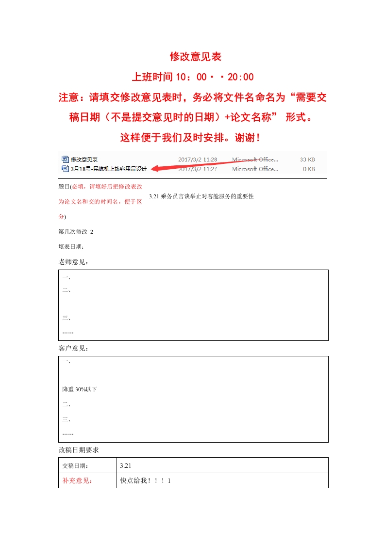 修改意见表上班时间10:00··20:00注意:请填交修改意见表时,务必将文件名命名为“需要交稿日期(不是提交意见时的日期)+论文名称”形式。这样便于我们及时安排。谢谢!则3月18号-民航机上旅客用品设计趣目(必填,请填好后把修改表改3.21乘务员言谈举止对客舱服务的重要性为论文名和交的时间名,便于区分)第几次修改2填表日期:老师意见:三、客户意见:降重30%以下三、改稿日期要求交稿日期:3.21补充意见:修改须知:1.因修改需要根据意见查阅相关资料,修改论文内容一般四天左右,格式小问题可以加快,硕士博士毕业论文内容五天到一周左右,如需要加急修改,请和客服详谈。2笼统的意见,恕不修改。您要说出详细修改的意见哦,否则我们也不清楚您的想法。2.请不要将意见一点一点的提出来,请全部整理好以后,一次性发给我们,单独的意见不予受理。3.在与初衷无明显出入、不改变题目、文章整体思路和大框架的前提下,免费修改。换题目、大修改视为重写,不予免费。4.凡在成文后换题、追加、细化写作要求,属买家本身的责任,恕不免费修改,敬请谅解。