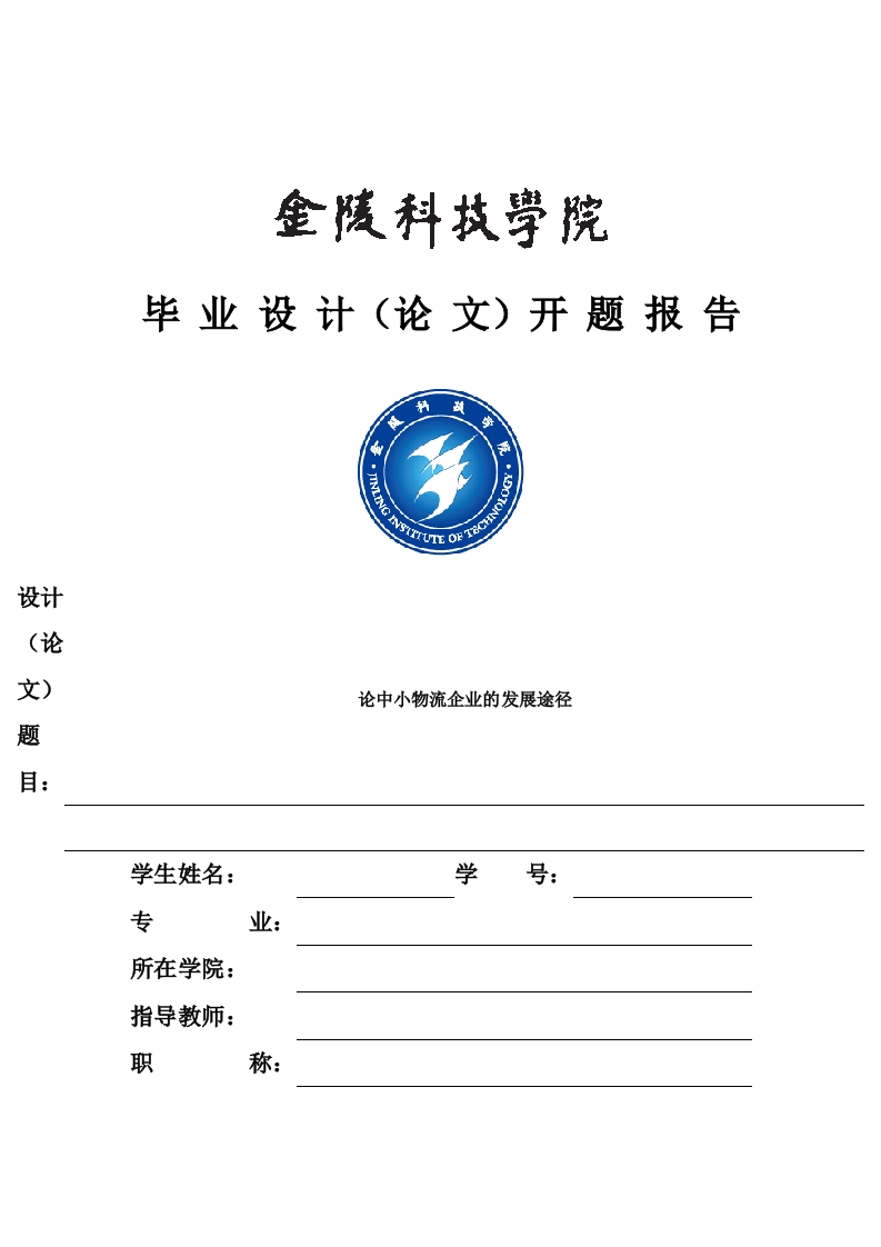 毕业设计(论文)开题报告设计(论文)论中小物流企业的发展途径学生姓名:学号:专所在学院:指导教师:职称:2012年3月开题报告填写要求1.开题报告(含“文献综述”)作为毕业设计(论文)答辩委员会对学生答辩资格审查的依据材料之一。此报告应在指导教师指导下,由学生在毕业设计(论文)工作前期内完成,经指导教师签署意见及所在专业审查后生效:2.开题报告内容必须用黑墨水笔工整书写或按教务处统一设计的电子文档标准格式打印,禁止打印在其它纸上后剪贴,完成后应及时交给指导教师签署意见:3,“文献综述”应按论文的框架成文,并直接书写(或打印)在本开题报告第一栏目内,学生写文献综述的参考文献应不少于15篇(不包括辞典、手册):4.有关年月日等日期的填写,应当按照国标GB/T7408一94《数据元和交换格式、信息交换、日期和时间表示法》规定的要求,一律用阿拉伯数字书写。如“2004年4月26日”或“2004-04-26”。5、开题报告(文献综述)字体请按宋体、小四号书写,行间距1.5倍。