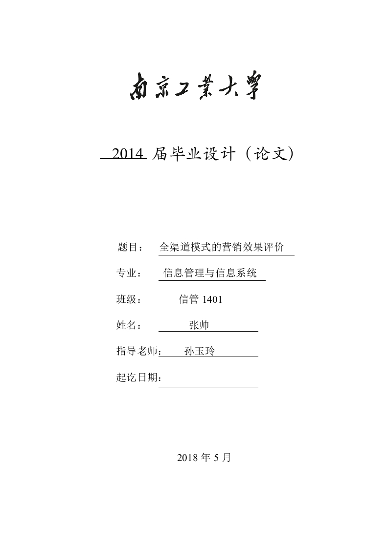 2014届毕业设计(论文)题目:全渠道模式的营销效果评价专业:信息管理与信息系统班级:信管1401姓名:张帅指导老师:孙玉玲起讫日期:2018年5月摘要全渠道模式的营销效果评价摘要近年来,我国互联网产业呈现蓬勃发展趋势,相比于传统营销方式,全渠道营销的模式可以让消费者在第一时间知道产品信息的动态,高效购物。本文全渠道营销模式进行分析研究。主要研究内容如下:第一章,介绍了全渠道研究背景、研究含义以及论文的主要研究中心和构思。第二章,对全渠道模式进行概述,分析了全渠道模式的优势,归纳和梳理了全渠道模式在国内外研究现状。第三章,分析了全渠道模式的主要营销方式,并指出了全渠道营销面临的问题。第四章,以苹果公司为研究对象,通过问卷调查的方法分析了全渠道模式营销效果的主要影响因素。调查分析结果表明,1、产品的质量是影响消费者购买意愿的主要因素:2消费者满意度是全渠道营销的关键因素:3、线下实体店客户的体验满意度会极大程度上的影响了消费者的购买意愿。第五章,对全渠道模式营销效果的主要影响因素进行了总结,并提出了改进全渠道模式营销效果的相关建议。第六章,对本文的主要结论进行了总结,并提出了未来的研究方向。关键词:全渠道营销:传统渠道营销:营销效果:影响因素。