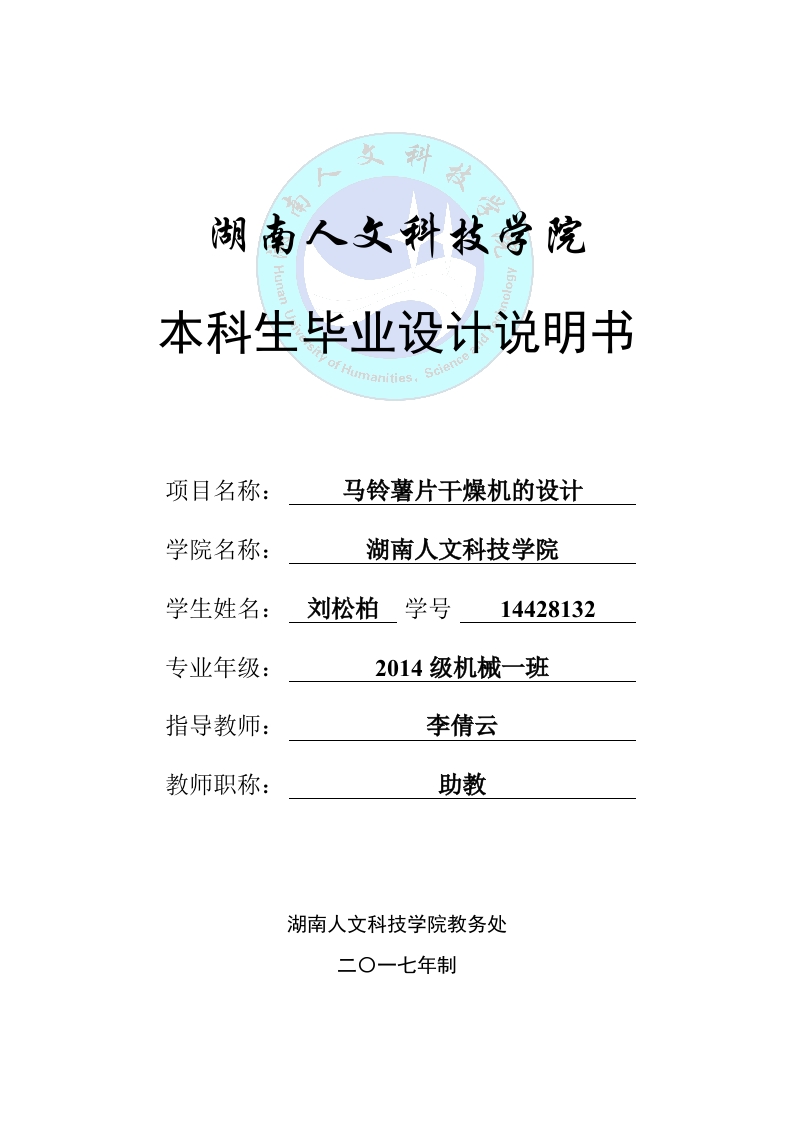 湖南人文科技学院本科生毕业设计说明书项目名称:马铃薯片干燥机的设计学院名称:湖南人文科技学院学生姓名:刘松柏学号14428132专业年级:2014级机械一班指导教师:李倩云教师职称:助教湖南人文科技学院教务处湖南人文科技学院本科生毕业设计说明书毕业设计原创性及知识产权声明本人郑重声明:所呈交毕业设计是本人在导师指导下独立进行研究所取得的成果,对本设计的研究做出重要贡献的个人和集体,均已在文中明确标明。除了文中特别加以标注引用的内容外,本论文不包含任何其他个人或集体已经发表或撰写的成果作品。本人完全意识到本声明的法律后果由本人承担。本毕业设计成果归湖南人文科技学院所有。作者签名:2018年月日导师签名:2018年月湖南人文科技学院本科生毕业设计说明书前言为了防止农产品霉烂变质,使其能较长时间保存,同时减少体积和重量,使其便于长距离运输,从而降低成本,从而农产品的干燥实质上是使其水分含量降低至所要求的范围:而原始的干燥大多依赖于自然风干的局面,干燥机的诞生改变了这一局面,提高了生产率和产品质量,降低了成本:本设计目的在于设计一个马铃薯片干燥机,从干燥机和干燥技术的国内外现状开始了解,综合考虑多种条件和因素,从多种多样的干燥机内选择合适的类型进行设计,充分了解干燥机的原理,进行了干燥机设计计算,进行结构上的优化,完成马铃薯片干燥机设计和计算的整个过程,对干燥设备有了更深层次的理解和创新。