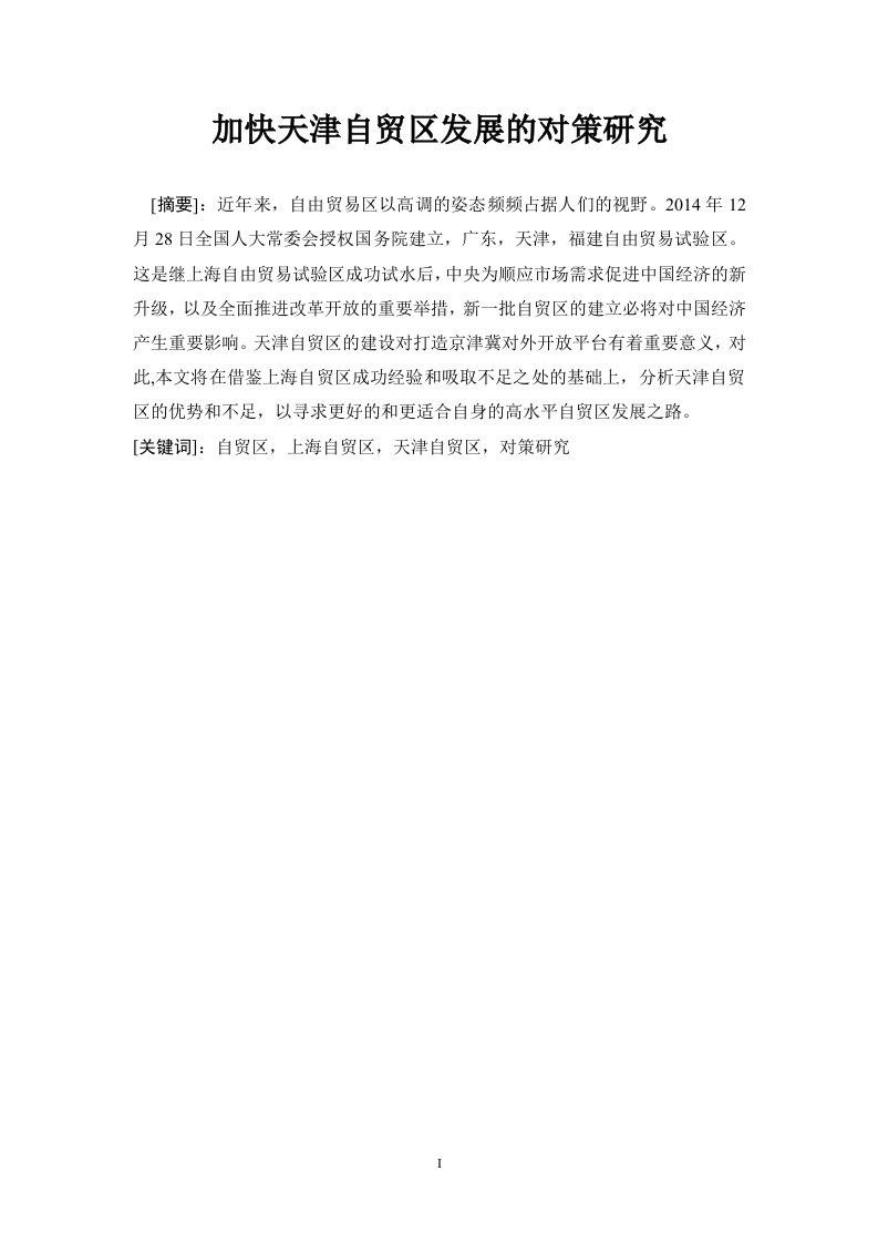 加快天津自贸区发展的对策研究[摘要]:近年来,自由贸易区以高调的姿态频频占据人们的视野。2014年12月28日全国人大常委会授权国务院建立,广东,天津,福建自由贸易试验区。这是继上海自由贸易试验区成功试水后,中央为顺应市场需求促进中国经济的新升级,以及全面推进改革开放的重要举措,新一批自贸区的建立必将对中国经济产生重要影响。天津自贸区的建设对打造京津冀对外开放平台有着重要意义,对此,本文将在借鉴上海自贸区成功经验和吸取不足之处的基础上,分析天津自贸区的优势和不足,以寻求更好的和更适合自身的高水平自贸区发展之路。[关键词]:自贸区,上海自贸区,天津自贸区,对策研究[abstract]:In recent years,free trade zone with the high-profile attitude frequentlydominated the field of vision.On December 28,2014,the standing committee of theNational People's Congress authorized the building of the state council,guangdong,tianjin,fujian free trade area.This is the Shanghai free trade area after successful testingthe waters,central to adapt to the market demand for upgrading China's new economy,and promoting reform and open policy the important action,a new wave of theestablishment of a free trade area will be an important impact on China's economy.Theconstruction of the tianjin free trade zone to build open platform has important significanceof the beijing-tianjin-hebei region,to this,this article will be in draw lessons fromsuccessful experience of Shanghai free trade zone and absorbs the deficiencies,on thebasis of analyzing the advantages and disadvantages of tianjin free trade zone,to seek abetter and more suitable for their own way to develop the high levels of free trade.[The key words ]Free trade zone,Shanghai free trade zone,tianjin free trade zone,the countermeasure research录第一章绪论…21.1研究背景.…21.2研究目的及意义21.3本文研究的主要内容3第二章自由贸易区概述…2.】基本概念…2.2自由贸易区基本特征42.3世界自贸区现状…52.4中国自贸区发展概况.…第三章上海自贸区发展现状分析与发展经验总结3.1上海自贸区简介…3.2上海自贸区战略定位83.3上海自贸区发展现状.103.4上海自贸区建设之经验…10第四章天津自贸区的历史沿革及发展现状分析.114.1天津自贸区简介.…4.2天津自贸区发展历程(历史沿革).134.3天津自贸区总体规划解析…134.4建设天津自贸区原因及优势分析…4.5天津自贸区的发展潜力探究…174.6建设天津自贸区的意义…第五章天津自贸区与上海自贸区比较分析…195.1天津自贸区与上海自贸区的相同点…5.2天津自贸区与上海自贸区各自的发展特色分析.25第六章加快天津自贸区发展的建议286.1天津自由贸易区目前发展存在的不足6.2对加快天津自贸区发展的相关建议.30参考文献.32加快天津自贸区发展对策研究1