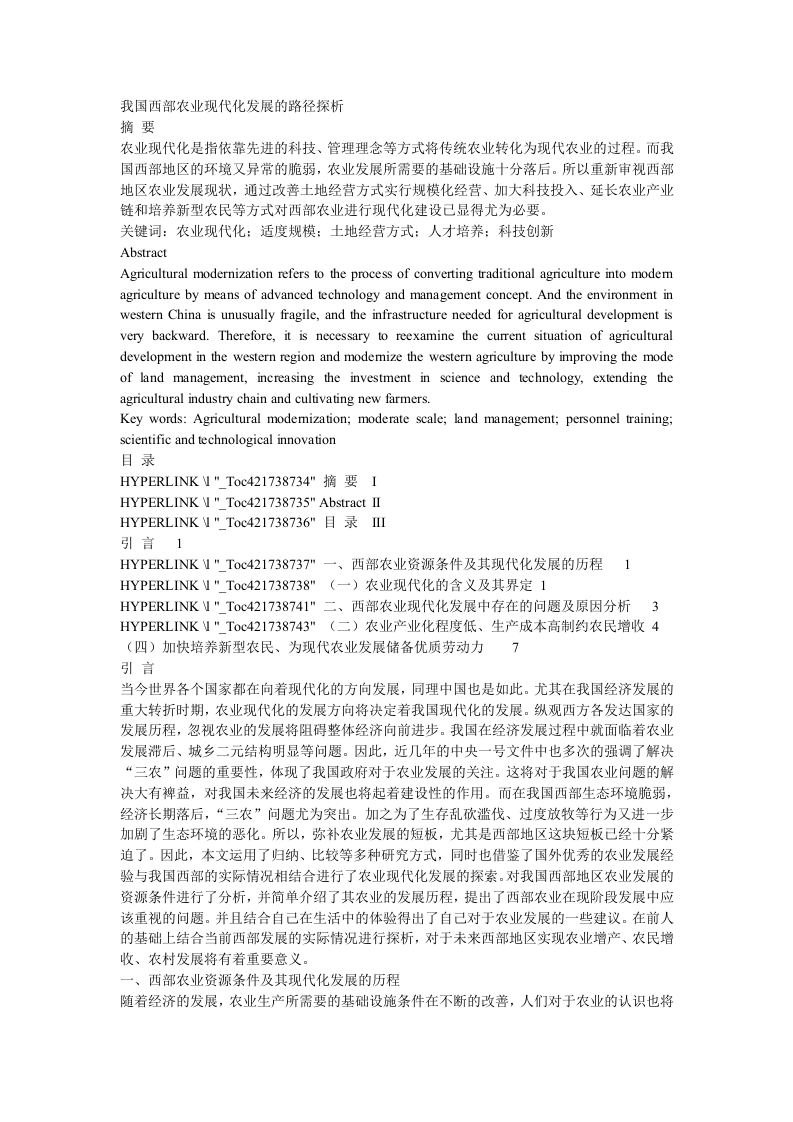 我国西部农业现代化发展的路径探析摘要农业现代化是指依靠先进的科技、管理理念等方式将传统农业转化为现代农业的过程。而我国西部地区的环境又异常的脆弱,农业发展所需要的基础设施十分落后。所以重新审视西部地区农业发展现状,通过改善土地经营方式实行规模化经营、加大科技投入、延长农业产业链和培养新型农民等方式对西部农业进行现代化建设己显得尤为必要。关键词:农业现代化:适度规模:土地经营方式:人才培养:科技创新AbstractAgricultural modernization refers to the process of converting traditional agriculture into modemagriculture by means of advanced technology and management concept.And the environment inwestern China is unusually fragile,and the infrastructure needed for agricultural development isvery backward.Therefore,it is necessary to reexamine the current situation of agriculturaldevelopment in the western region and modemize the western agriculture by improving the modeof land management,increasing the investment in science and technology,extending theagricultural industry chain and cultivating new farmers.Key words:Agricultural modemization;moderate scale;land management;personnel training;scientific and technological innovation目录HYPERLINK1"Toc421738734"摘要IHYPERLINK VI "_Toc421738735"Abstract IIHYPERLINK1"Toc421738736"目录Ⅱ引言1HYPERLINK1"Toc421738737"一、西部农业资源条件及其现代化发展的历程1HYPERLINK1"Toc421738738"(一)农业现代化的含义及其界定1HYPERLINK1"Toc421738741"二、西部农业现代化发展中存在的问题及原因分析3HYPERLINK1"Toc421738743"(二)农业产业化程度低、生产成本高制约农民增收4(四)加快培养新型农民、为现代农业发展储备优质劳动力7引言当今世界各个国家都在向着现代化的方向发展,同理中国也是如此。尤其在我国经济发展的重大转折时期,农业现代化的发展方向将决定着我国现代化的发展。纵观西方各发达国家的发展历程,忽视农业的发展将阻碍整体经济向前进步。我国在经济发展过程中就面临着农业发展滞后、城乡二元结构明显等问题。因此,近几年的中央一号文件中也多次的强调了解决“三农”问题的重要性,体现了我国政府对于农业发展的关注。这将对于我国农业问题的解决大有裨益,对我国未来经济的发展也将起着建设性的作用。而在我国西部生态环境脆弱,经济长期落后,“三农”问题尤为突出。加之为了生存乱砍滥伐、过度放牧等行为又进一步加剧了生态环境的恶化。所以,弥补农业发展的短板,尤其是西部地区这块短板己经十分紧迫了。因此,本文运用了归纳、比较等多种研究方式,同时也借鉴了国外优秀的农业发展经验与我国西部的实际情况相结合进行了农业现代化发展的探索。对我国西部地区农业发展的资源条件进行了分析,并简单介绍了其农业的发展历程,提出了西部农业在现阶段发展中应该重视的问题。并且结合自己在生活中的体验得出了自己对于农业发展的一些建议。在前人的基础上结合当前西部发展的实际情况进行探析,对于未来西部地区实现农业增产、农民增收、农村发展将有着重要意义。一、西部农业资源条件及其现代化发展的历程随着经济的发展,农业生产所需要的基础设施条件在不断的改善,人们对于农业的认识也将不断提升。我国西部地区农业发展所需要的各种资源从总量上来看占有一定的优势,但是从地域分配、自然条件等各个方面都处于弱势。这些弱势已经成为阻碍西部农业现代化发展过程中的主要屏障。在历史的不同阶段西部地区的农业发展都取得了应有的成就,但同时也存在着部分的不足。因此,把握我国西部地区农业的发展方向,按照比较优势进行发展将是实现农业现代化的必然之路。农业现代化的含义及其界定农业现代化是指从以依靠人力的生产方式向依靠机械设备的协作发展的改变以及实现大规模、低劳动力投入的过程。其内容包括生产手段的现代化、劳动者的现代化、组织管理的现代化、运行机制的现代化以及在开放经济条件下的国际化[]。学术界关于农业现代化这一命题主要从技术改善、制度引导、工业促进等各个方面进行了讨论。这些理论是不同学术领域的学者从自己擅长的领域出发进行探索,并从不同的方面进行阐述。但至今为止并没有形成统一的认识和科学的标准。国内外学者关于农业现代化理论的研究被大家所接受的有舒尔茨和林毅夫的观点。舒尔茨认为,传统农业落后的主要原因在于技术停滞,发展农业的关键是如何把不能对经济增长做出贡献的传统农业改造成为能对经济增长做出贡献的现代农业[2]。林毅夫则认为,农业的现代化不仅包括生产技术上的改进,而且也包括组织管理上的改进。通过研读大量文献资料进行分析,本人更接受林毅夫的观点,特别是在改进管理方式已成为一种创新方式的今天。就目前而言,将工业进步和农业发展结合起来分析,以工业来促进农业将是一条适合西部地区发展情况的农业发展道路。这一发展模式比较客观全面,也较多地考虑了中国地少人多、小生产与大市场这一现实国情。西部地区的农业资源条件1、农业自然资源丰富但分布不均我国西部地区包含了12个省份,区域面积约为681万平方公里,土地资源非常丰富。据中国统计年鉴2011年统计数据显示,西部地区耕地面积为67425.8万亩,占全国的37%3]。并且,西部地区的草场面积也非常的广阔,而且在国内外都十分