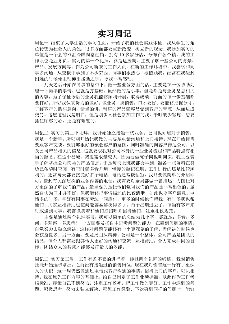 实习周记周记一结束了大学生活的学习生涯,开始了我的社会实践体检,我从学生的角色转变为社会人的角色,很多方面都要重新改变,树立新的观念。我参加实习的单位是一个县的双汇冷鲜肉总经销,拥有10多家分店,分布在各个镇。我的工作职位是业务员。实习的第一个礼拜,算是适应期。主要了解一些公司的背景、产品、发展方向等。作为公司新来的工作人员,在新的工作环境中,我尝试和同事多沟通,从交谈中学到了不少东西。同事们很热心,很照顾我,经常在我碰到困难的时候便主动伸出援助之手,令我非常感动。几天之后开始在同事的帮带下,做一些业务方面的活,主要是在一旁协助处理一下简单的事情。也就是打基础。虽然做的是小事,但是都是与业务息息相关的内容,为了保证今后的业务我能够顺利开展,取得成绩,前面的每一步基础都要打好。所以我认真努力的做好。做业务,搞销售,口才要好、要能够把握分寸,了解客户的购买意向,恰当的讲,销售的产品就容易受到客户的青睐,从而达成交易。这层道理我是明白,但是刚步入社会参加工作的我,平时缺少锻炼,想要抓住顾客的心,还是有难度的。周记二实习的第二个礼拜,我开始独立接触一些业务。公司也知道对于销售,我是一个新手,所以刚开始让我做的主要是电话沟通和上门接待。现在开始便需要跟客户交谈,要能够很好的领会客户的意图,同时准确的向客户传达公司,以及公司产品相关的信息。这就要求我对公司本身的一些业务流程和产品特点有相当的熟悉。在这个县城,猪皮需求量较大,因为要做冻子肉也叫肉冻,我主要着手了解掌握公司肉类的产品信息,于是每天上班我都会早到,准备一些资料在身边已备随时查阅,有空时就多看几遍,慢慢的熟记在胸。工作进行的还是比较顺利的,通常每天都要接受好多个电话,电话通常谈话短,我只要做简单的介绍即可。接到有关深层次的业务内容的电话,我需要对全局都做一番描述,力图让对方更深的了解我们的产品,最重要的是让他们觉得我们的产品是非常出色的。虽然自认为口才并不好,但我能够把事情描述的比较清晰,如此也令客户满意。电话多的时候,幸好有同事在旁边一同应付,更多的时候他们帮我,有时候我也帮他们。大家互相帮助也使问题容易解决得多了。两个星期过去了,每当有客户来时或遇到同事,我都微笑着和他们打招呼并招待他们,注重礼仪规范。主要是通过两个礼拜实习,我可以简单的总结为几个字,那就是:多看,多问,多观察,多思考!一方面要发扬自主思考问题的能力,在碰到问题的事情,自觉努力去独立解决,这样对问题便能够有一个更深刻的了解,当解决的时候也会获益良多。另一方面,要发扬团队精神。公司是一个整体,公司产品是团队的结晶,每个人都需要跟其他人更好的沟通和交流,互相帮助,合力完成共同的目标,团结众人的智慧才能够发挥最大的效能。周记三实习第三周,工作有条不紊的进行着,经过两个礼拜的锻炼,我对销售技能开始逐步掌握,之前没有接触过的销售岗位,现在我对销售这一行有了更深入的认识,这一周仍然做通过电话跟客户沟通的事情,招待上门的客户,以礼相待。我在原先工作内容的基础上,给自己制定了工作业绩标准,以此作为工作考核标准,鞭策自己不断努力,注重工作效率,把工作做的更好。工作中遇到的问题,积极思考,努力去独立解决,积累工作经验,下次碰到同样的问题时,能够迎刃而解。通过三周的业务考核,我觉的有必要检讨反思下为什么老是提高不了我的销售额,经过思考我发现,除了我个人原因外,还有一个重要原因就是,现在店里基本上销售出去的都是一些老客户,而新客户相对较少,再一个就是同行竞争激烈,有些客户对这里的价格或质量不接受而选择别家,这就造成了经过我手的销售就变的少了。经过分析,我总结出了销售策略,制定合理的价格,提高产品的质量和服务水平,如加强对猪肉的保鲜等。保持老的客户源稳定,开发新市场,寻找新的客户源。周记四实习第四周,我偶尔出去和客户面谈了,由于自己平时缺少锻炼的缘故,首次与客户面谈显得比较紧张,也不大顺利,不过有了一次经历之后,进步了不少,再加上经理和同事的鼓励,自己尝试大胆的去应付,慢慢的好了许多。不再会在陌生的场合怯场。今天下来,面对经验比我丰富的阅历比我深的多的多的客户,也能够通过简练清晰的表达让对方熟悉我们的产品,让他们对我们的产品产生更浓厚的兴趣。人往往都是这样,没有经历过的话,永远都不知道事情到底是怎么一个样子,是真的那么难,还是并非如此,所以,不管怎么样,即使是自己完全陌生的事情,只要有机会,都一定要去尝试,努力去做好。因为没有经验,那么就需要做更多的准备工作。另外就是不要害怕失败,只要用心去做就可以了。等到熟练了,那么成功将是水到渠成的事情。比如我的第一次跟客户面谈,虽然我做得不够好,或者可以说失败了,但通过这次的尝试,却令我获益匪浅,对我之后的几次任务的成功都起到了极大的推动作用。自己也通过不断的经历和尝试检验了自身的水平和适应能力。只有通过不断的努力,不断的尝试,不断的积累经验,才能够发现自己的不足,然后在弥补不足的时候,我们便实实在在的提高了自己。所以,不管怎样,努力去做吧,告诉自己,只要用心,就能做得更好!周记五实习的第