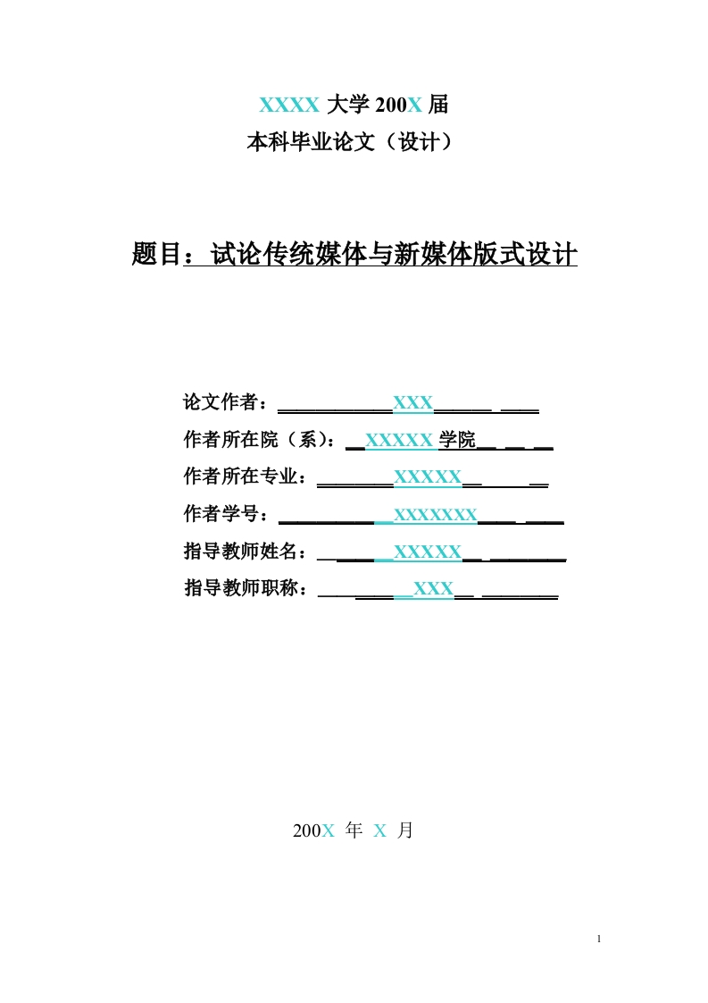 XXXX大学200X届本科毕业论文(设计)题目:试论传统媒体与新媒体版式设计论文作者:作者所在院(系):XXXXX学院作者所在专业:XXXXX作者学号:XXXXXXX指导教师姓名:XXXXX指导教师职称:XXX200X年X月4BSTRACT.............................................................................................3一、相关概念界定1.1视觉文化…41.2版式……51.3版式设计…5二、传统媒体版式设计…52.1读文时代到读图时代的转变2.2报纸版式设计的发展…52.3报纸版式设计的趋势……62.3.1版面风格变化…2.3.2导读被日益重视……62.4版式设计在视觉传达中的作用…三、新媒体版式设计…3.1网络版式设计的定义……83.2网页版式设计原则…3.2.1主题鲜明…3.2.2形式与内容统一…3.2.3强调整体…3.3网络版式设计的特点…3.3.2多维性……93.3.3技术与艺术结合…103.4网络版式设计的发展趋势10致谢…13摘要随着传媒形态的日益丰富,各类形态媒体所占有的受众传媒消费时间也呈现出此消彼长的态势。作为传统媒体,传统媒体的版式设计者应开阔眼界,触类旁通,关注流行和时尚的相关艺术,增强自己的艺术修养和对时尚的敏感度以及对设计规律的理解能力和把握能力,令传统媒体的版式必须学会创新来适应时代的发展:而在这个以互联网络技术为标志的崭新的信息时代,新媒体的版式设计者更应该致力于将网络与设计、技术与艺术完美地结合,开拓全新的视觉空间,2使视觉文化成为新媒体版式设计的主导潮流。本文在对视觉文化、版式、版式设计等概念界定的基础上,详细阐述了我国传统媒体即报纸和新媒体即网络的版式设计。关键词:传统媒体:新媒体:版式设计ABSTRACTWith the growing rich media forms,various forms of media audiences Some mediaconsumption time Cixiaobizhang also showing a trend.As traditional media,traditionalmedia format designers should broaden their vision,Chuleipangtong,concerns related tothe fashion and pop art,enhance their artistic accomplishments and the sensitivity of thefashion and design of the understanding and grasp the ability to make the traditionalmedia Innovative format must learn to adapt to the development of the times.In this to3