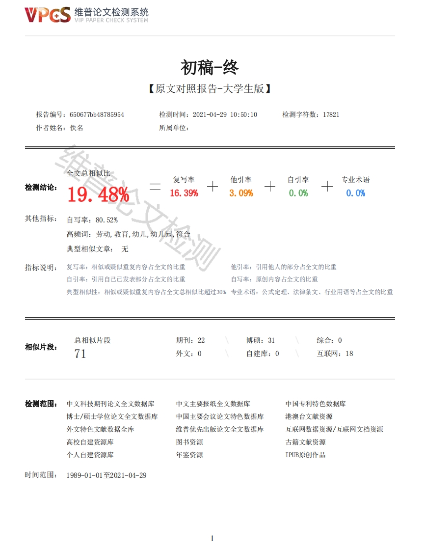 维普论文检测系统VIP PAPER CHECK SYSTEM【原文对照报告-大学生版】报告编号:650677bb48785954检测时间:2021-04-2910:50:10检测字符数:17821作者姓名:佚名所属单位:全文总相似比复写率他引率自引率专业术语检测结论:19.48%16.39%3.09%0.0%0.0%其他指标:自写率:80.52%高频词:劳动,教育,幼儿,幼儿园,符合典型相似文章:无指标说明:复写率:相似或疑似重复内容占全文的比重他引率:引用他人的部分占全文的比重自引率:引用自己已发表部分占全文的比重自写率:原创内容占全文的比重典型相似性:相似或疑似重复内容占全文总相似比超过30%专业术语:公式定理、法律条文、行业用语等占全文的比重总相似片段期刊:22博硕:31综合:0相似片段:71外文:0自建库:0互联网:18检测范围:中文科技期刊论文全文数据库中文主要报纸全文数据库中国专利特色数据库博士/硕士学位论文全文数据库中国主要会议论文特色数据库港澳台文献资源外文特色文献数据全库维普优先出版论文全文数据库互联网数据资源/互联网文档资源高校自建资源库图书资源古籍文献资源个人自建资源库年鉴资源IPUB原创作品时间范围:1989-01-01至2021-04-29维普论文检测系统VIP PAPER CHECK SYSTEM原文对照颜色标注说明:■自写片段■复写片段(相似或疑似重复)口引用片段(引用)■专业术语(公式定理、法律条文、行业用语等)GT1910XINGTAI UNIVERSITYUNIV学士学位论文石家庄市幼儿园劳动教育现状调查研究姓名于赛颖学号20170981206院(系部)初等教育学院专业学前教育指导教师陈晗指导教师职称讲师二O二一年月日学位论文原创性声明本人所提交的学位论文石家庄市幼儿园劳动教育现状调查研究,是在导师的指导下,独立进行研究工作所取得的原创性成果。除文中已经注明引用的内容外,本论文不包含任何其他个人或集体已经发表或撰写过的研究成果。对本文的研究做出重要贡献的个人和集体,均已在文中标明。本声明的法律后果由本人承担。论文作者(签名):指导教师确认(签名):年月日年月日学位论文版权使用授权书本学位论文作者完全了解邢台学院有权保留并向国家有关部门或机构送交学位论文的复印件和磁盘,允许论文被查阅和借阅。本人授权邢台学院可以将学位论文的全部或部分内容编入有关数据库进行检索,可以采用影印、缩印或其它复制手段保存、汇编学位论文。保密的学位论文在年解密后适用本授权书。论文作者(签名):指导教师(签名):年月日年月日摘要为了了解幼儿园劳动教育现状,本文从劳动教育认识、态度、方法、开展及家长对幼儿园劳动教育的态度这五2维普论文检测系统VIP PAPER CHECK SYSTEM个维度对石家庄市5所幼儿园的85名幼儿教师进行了关于劳动教育现状的问卷调查。结果表明,该地区幼儿园劳动教育现状整体呈良好水平,从各维度来看,劳动教育方法、劳动教育态度处于良好水平:劳动教育认识、家长对幼儿园劳动教育的态度和幼儿园劳动教育开展处于中等偏上水平。基于此,提出了相关建议:教师方面要积极参加培训、注重自我发展、与家长积极沟通:家长方面要经常和教师交流劳动教育的问题,积极参与幼儿园布置的劳动任务:幼儿园方面要加大教育资源的投入,改善劳动教育的评价方式。关键词:幼儿园:劳动教育:石家庄市ABSTRACTIn order to understand the current situation of labor education in kindergartens,this paperconducted a questionnaire survey on the current situation of labor education among 85 preschoolteachers in 5 kindergartens in Shijiazhuang City from five dimensions of labor education cognition,attitude,method,development and parents'attitude towards labor education in kindergartens.Theresults show that the current situation of labor education in kindergartens in this area is at agood level,and the methods and attitudes of labor education are at a good level from alldimensions.The understanding of labor education,parents'attitude towards labor education and thedevelopment of labor education in kindergarten are above the average level.Based on this,relevant suggestions are put forward:teachers should actively participate intraining,pay attention to self-development,and actively communicate with parents:Parents shouldoften communicate with teachers about labor education,and actively participate in the labor tasksassigned by kindergartens.Kindergartens should increase the investment of educational resources andimprove the evaluation method of labor education.Key words:the kindergarten;labor education:Shijiazhuang city目录前言1第1章研究设计21.1研究方法21.1.1文献法21.1.2问卷调查法21.2问卷设计21.2.1问卷信度检验21.2.2问卷效度检验31.3问卷正式施测与样本选择3第2章幼儿园劳动教育现状的调查结果42.1幼儿园劳动教育现状总体水平及诸因子水平42.2幼儿园劳动教育现状的人口学差异分析52.2.1幼儿园劳动教育水平的学历差异52.2.2幼儿园劳动教育水平的教龄差异52.2.3幼儿园劳动教育水平的园所性质差异52.2.4幼儿园劳动教育水平的地域差异62.2.5是否有明确劳动教育课程体系对劳动教育现状的差异62.2.6是否会定期开展劳动教育相关培训的对劳动教育现状的差异72.2.7是否学前教育专业对劳动教育现状的差异7第3章讨论与分析83.1整体状况分析83.2个体差异分析83.2.1幼儿教师学历差异分析93.2.2幼儿教师教龄差异分析93