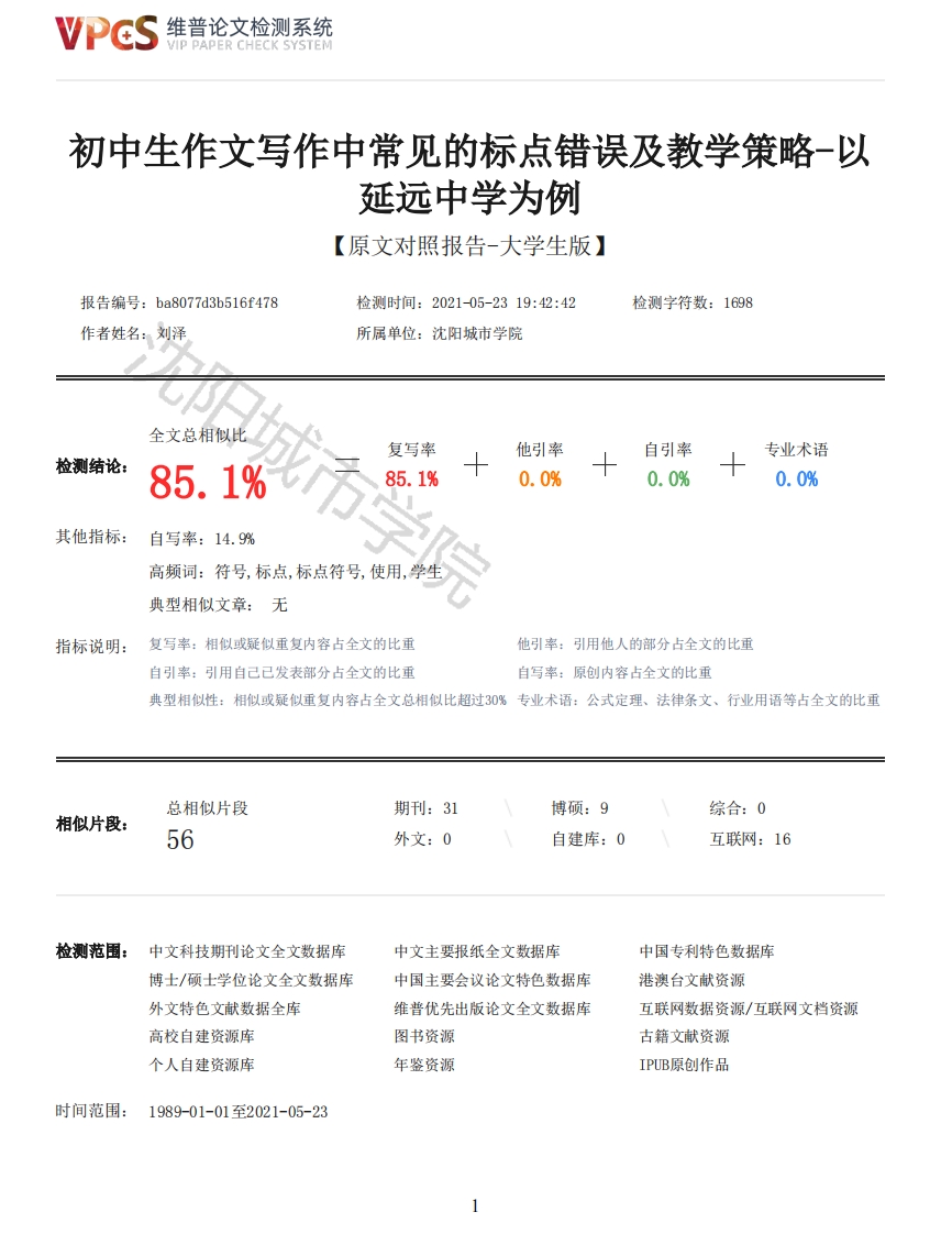 维普论文检测系统VIP PAPER CHECK SYSTEM初中生作文写作中常见的标点错误及教学策略-以延远中学为例【原文对照报告-大学生版】报告编号:ba8077d3b516f478检测时间:2021-05-2319:42:42检测字符数:1698作者姓名:刘泽所属单位:沈阳城市学院全文总相似比复写率他引率自引率专业术语检测结论:85.1%85.1%0.0%0.0%0.0%其他指标:自写率:14.9%高频词:符号,标点,标点符号,使用,学生典型相似文章:无指标说明:复写率:相似或疑似重复内容占全文的比重他引率:引用他人的部分占全文的比重自引率:引用自己已发表部分占全文的比重自写率:原创内容占全文的比重典型相似性:相似或疑似重复内容占全文总相似比超过30%专业术语:公式定理、法律条文、行业用语等占全文的比重总相似片段期刊:31博硕:9综合:0相似片段:56外文:0自建库:0互联网:16检测范围:中文科技期刊论文全文数据库中文主要报纸全文数据库中国专利特色数据库博士/硕士学位论文全文数据库中国主要会议论文特色数据库港澳台文献资源外文特色文献数据全库维普优先出版论文全文数据库互联网数据资源/互联网文档资源高校自建资源库图书资源古籍文献资源个人自建资源库年鉴资源IPUB原创作品时间范围:1989-01-01至2021-05-23维普论文检测系统VIP PAPER CHECK SYSTEM原文对照颜色标注说明:■自写片段■复写片段(相似或疑似重复)引用片段(引用)■专业术语(公式定理、法律条文、行业用语等)标点符号是语言表达的重要组成部分之一,正确使用标点符号对中学生写作能力的提升具有积极作用。《语文课程标准(2011版)》指出:“学生在理解课文的过程中,要体会顿号与逗号、分号与句号的不同用法。“结合语言表达的实际需要,学会正确使用常用的标点符号。“然而,中学作文教学及评改过程中,教师常常把内容表述、语言组织、思维逻辑作为作文习作教学重点,标点符号使用偏误问题却很少引起教师的关注。标点符号作为辅助文字记录语言的符号,是书面语的有机组成部分,用来表示停顿、语气以及词语的性质和作用。正因为它是准确表达思想、传递信息的重要手段,正确使用标点符号,对准确表达文意、提高效率和推动语言的规范化,都有着积极的意义。《语文课程标准》在“阶段性目标”里对标点符号的教学提出了要求。中学生作文中存在的一个显著问题就是标点符号使用不够规范,语文教师应该充分关注学生标点符号的使用情况,指导学生规范使用标点符号,提高现代汉语书面语写作的质量,中学阶段是学生书写规范化培养的关键时期,这个时期,教师要根据学生对标点符号使用过程中存在的问题加以纠正,使学生养成良好的书写习惯,提高汉语书面语表达能力。本文通过调查问卷的方式,掌握中学学生标点符号使用情况,研究分析相关标点符号的常见使用错误及原因,从而起广大语文教师的关注,进而提高中学生标点符号的使用能力。对相关文献的检索表明,国内关于汉语标点符号历史的研究始于20世纪80年代中期,迄今已经形成了以期刊文章、少量专著和学位论文形式的研究文献,但汉语标点符号发展历史的综观性研究文章还较鲜有。为此,本文拟在已有研究的基础上,对汉语标点符号的历史演进予以综述,以期勾勒汉语标点符号发展的历史概貌,为快速了解相关状况提供可资借鉴与有益参考。标点符号的运用要求熟悉各类标号和点号的规范用法和规范书写,根据语意正确使用。虽然标点符号在中考中不是必考点,但它在写作题中能体现出来。标点使用错误,虽然说不是很大的问题,但是,阅卷老师会由此认定考生基本功差,所以在打分时就会产生情感负值。因此,我们也不可轻视。《考试大纲》对本能力点的要求是:能够“正确使用标点符号”,能力层级为D级。如果标点符号使用混乱,有时不仅不能表达正确的意思,反而可能会表达截然不同的意思。进一步剖析造成错用现象的原因,即学生不良的书写习惯及书写态度、学生标点符号的认知较为有限,教师对标点符号教学不重视、教师的教学方法不当,教材编写的问题和社会环境的影响都对错用负一定的责任。针对上述原因,本论文对如何避免出现错用现象提出了三点对策,即要培养学生正确使用标点符号的意识,提高教师对标点符号教学的重视以及改善学习环境与改良教科书。1概念界定学术界对标点符号的的概念已经形成了统一定论,标点符号是指书面上用于标明句读和语气的符号,是书面语的组成部分,用来表示、语气以及词语的性质和作用。1.1标点符号概述标点符号是用于文章中标明语言和语气的符号。是帮助文字来记录语言的符号,是书写的重要组成部分,是用来表示停顿、语气和词语性质的符号。标点符号分为标号和点号两种。其中点号由顿号、逗号、分号、冒号、句号、问号、感叹号七种组成:标号则2维普论文检测系统VIP PAPER CHECK SYSTEM是由引号、破折号、省略号、书名号、着重号、间隔号、连接号、专名号等九种符号组成。点号能表明句子的各种不同语气或表示句子的停顿,标号的功能则是标明词语的性质和作用。1.2新课标标点要求《新课程标准》要求熟悉标点符号的功能,能正确书写和使用标点符号。标点符号这个考点:一要了解标点符号的分类,掌握并正确使用句号、问号、感叹号、逗号、顿号、分号、冒号、引号、破折号、省略号、书名号等常用标