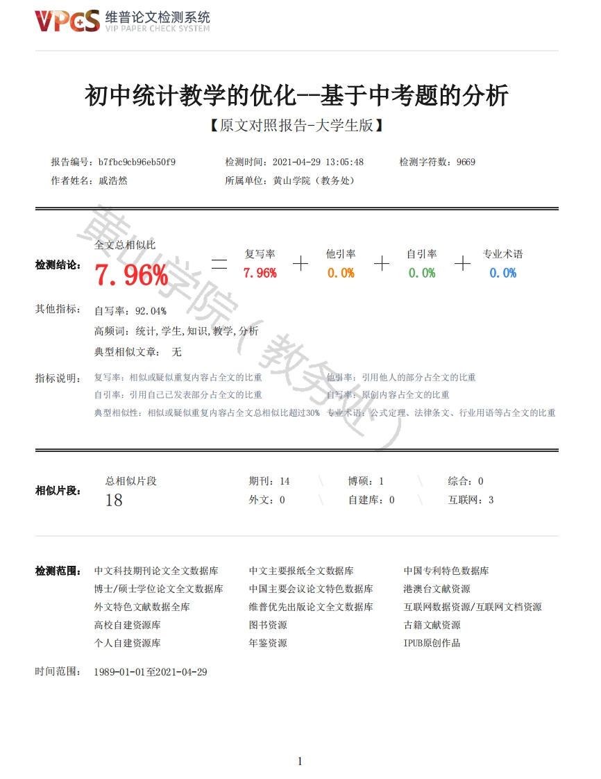 维普论文检测系统VIP PAPER CHECK SYSTEM初中统计教学的优化一基于中考题的分析【原文对照报告-大学生版】报告编号:b7fbc9cb96eb50f9检测时间:2021-04-2913:05:48检测字符数:9669作者姓名:戚浩然所属单位:黄山学院(教务处)全文总相似比复写率他引率自引率专业术语检测结论:7.96%7.96%0.0%0.0%0.0%其他指标:自写率:92.04%高频词:统计,学生,知识,教学,分析典型相似文章:无指标说明:复写率:相似或疑似重复内容占全文的比重引用他人的部分占全文的比重自引率:引用自己已发表部分占全文的比重写率:原创内容占全文的比重典型相似性:相似或疑似重复内容占全文总相似比超过30%专业术语:公式定理、法律条文、行业用语等占全文的比重总相似片段期刊:14博硕:1综合:0相似片段:18外文:0自建库:0互联网:3检测范围:中文科技期刊论文全文数据库中文主要报纸全文数据库中国专利特色数据库博士/硕士学位论文全文数据库中国主要会议论文特色数据库港澳台文献资源外文特色文献数据全库维普优先出版论文全文数据库互联网数据资源/互联网文档资源高校自建资源库图书资源古籍文献资源个人自建资源库年鉴资源IPUB原创作品时间范围:1989-01-01至2021-04-29维普论文检测系统VIP PAPER CHECK SYSTEM原文对照颜色标注说明:■自写片段■复写片段(相似或疑似重复)口引用片段(引用)■专业术语(公式定理、法律条文、行业用语等)黄山学院本科毕业论文(2021届)题目:初中统计教学的优化-一基于中考题的分析学院:数学与统计学院专业:数学与应用数学学生姓名:戚浩然学号:21705011038指导教师:孙露职称(学位):合作导师:职称(学位):完成时间:201年月日成绩:黄山学院教务处制学位论文原创性声明兹呈交的学位论文,是本人在指导老师指导下独立完成的研究成果。本人在论文写作中参考的其他个人或集体的研究成果,均在文中以明确方式标明。本人依法享有和承担由此论文而产生的权利和责任。声明人(签名):年月日目录摘要1英文摘要11前言22中考题指导教学的必要性22.1中考在义务教育阶段的意义22.2中考题的分析对数学教学的影响23中考试题的分析22维普论文检测系统VIP PAPER CHECK SYSTEM3.1中考统计试题的分析23.1.1中考统计试题的知识点23.1.2中考统计试题的设计43.1.3中考统计试题的立意63.2初中统计知识的分析74初中统计教学的优化74.1在全面的前提下有针对性的设计教学目标74.2科学高效的教学方法74.2.1讲授法74.2.2演示法84.2.3探究法94.2.4信息技术结合法94.2.5练习法104.3有趣可行教学活动114.4自由、和谐的教学环境4.5科学有效的教学评价114.5.1知识与技能114.5.2数学思考与问题解决114.5.3情感态度与价值观12学院5研究总结125.1注重培养学生的数据分析观念12参考文献12初中统计教学的优化-一基于中考题的分析数学与统计学院数学与应用戚浩然(21705011038)指导老师:孙露(副教授)摘要:统计与概率是初中统计课程内容的重要组成部分,以往的统计教学手段与当前的教学理念相左,故统计教学优化势在必行。依据课程标准结合社会热点科学设计形成的中考试题可以作为改善教学的一个切入点。通过对江、浙、沪、皖中考统计试题的分析,明确中考的考试理念、考察重点和出题模式,结合初中统计知识的分布和重、难点内容,从教学目标、教学方法、教学活动、教学环境和教学评价的方面优化教学。实现在理解的基础上记忆知识点,在知识的运用中解开数据的秘密,在解决问题中形成数据分析观念。关键词:统计教学理念:中考试题:统计与概率;教学优化Optimization of junior high school statistics teaching--Analysis based on the questions ofsenior high school entrance examinationSchool of mathematics and statistics Mathematics and Applied MathematicsQi Haoran(21705011038)Director:Sun Lu(Dept.of Science Engineering,Huangshan UniversityAbstract Statistics and probability is an important part of junior high school statisticscourse.The former teaching methods of statistics are different from the current teaching ideas,sothe optimization of statistics teaching is imperative.According to the curriculum standards,combined with the social hot scientific design,the high school entrance examination questions canbe used as an entry point to improve teaching.Based on the analysis of the statistical questions ofthe high school entrance examination in Jiangsu,Zhejiang,Shanghai and Anhui,this paper clarifiesthe examination idea,key points and mode of the examination,and optimizes the teaching from theaspects of teaching ob jectives,teaching methods,teaching activities,teaching environment and3