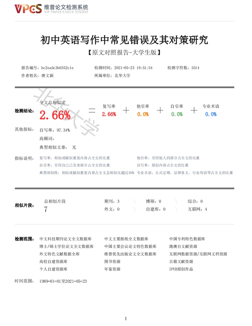 维普论文检测系统VIP PAPER CHECK SYSTEM初中英语写作中常见错误及其对策研究【原文对照报告-大学生版】报告编号:bc2ea5c3b0352c1e检测时间:2021-05-2319:51:54检测字符数:5514作者姓名:唐文颖所属单位:北华大学全文总相似比复写率他引率自引率专业术语检测结论:2.66%2.66%0.0%0.0%0.0%其他指标:自写率:97.34%高频词:典型相似文章:无指标说明:复写率:相似或疑似重复内容占全文的比重他引率:引用他人的部分占全文的比重自引率:引用自己已发表部分占全文的比重自写率:原创内容占全文的比重典型相似性:相似或疑似重复内容占全文总相似比超过30%专业术语:公式定理、法律条文、行业用语等占全文的比重总相似片段期刊:3博硕:0综合:0相似片段:外文:0自建库:0互联网:4检测范围:中文科技期刊论文全文数据库中文主要报纸全文数据库中国专利特色数据库博士/硕士学位论文全文数据库中国主要会议论文特色数据库港澳台文献资源外文特色文献数据全库维普优先出版论文全文数据库互联网数据资源/互联网文档资源高校自建资源库图书资源古籍文献资源个人自建资源库年鉴资源IPUB原创作品时间范围:1989-01-01至2021-05-23维普论文检测系统VIP PAPER CHECK SYSTEM原文对照颜色标注说明:■自写片段■复写片段(相似或疑似重复)口引用片段(引用)■专业术语(公式定理、法律条文、行业用语等)A Study of Common Mistakes in Junior English Composition and Their Countermeasures初中英语写作中常见错误及其对策研究】A study of Common Mistakes in Junior English Composition and Their CountermeasuresAbstract:Writing ability is one of the four basic language skills for English learners.Englishcomposition,as the most difficult content in junior English teaching,has always been a difficultyfor Chinese students in English learning.The paper,taking English compositions of Grade 9 studentsfrom one junior middle school of Jilin City as samples,summarizes the types and characteristics ofmistakes in their English compositions and analyzes the causes of these mistakes,then put forwardeffective teaching suggestions,in order to provide suggestions for teachers in their writingteaching,help students reduce mistakes in English compositions and improve English writing skills.Key words:composition mistakesEnglish composition junior school摘要:写作是英语学习者必须掌握的四项语言基本技能之一。写作作为初中英语教学中要求最高且最难的内容,一直以来都是中国学生尤其是基础薄弱的初中生在英语学习过程中的难题。本文以吉林市某中学九年级学生的英语作文为语料,通过归纳、总结初中生英语写作中出现的错误类型和特点,分析导致错误的原因并提出针对性的教学建议,希望为教师在写作教学提供参考建议,帮助学生减少英语写作错误进而提高英语写作水平。关键词:写作错误英语写作初中Contents1.Introduction(1)2.Brief Introduction to Mistakes(1)2.1 Definition of mistakes(1)2.2 Classification of mistakes(2)3.Analysis of Common Mistakes in Junior English Composition(2)3.1 Mistakes in vocabulary(2)3.2 Mistakes in syntax(4)3.3 Mistakes in discourse(5)4.Countermeasures for Common Mistakes in Junior English Composition(6)4.1 Strengthen accumulation of language knowledge(6)4.2 Reduce the impact of negative transfer of mother tongue(7)4.3 Strengthen the practice of English composition(8)5.Conclusion(9)Bibliography (10)Acknowledgement (11)2维普论文检测系统VIP PAPER CHECK SYSTEMName:Tang WenyingC1ass:17.1Number:16Tutor/Title:Zhao Yao/Associate professorDate:2021.05.22A Study of Common Mistakes in Junior English Composition and Their Countermeasures1.IntroductionEnglish composition plays a vital role both in daily life and in study.In the increasinglycompetitive world,English is an essential skill for communication.In junior high school,writingis a very important language skill,which is one of the basic abilities to use the languagecomprehensively.Among to the four language skills (listening,speaking,reading and writing),writing is also regarded as the most difficult one.English composition can examine students'ability to use the language comprehensively,which occupies a large proportion in senior high schoolentrance examination.However,English composition performance of junior high school students is notoptimistic.As writing is difficult in English learning,students will inevitably make some mistakesin their English compositions.Students have different problems in their English compositions.Therefore,to figure out the mistakes that students made in their English compositions,how to dealwith them and how to correct them are the topics worthy of research and discussion.The paper,taking the compositions in monthly examination of Grade 9 middle school students as study samples,analyzes and summarizes the mistakes in students'English compositions in order to find outcountermeasures which can help students reduce the mistakes in their English compositions andimprove their writing competence.2.Brief Introduction to MistakesThis chapter elaborates on mistakes about its definitions and classifications.2.1 Definition of mistakesDifferent scholars have different views on the definition of mistakes.It can be divided intothe following point of views:Here are three different definitions from Corder(Corder,1967:170-171):First,errors.It meansthe linguistic expression that does not conform to the grammatical rules.The reason for this kindof error is that the learners'language knowledge and ability are not systematic.Second,mistakes.It means that the language expression does not conform to the social conventions.Some Chinesethinking give rise to this kinds of mistakes.If the learners pay more attention to them mistakescan be corrected easily.Third,lapse,usua