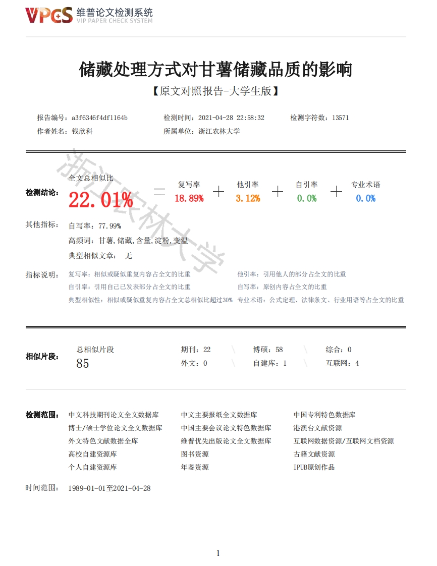 维普论文检测系统VIP PAPER CHECK SYSTEM储藏处理方式对甘薯储藏品质的影响【原文对照报告-大学生版】报告编号:a3f6346f4df1164b检测时间:2021-04-2822:58:32检测字符数:13571作者姓名:钱欣科所属单位:浙江农林大学全文总相似比复写率他引率自引率专业术语检测结论:22.01%18.89%3.12%0.0%0.0%其他指标:自写率:77.99%高频词:甘薯,储藏,含量,淀粉,变温典型相似文章:无指标说明:复写率:相似或疑似重复内容占全文的比重他引率:引用他人的部分占全文的比重自引率:引用自己已发表部分占全文的比重自写率:原创内容占全文的比重典型相似性:相似或疑似重复内容占全文总相似比超过30%专业术语:公式定理、法律条文、行业用语等占全文的比重总相似片段期刊:22博硕:58综合:0相似片段:85外文:0自建库:1互联网:4检测范围:中文科技期刊论文全文数据库中文主要报纸全文数据库中国专利特色数据库博士/硕士学位论文全文数据库中国主要会议论文特色数据库港澳台文献资源外文特色文献数据全库维普优先出版论文全文数据库互联网数据资源/互联网文档资源高校自建资源库图书资源古籍文献资源个人自建资源库年鉴资源IPUB原创作品时间范围:1989-01-01至2021-04-28维普论文检测系统VIP PAPER CHECK SYSTEM原文对照颜色标注说明:■自写片段■复写片段(相似或疑似重复)口引用片段(引用)■专业术语(公式定理、法律条文、行业用语等)本科生毕业设计(论文)(2021届)农业与食品科学学院大学题目:储藏处理方式对甘薯储藏品质的影姓名:钱欣科学号:201720080218专业班级:食品科学与工程(粮油储检)172班指导教师:庞林江职称:讲师教授本科生毕业设计(论文)诚信承诺书我谨在此承诺:本人所写的毕业设计(论文)《储藏处理方式对甘薯储藏品质的影响》均系本人独立完成,没有抄袭行为,凡涉及其他作者的观点和材料,均作了引用注释,如出现抄袭及侵犯他人知识产权的情况,后果由本人承担。承诺人(签名):年月日储藏处理方式对甘薯储藏品质的影响农业与食品科学学院粮储172钱欣科指导教师:庞林江摘要:【目的】为了提高甘薯的储藏品质,本课题旨在研究变温储藏对于甘薯储藏品质的影响。【方法】定期测定变温储藏与恒温储藏两种不同温度处理下,两种甘薯各自的失重率、淀粉含量、淀粉酶活性、还原糖含量与可溶性糖含量五类指标,研究变温储藏对甘薯储藏品质的影响。【结果】不论是变温储藏还是常温储藏,两种甘薯的可溶性糖含量、还原糖含量、淀粉酶活性和失重率均体现出缓慢上升趋势,而淀粉含量则在逐渐下降。在进行变温储藏下的甘薯,五种指标的变化幅度均比对照组的变化幅度小。【结论】因此,可以认为变温储藏的方式对于甘薯储藏品质保证有较好的效果。关键词:甘薯:变温储藏:储藏方式:储藏品质2维普论文检测系统VIP PAPER CHECK SYSTEMEffects of storage treatment methods onsweet potato storage qualityAbstract:Objectiv]In order to improve the storage quality of sweet potatoes,this projectaims to study the effect of variable temperature storage on the storage quality of sweet potatoes.[Method Regularly determine the five types of indexes of weight loss rate,starch content,amylaseactivity,reducing sugar content and soluble sugar content of the two kinds of sweet potatoes undertwo different temperature treatments of variable temperature storage and constant temperaturestorage,and study the effect of variable temperature storage on sweet potato storage quality Impact.[Results]The soluble sugar content,reducing sugar content,amylase activity and weight loss rateof the two kinds of sweet potatoes showed a slow upward trend,whether it was stored at variabletemperature or at room temperature,while the starch content was gradually decreasing.In the sweetpotato under variable temperature storage,the change range of the five indicators was smaller thanthat of the control group.[Conclusion Therefore,it can be considered that the variabletemperature storage method has a better effect on the quality assurance of sweet potato storage.Keywords:sweet potato;variable temperature storage:storage method:storage quality目录1前言41.1甘薯概述41.2国内甘薯储藏现状41.3论文的目的与意义41.4研究内容52材料与方法6农林大学2.1材料62.2储藏条件62.3方法62.3.1失重率测定62.3.2淀粉含量测定62.3.2.1标准曲线的制作62.3.2.2样品提取72.3.2.3测定72.3.2.4计算结果72.3.3淀粉酶活性测定82.3.3.1标准曲线制作82.3.3.2酶液制备82.3.3.3活性测定82.3.3.4计算结果82.3.4还原糖含量测定92.3.4.1标准曲线制作92.3.4.2还原糖的提取92.3.4.3显色和比色92.3.4.4计算结果92.3.5可溶性糖含量测定102.3.5.1标准曲线的制作102.3.5.2可溶性糖的提取102.3.5.3可溶性糖的测定102.3.5.4计算结果103结果与分析123