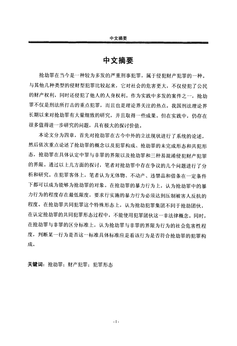 中文摘要中文摘要抢劫罪在当今是一种较为多发的严重刑事犯罪,属于侵犯财产犯罪的一种。与其他几种类型的侵财型犯罪比较起来,它对社会的危害更大,不仅侵犯了公民的财产权利,同时还侵犯了他人的人身权利。作为实践中多发的案件之一,抢劫罪不仅是刑法所打击的重点犯罪,而且也是理论界关注的热点。我国刑法理论界长期以来对抢劫罪有大量细致的研究,并且取得一些成果。但在实践中,仍存在很多值得进一步研究的问题,具有极大的探讨价值。本论文分为四章,首先对抢劫罪在古今中外的立法现状进行了系统的论述,然后依次重点论述了抢劫罪的概念以及犯罪构成、抢劫罪的未完成形态和共犯形态,抢劫罪在具体认定中罪与非罪的界限以及抢劫罪和三种易混淆侵犯财产犯罪的界限。通过以上几方面的探讨,笔者对抢劫罪中存在争议的几个问题进行了分析和研究。在犯罪客体上,笔者认为无体物、不动产、违禁品和借条在一定条件下都可以成为能够为抢劫罪的对象。在抢劫罪的暴力行为上,认为抢劫罪中的暴力行为的程度存在最低限度,要求行实施的暴力行为必须达到压制被害人反抗的程度。在抢劫罪共同犯罪这个特殊形态上,认为抢劫犯罪集团不同于抢劫团伙,在认定抢劫罪的共同犯罪形态过程中,不能使用犯罪团伙这一非法律概念。同时,在抢劫罪与非罪的区分标准上,认为抢劫罪与非罪的界限为行为的社会危害性程度,判断某一行为是否这一标准具体标准应是看该行为是否符合抢劫罪的犯罪构成。关键词:抢劫罪;财产犯罪:犯罪形态黑龙江大学硕士学位论文Y2323882AbstractRobbery is a common and frequent serious criminal offence,is a kind of violationof property crime today.Compared with other types of property crimes,robbery hasmore serious social harmfulness,because it not only violated the citizen's propertyrights,but also violated the human rights of others.As one of multiple cases in practice,robbery is not only to crack down on the crime of the focus of the criminal law,but alsothe hot spot in the theoretical circle.This paper is divided into four chapters.At first,the author introduce the presentlegislation situation of robbery in China and other foreign countries systematically,thenmainly discuss the concept of robbery ,crime constitution,unfinished form andaccomplice form of robbery,robbery crime and non crime in concrete determinationlimit,and the boundaries of robbery and other three easily confused property crimes.Through the discussion of the above several aspects,the author analysises and discussesseveral qusetions which exist controvery.On the object of the crime,the authorconsiders that res incorporales,real estate,contraband and receipt can be able to theobject of robbery in certain conditions.On robbery violence,the author thinks thedegree of violence in the robbery exists the lowest limit,requests violence must reachthe level of repression against the victim.On the special form of jointrobbery ,considers that robbery criminal group is different from robbery criminal gang.Criminal gangs that non legal concept can not be used in the process of cognizancerobbery forms of joint crime.On the boundaries of robbery,the autnor considers thatdistinguishing standard of robbery should be the social harmful degree of a behavior,when we determine whether a behavior fit the specific standard,the behavior should befit the the robbery crime constitution.Keywords:Robbery;Property crime;Crinimal pattern目录目录中文摘要…Abstract.......绪论…一、选题背景和研究意义…二、研究内容与方法…三、文献综述…第一章抢劫罪概述第一节中国历代对抢劫罪的刑事规范,第二节国外惩治抢劫罪的立法状况…本章小结…第二章抢劫罪的概念及犯罪构成…8第一节抢劫罪的概念……8第二节抢劫罪的基本构成要件……9一、抢劫罪的客体要件…10二、抢劫罪的客观方面要件…13三、抢劫罪的主体要件…++16四、抢劫罪的主观方面要件…17本章小结…17第三章抢劫罪的特殊形态…18第一节抢劫罪的未完成形态…4*444+18一、抢劫罪的预备形态18二、抢劫罪的中止形态…三、抢劫罪的未遂形态…19第二节抢劫罪的共犯形态……20