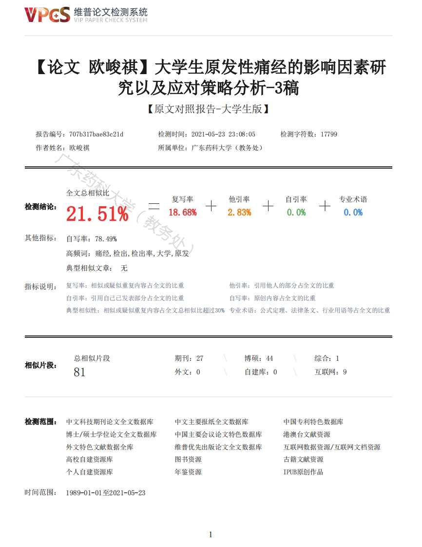 维普论文检测系统/IP PAPER CHECK SYSTEM【论文欧峻祺】大学生原发性痛经的影响因素研究以及应对策略分析-3稿【原文对照报告-大学生版】报告编号:707b317bae83c21d检测时间:2021-05-2323:08:05检测字符数:17799作者姓名:欧峻祺所属单位:广东药科大学(教务处)全文总相似比复写率他引率自引率专业术语检测结论:21.51%18.68%2.83%0.0%0.0%其他指标:自写率:78.49%教务高频词:痛经,检出,检出率,大学,原发典型相似文章:无指标说明:复写率:相似或疑似重复内容占全文的比重他引率:引用他人的部分占全文的比重自引率:引用自己已发表部分占全文的比重自写率:原创内容占全文的比重典型相似性:相似或疑似重复内容占全文总相似比超过30%专业术语:公式定理、法律条文、行业用语等占全文的比重总相似片段期刊:27博硕:44综合:1相似片段:81外文:0自建库:0互联网:9检测范围:中文科技期刊论文全文数据库中文主要报纸全文数据库中国专利特色数据库博士/硕士学位论文全文数据库中国主要会议论文特色数据库港澳台文献资源外文特色文献数据全库维普优先出版论文全文数据库互联网数据资源/互联网文档资源高校自建资源库图书资源古籍文献资源个人自建资源库年鉴资源IPUB原创作品时间范围:1989-01-01至2021-05-23维普论文检测系统VIP PAPER CHECK SYSTEM原文对照颜色标注说明:■自写片段■复写片段(相似或疑似重复)■引用片段(引用)■专业术语(公式定理、法律条文、行业用语等)GUANGDONG PHARMACEUTICAL UNIVERSITGDPU本科毕业论文(设计)大学生原发性痛经的影响因素研究以及应对策略分析二级学院健康学院专业健康服务与管理班级2017级(1)班学生姓名欧峻祺学号1701802146指导教师温秀云2021年5月诚信声明我声明,所呈交的毕业论文(设计)是本人在老师指导下进行的研究工作及取得的研究成果。据我查证,除了文中特别加以标注和致谢的地方外,论文(设计)中不包含其他人已经发表或撰写过的研究成果,也不包含为获得其他教育机构的学位或证书而使用过的材料。我承诺,论文(设计)中的所有内容均真实、可信。毕业论文(设计)作者(签名):年月日大学生原发性痛经的影响因素研究以及应对策略分析2维普论文检测系统VIP PAPER CHECK SYSTEM【摘要】目的:调查研究大学生群体原发性痛经的影响因素,并提出相关建议和应对策略。方法:采用以《女大学生身心健康调查问卷》和《PQ-9量表》为基础的自制量表,运用随机抽样的方法,对广东某大学共232名学生进行原发性痛经情况进行调查,使用s即ss23.0对收集数据进行描述性统计、相关性分析。结果:1.一般情况对学生发放电子问卷,共回收232份,按照剔除标准剔除后,有效问卷共计193份,有效率为83.18%。其中,平均年龄为21.0士1.7岁,平均身高为1.62士0.05米,平均体重为53.3±8.2千克。2.痛经检出情况193位女生中161人患有原发性痛经,痛经检出率为83.42%,其中轻度痛经占45.34%,中度痛经占40.37%,重度痛经占14.28%。3.影响因素根据原发性痛经暴露因素进行单因素分析,年龄、家族痛经史、初潮痛经、情绪、睡眠质量与痛经的检出率差异具有统计学意义(P<0.O5),BWI、年级、成长环境、经济收入、初潮年龄、经血颜色、经血量与痛经检出率差异不具有统计学意义(P>0.05);L0 gisticl回归分析提示年龄与痛经家族史(P<0.05)是原发性痛经的影响因素,年龄与痛经家族史都为暴露因素(OR>1)。结论:1.该药科大学的女生原发性痛经检出率为83.42%,轻度痛经占45.34%,占比最大。2.影响该校女大学生原发性痛经的因素有年龄、痛经家族史、初潮痛经、情绪以及睡眠质量:危险因素为年龄和痛经家族史。3.原发性痛经以防痛为主,进行健康教育和综合干预,并且培养良好的情绪、保证充足的睡眠、饮食均衡、注意保暖。【关键词】:原发性痛经;女大学生:睡眠质量:情绪:影响因素AbstractObjectiveTo investigate the influencing factors of primary dysmenorrhea in college students,and to putforward relevant suggestions and coping strategies.MethodsUsing the self-made scale based on "Female College Students'Physical and Mental HealthQuestionnaire"and "PHQ-9 Scale",and using the method of random sampling,232 students in GuangdongPharmaceutical University were investigated on their primary dysmenorrhea.SPSS23.0 was used to makedescriptive statistics and correlation analysis of the collected data.Result1.In general,232 electronic questionnaires were sent to students,and after eliminating themaccording to exclusion criteria,there were 193 valid questionnaires,with an effective rate of83.18%.Among them,the average age is 21.0+1.7 years old,the average height is 1.62+0.05 meters,the average weight is 53.348.2 kg.Among the 193 girls,161 suffered from primary dysmenorrhea,and the detection rate ofdysmenorrhea was 83.42%.Among them,mild dysmenorrhea accounted for 45.34%,moderate dysmenorrheaaccounted for 40.37%and severe dysmenorrhea accounted for 14.28%.3.Univariate analysis was conducted according to primary dysmenorrhea exposure factors,andthere were statistically significant differences in age,family dysmenorrhea history,menarchedysmenorrhea,mood,sleep quality and the detection rate of dysmenorrhea (P<0.05).BMI,grade,growing environment,economic income,age of menarche,color of menstrual blood,volume of menstrualblood and dysmenorrhea detection rate had no statistical significance (P>0.05).Logistic regressionanalysis indicated that age and family history of dysmenorrhea (P<0.05)were the influencing factorsof primary dysmenorrhea,and both age and family history of dysmenorrhea were exposure factors(OR>1).3