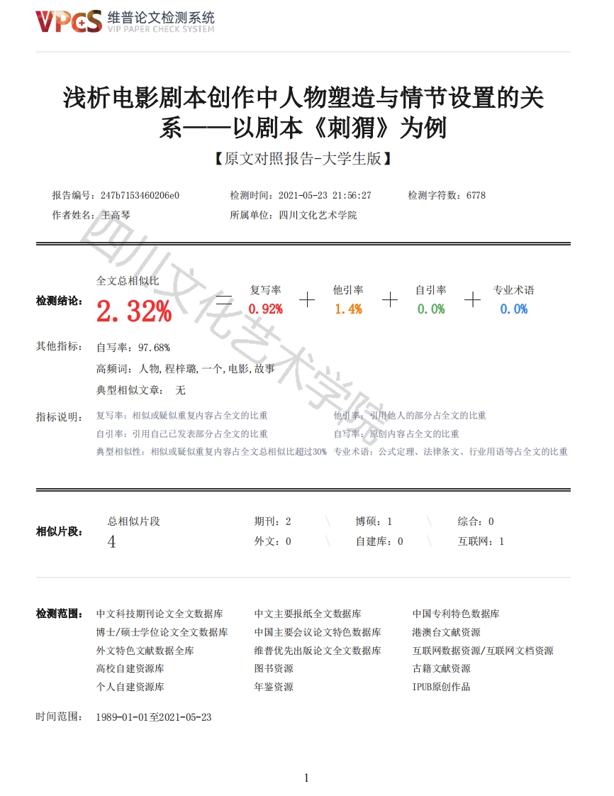 维普论文检测系统/IP PAPER CHECK SYSTEM浅析电影剧本创作中人物塑造与情节设置的关系一一以剧本《刺猬》为例【原文对照报告-大学生版】报告编号:247b7153460206e0检测时间:2021-05-2321:56:27检测字符数:6778作者姓名:王高琴所属单位:四川文化艺术学院全文总相似比复写率他引率自引率专业术语检测结论:2.32%0.92%1.4%0.0%0.0%其他指标:自写率:97.68%高频词:人物,程梓璐,一个,电影,故事典型相似文章:无指标说明:复写率:相似或疑似重复内容占全文的比重他引率:引用他人的部分占全文的比重自引率:引用自己已发表部分占全文的比重自写率:原创内容占全文的比重典型相似性:相似或疑似重复内容占全文总相似比超过30%专业术语:公式定理、法律条文、行业用语等占全文的比重总相似片段期刊:2博硕:1综合:0相似片段:4外文:0自建库:0互联网:1检测范围:中文科技期刊论文全文数据库中文主要报纸全文数据库中国专利特色数据库博士/硕士学位论文全文数据库中国主要会议论文特色数据库港澳台文献资源外文特色文献数据全库维普优先出版论文全文数据库互联网数据资源/互联网文档资源高校自建资源库图书资源古籍文献资源个人自建资源库年鉴资源IPUB原创作品时间范围:1989-01-01至2021-05-23维普论文检测系统VIP PAPER CHECK SYSTEM原文对照颜色标注说明:■自写片段■复写片段(相似或疑似重复)口引用片段(引用)■专业术语(公式定理、法律条文、行业用语等)摘要人物和情节通常是人们讨论一部作品的首选元素,所以对剧本里人物塑造和情节设置的关系地正确把握是编剧创作剧本的必备能力。本文结合自身创作的电影剧本《刺猬》去分析两者之间的关系,并且深层论述自身创作剧本中的主题。关键词:人物塑造:情节设置:电影剧本;编剧AbstractCharacters and plots are usually the preferred elements for people to discuss a work,so acorrect grasp of the relationship between character shaping and plot setting in a script is anessential ability for screenwriters to write scripts.This paper combines the film script "TheHedgehog"to analyze the relationship between the two,and deeply discusses the theme of their ownscript creation.Keywords character shaping:plot settings:screenplay:screenwriter一、创作简介(一)选题意义成长是每个人的必修课。在成长过程中,每一个个体在面对困难时所产生的态度和做出的反应都是不一样的,有人放弃挣扎、选择逃避,有人积极面对、迎难而上。也正因如此,才造就了世界上每一个个体不一样的人生走向,丰富了人类个体生命的多样性。而在人们漫长生命中,青春时期的最后一个阶段一一大学阶段,大学生在这样一个逼近社会状态的小型社会里,可以自由支配自己行动的同时,也面对着无数的选择和诱惑。作为一个毫无经验的社会小白,该如何完成人生身份的转变,成长为一个合格且独立的成年人,是所有大学生们需要思考的人生问题。我选择创作电影剧本《刺猬》,是想通过所学专业知识塑造一个女大学生在大学阶段向社会求生存的人物,讲述女主人公收获友情、经历爱情、与职场人斗智斗勇锻炼了坚强意志的故事。希望更多处在黑暗中的人可以拥有不放弃的精神,在面对复杂的社会时可以像一只刺猬一样,有自己的光芒也有自己的锋芒。同样也向社会表达年轻人不怕接受困难的磨练,敢于成长的坚定立场。(二)分工与职责内容创作是一部影视作品完成的前期工作,作品呈现的效果如何与内容的质量有很大的关系。电影艺术来源于生活又高于生活,这就意味着作为创作者的编剧,本身需要拥有一定的生活阅历,创作出来的作品才能如实的反映社会真实。作为一名编剧,要第一时间确定剧本的主题与方向,另外,要确定故事路线的发展方向,注意故事的连贯性和转折点,提升故事的有趣性,注意故事开头、高潮和结尾的篇幅。还有一点重要的,要确定鲜明的人物形象,提高观众对角色的记忆点,要合理处理角色性格转变的地方。对于细节,注意人物台词、人物服饰的运用需贴合剧情中人物的设定。编剧的工作就是创造出一个新的鲜活的生命,当角色的人生开始时,电影也就开始了。2维普论文检测系统VIP PAPER CHECK SYSTEM二、电影刷本《刺猬》中人物塑造与情节设置(一)人物形象塑造人物塑造作为剧本创作的灵魂,是剧本创作的第一要务[1]。人性是复杂的,将一个人完整的呈现在有限时间的电影里是不可能的,所以要设计并突出人物最鲜明的特点,提高观众对角色的记忆点。能被观众记住的角色必然是一个成功的角色。1.人物形象塑造方法一一造型形象比起文学剧本创作,电影剧本创作领域会更加注重观众视觉上的描写,人物出现的第一个画面,即人物造型形象,必然决定了该角色在观众心里的基础定位。在张艺谋导演的电影《金陵十三钗》中,十三位秦淮河女子一起出现在教堂门口想要进去躲避战争,在其他人不断质问是否真的说好可以进去避难的时候,镜头特写倪妮饰演的女子,时髦的发型,细长的眉毛,精致的妆容,淡定有神的眼睛,优雅地倚靠在一旁墙壁上,从容不迫地拿出烟,给人一种极具欣赏价值且独有韵味的感觉,不同于以往古代风尘女子透露出的轻浮肤浅之气,更加吸引了观众对十三位秦淮河女子的好奇心。可见,人物外在形象是观众对角色的基本感知。在我的电影剧本《刺猬》中,女主人公程梓璐出现的第一个画面是她坐公交车去上班的画面,此时的她被裹