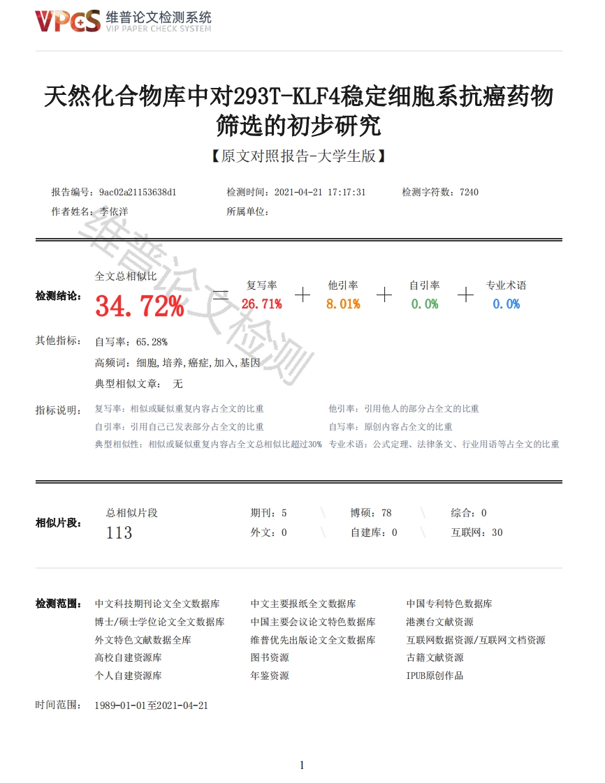维普论文检测系统VIP PAPER CHECK SYSTEM天然化合物库中对293T-KLF4稳定细胞系抗癌药物筛选的初步研究【原文对照报告-大学生版】报告编号:9ac02a21153638d1检测时间:2021-04-2117:17:31检测字符数:7240作者姓名:李依洋所属单位:全文总相似比复写率他引率自引率专业术语检测结论:34.72%26.71%8.01%0.0%0.0%其他指标:自写率:65.28%高频词:细胞,培养,癌症,加入,基因典型相似文章:无指标说明:复写率:相似或疑似重复内容占全文的比重他引率:引用他人的部分占全文的比重自引率:引用自己已发表部分占全文的比重自写率:原创内容占全文的比重典型相似性:相似或疑似重复内容占全文总相似比超过30%专业术语:公式定理、法律条文、行业用语等占全文的比重总相似片段期刊:5博硕:78综合:0相似片段:113外文:0自建库:0互联网:30检测范围:中文科技期刊论文全文数据库中文主要报纸全文数据库中国专利特色数据库博士/硕士学位论文全文数据库中国主要会议论文特色数据库港澳台文献资源外文特色文献数据全库维普优先出版论文全文数据库互联网数据资源/互联网文档资源高校自建资源库图书资源古籍文献资源个人自建资源库年鉴资源IPUB原创作品时间范围:1989-01-01至2021-04-21维普论文检测系统VIP PAPER CHECK SYSTEM原文对照颜色标注说明:■自写片段■复写片段(相似或疑似重复)引用片段(引用)■专业术语(公式定理、法律条文、行业用语等)第一章引言1.1癌症根据世界卫生组织国际癌症研究机构(IARC)在柳叶刀发布的2020年全球最新癌症数据显示,我国新发癌症人数以及癌症死亡人数均位居全球第一,新发癌症457万人,癌症死亡300万人[1]。1.1.1主要癌症分类如结直肠癌、胃癌、肝癌、宫颈癌等都为全球发病率前十的癌症,皆会对人体产生较大危害,但因其数据与下文大体相似,故在此不再展开详表。肺癌于2020年全球癌症死亡病例共996万例,其中肺癌死亡180万例,远超其他癌症类型,位居癌症死亡人数第一。原发性支气管肺癌,简称肺癌为原发为肺部的恶性肿瘤,无传染性,但有一定的家族聚集性,且易向脑转移形成肺癌脑转移瘤[2]。乳腺癌于2020全球乳腺癌新发病例达到226万例,为世界第一大癌。其中三阴性乳腺癌(Triple-negative breast cancer,TNBC)约占所有乳腺恶性肿瘤的20%。TBC是乳腺癌中侵袭性最强的亚型,并且因缺乏靶向治疗,患者预后较差[6,7][3]。由于其高度转移和侵袭性,一旦发生转移,中位总生存率仅为12个月[4]。前列腺癌在2020年新发病例141万例,占男性新发病例总数14.1%。前列腺癌(prostate cancer,PC)是最具侵蚀性的恶性肿瘤之一[]。通过化学或手术去势的雄激素剥夺疗法可以有效的控制前列腺癌,但如果发展为去势抗性前列腺癌(Castration resistant prostate cancer,CRPC),那么现如今并没有针对此有效的治疗方法。1.1.2癌的基本特征癌(cancer)在医学上指起源于上皮细胞的恶性肿瘤,癌细胞是由正常细胞因内外环境因素的作用下经基因突变积累形成的不受机体控制、连续进行分裂的恶行增值细胞,目前发现的突变基因有抑癌基因的53、RB、APC等,癌基因有MIC、FOS、FGFR1等。癌症现如今泛指所有的恶性肿瘤,具有细胞分化和增殖异常、生长失去控制、浸润性和转移性等生物学特征[6]。1.1.3癌的治疗恶性肿瘤,即癌症,是危害人民健康的一类疾病,通过对肿瘤的早期诊断和治疗,可以显著提高患者的长期生存率,对肿瘤的治疗起到积极作用[5]。但多数患者确诊时,癌症已经发展到了中晚期,最佳治疗时间已经丧失,例如胃癌(gastric cancer,GC)[4]。癌症的治疗包括:手术切除、放疗、化疗、靶向治疗、中医治疗等,其中化疗是目前有效的治疗手段之一,常见的化疗手段是以铂类药物为主的联合化疗方案,通过在癌症部位给药或全身给药的方式抑制癌细胞的生长、增殖,从而延缓患者的病情,提高患者的生存概率[5]。虽然目前化疗在肿瘤临床的治疗中具有良好的效果,但在治疗过程中发现,药物化疗过程中常出现肿瘤耐药,导致化疗效果的不佳甚至治疗失败[5]。1.2KLF4转录因子1.2.1KLF4的基本概念KLF4(Kruppel-like factor4)是锌指蛋白类转录因子家族中的一个转录因子,定位于人体染色体9g31[5],2维普论文检测系统VIP PAPER CHECK SYSTEM在细胞的增殖、分化以及凋亡中起到重要作用。锌指(zinc finger)蛋白,指的是由一个含有约30个氨基酸的环和一个与环上的4个半胱氨酸(Cys)或2个Cys和2个组氨酸(His)配位的Z2+构成,形成的结构像手指状,常出现在DNA结合蛋白质中的一种结构基元。转录因子(transcription factor)是一群能与基因5端上游特定序列专一性结合,从而保证目的基因以特定的强度在特定的时间与空间表达的蛋白质分子。1.2.2LF4在癌定中的表达转录因子KLF4在人类癌症中是作为一个抑癌基因或癌基因进行表达,在大多数癌症中作为抑癌基因表达[9],即KL4的表达上调会抑制细胞增殖,诱导细胞调亡,并促进细胞周期停滞,但在某些肿瘤当中,例如乳腺癌中,则具有癌基因特性。即促进肿瘤生长,促进癌细胞去分化和抑制细胞调亡的作用[5]。1.2.3KLF4在癌症中的作用机制KLF4在各个癌症中作用机制不尽而同,例如在胃癌与卵巢癌中起抑癌基因的作用[10-11],而在口腔鳞癌与乳腺癌中则起到癌基因的作用[12-13]。在胃癌中LAMC1蛋白可促进胃癌细胞的增殖及侵蚀转移能力,而miR-195-5p可靶向结合结合LAMC1mRNA的3UTR区,抑制LAMC1mNA的表达,而KLF4可靶向结合miR-195-5p启动子并促进其进