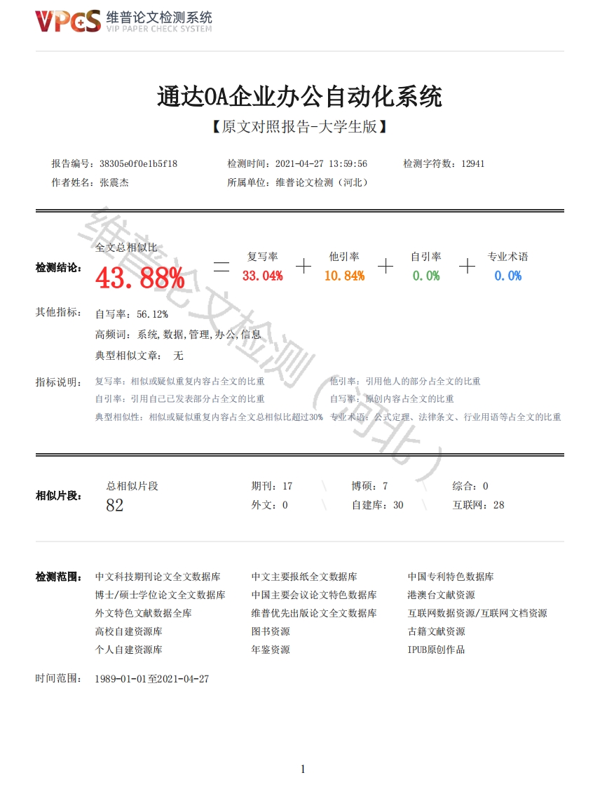 维普论文检测系统VIP PAPER CHECK SYSTEM通达OA企业办公自动化系统【原文对照报告-大学生版】报告编号:38305e0f0e1b5f18检测时间:2021-04-2713:59:56检测字符数:12941作者姓名:张震杰所属单位:维普论文检测(河北)全文总相似比复写率他引率自引率专业术语检测结论:43.88%33.04%10.84%0.0%0.0%其他指标:自写率:56.12%高频词:系统,数据,管理,办公,信息典型相似文章:无指标说明:复写率:相似或疑似重复内容占全文的比重他引率:引用他人的部分占全文的比重自引率:引用自己已发表部分占全文的比重自写率:原创内容占全文的比重典型相似性:相似或疑似重复内容占全文总相似比超过30%专亚术语:公式定理、法律条文、行业用语等占全文的比重总相似片段期刊:17博硕:7综合:0相似片段:82外文:0自建库:30互联网:28检测范围:中文科技期刊论文全文数据库中文主要报纸全文数据库中国专利特色数据库博士/硕士学位论文全文数据库中国主要会议论文特色数据库港澳台文献资源外文特色文献数据全库维普优先出版论文全文数据库互联网数据资源/互联网文档资源高校自建资源库图书资源古籍文献资源个人自建资源库年鉴资源IPUB原创作品时间范围:1989-01-01至2021-04-27维普论文检测系统VIP PAPER CHECK SYSTEM原文对照颜色标注说明:■自写片段■复写片段(相似或疑似重复)口引用片段(引用)■专业术语(公式定理、法律条文、行业用语等)学士学位论文通达OA企业办公自动化系统姓名张震杰指导教师何志强普论文检测(河学号20171204011021院系信息工程与计算机学院专业计算机科学与技术二零二一年四月二十日学位论文原创性声明本人所提交的学位论文是在导师的指导下独立进行研究工作所取得的原创性成果。除文中已经注明引用的内容外,本论文不包含任何其他个人或集体已经发表或撰写过的研究成果。对本文的研究做出重要贡献的个人和集体,均已在文中标明。本声明的法律后果由本人承担。论文作者(签名):指导教师确认(签名):年月日年月日学位论文版权使用授权书本学位论文作者完全了解河北金融学院有权保留并向国家有关部门或机构送交学位论文的复印件和磁盘,允许论文被查阅和借阅。本人授权河北金融学院可以将学位论文的全部或部分内容编入有关数据库进行检索,可以采用影印、缩印或其它复制手段保存、汇编学位论文。论文作者(签名):指导教师(签名):年月日年月摘要随着互联网技术的迅猛发展,它已渗透到生产生活的方方面面[1],各种各样的高新技术已经逐渐得到运用。在办公室工作中,常规的办公模式已经在信息技术的辅助下过渡到了自动化办公阶段。0A办公自动化系统已经成为相关机构中十分重要的一个模块,尤其是在当下市场竞争激烈的情况下,办公自动化系统已经是一个企业或单位必不可少的部分,这一系统的引入也在不断地提升单位办公品质、办公效率等[2]。本文的主要内容有:首先简单介绍了研究0A办公自动化管理系统的背景。其次,简要介绍了系统所使用的框架和技术一一S$H和JSP。然后由需求分析决定本系统的设计方案,再到系统的详细设计,从系统的构架、功能模块和关键的技术点对0A办公自动化管理系统进行开发。最终决定以esclipe作为开发工具,后台以mysql为数据库,并结2维普论文检测系统VIP PAPER CHECK SYSTEM合ssh框架实现。最后:完成测试阶段。关键词:企业OA办公自动化系统:SSH;MySql;B\S;JSPABSTRACTWith the rapid development of Internet technology,it has penetrated into all aspects ofproduction and life,and all kinds of high and new technologies have been gradually applied.Inoffice work,the conventional office mode has been transferred to the automated office stage withthe assistance of information technology [l].OA office automation system has become a veryimportant module in relevant institutions.Especially in the current fierce market competition,theoffice automation system has become an indispensable part of an enterprise or unit.The introductionof this system is also constantly improving the quality and efficiency of the unit's office work [2].The main content of this paper is as follows:Firstly,the background of 0A management system isbriefly introduced.Secondly,it briefly introduces the framework and technology used by the system--SSH and JSP.Then,the design scheme of the system is determined by the demand analysis,and thenthe detailed design of the system is carried out.The 0A office automation management system isdeveloped from the framework,functional modules and key technical points of the system.Finally,wedecided to use esclipe as the development tool,MySQL as the database in the background,andcombined with SSH framework to achieve.Finally:Complete the test phase.Keywords:Enterprise 0A Automation System SSH MYSQL:B S JSP目录第一章绪论11.1研究背景11.20A办公系统的概念11.30A办公系统的意义11.4本章小结3第二章相关技术介绍42.1后台介绍42.1.1B/S平台模式42.1.2MWC42.1.3 Spring52.2前端介绍62.2.1JSP网页技术62.3本章小结6第三章系统分析73.1可行性分析73.1.1技术可行性73.1.2操作可行性73.2需求分析73.2.1系统总体需求73.2.2总体功能模块123.3本章小结12第四章数据库设计134.1系统和数据的关系134.2数据库结构设计134.3数据库逻辑结构设计154.4本章小结183