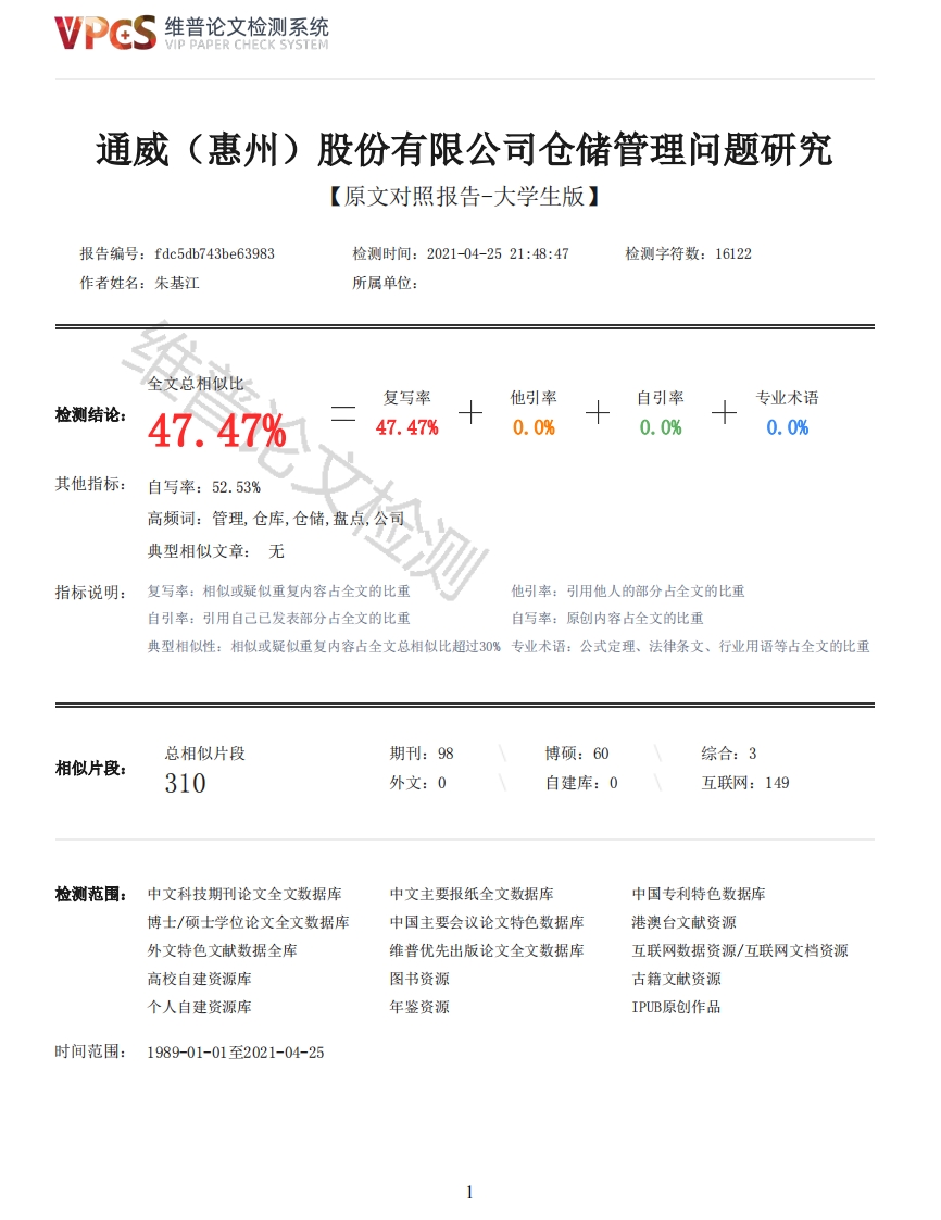 维普论文检测系统/IP PAPER CHECK SYSTEM通威(惠州)股份有限公司仓储管理问题研究【原文对照报告-大学生版】报告编号:fdc5db743be63983检测时间:2021-04-2521:48:47检测字符数:16122作者姓名:朱基江所属单位:全文总相似比复写率他引率自引率专业术语检测结论:47.47%47.47%0.0%0.0%0.0%其他指标:自写率:52.53%高频词:管理,仓库,仓储,盘点,公司典型相似文章:无指标说明:复写率:相似或疑似重复内容占全文的比重他引率:引用他人的部分占全文的比重自引率:引用自己已发表部分占全文的比重自写率:原创内容占全文的比重典型相似性:相似或疑似重复内容占全文总相似比超过30%专业术语:公式定理、法律条文、行业用语等占全文的比重总相似片段期刊:98博硕:60综合:3相似片段:310外文:0自建库:0互联网:149检测范围:中文科技期刊论文全文数据库中文主要报纸全文数据库中国专利特色数据库博士/硕士学位论文全文数据库中国主要会议论文特色数据库港澳台文献资源外文特色文献数据全库维普优先出版论文全文数据库互联网数据资源/互联网文档资源高校自建资源库图书资源古籍文献资源个人自建资源库年鉴资源IPUB原创作品时间范围:1989-01-01至2021-04-25维普论文检测系统VIP PAPER CHECK SYSTEM原文对照颜色标注说明:■自写片段■复写片段(相似或疑似重复)口引用片段(引用)■专业术语(公式定理、法律条文、行业用语等)通威(惠州)股份有限公司仓储管理问题研究【摘要】当今时代是一个经济快速发展的时代,为了能够与”快“时代相适应,仓储管理成为了企业在管理中的一个重要环节。尤其是对于民营企业来说,他们普遍存在成本高、效率低、浪费严重等问题,其粗放仓储的管理,忽略了企业经营过程中对仓储管理环节的优化,导致成本加大,库存积压,企业市场竞争力不强。如果想要让企业在市场上占有优势,必须要根据实际情况去更新技术,同时在此基础上去压缩企业的运营成本。实际上,由于仓储管理的成本在运营成本中占比相对较大,因此现在企业越来越关注仓储的成本投入。本文以通威股份有限公司为研究对象,主要是基于仓储管理的基本理论对通威(惠州)股份有限公司的现状进行具体的分析,发现在仓储管理过程中缺乏先进的仓储设施和设备、仓库库存盘点的管理、管理混乱、绩效考核指标不完善等问题,并针对该企业仓储管理中存在的问题,提出实现仓储作业自动化,完善信息技术,仓库流程的优化,完善绩效考核指标等解决对策,希望能为通威(惠州)股份有限公司仓库管理工作进行改进提供参考与借鉴。【关键词】通威(惠州)股份有限公司:物流:仓储管理Research on Warehouse Management of Tongwei Stock (Huizhou)Co.,Ltd[Abstract]The current era is an era of rapid economic development,in order to be able toadapt to the "fast"era,warehouse management has become an important link in the management ofenterprises.Especially for private enterprises,they generally have problems such as high cost,lowefficiency,serious waste and so on.The extensive warehousing management ignores the optimizationof the warehousing management link in the process of enterprise operation,resulting in increasedcosts,backlog of inventory,and weak market competitiveness of enterprises.If an enterprise wantsto have an advantage in the market,it must update the technology according to the actual situation,and at the same time,reduce the operating cost of the enterprise on this basis.In fact,as thecost of warehousing management in the operating cost of a relatively large proportion,so nowenterprises are more and more concerned about the cost of warehousing investment.Taking TongweiCo.,Ltd as the research object,this paper mainly analyzes the current situation of Tongwei(Huizhou)Co.,Ltd based on the basic theory of warehouse management.Found in the process ofwarehouse management,lack of storage facilities and equipment advanced,storage and informationtechnology is not perfect,management confusion,problems such as imperfect performance evaluationindicators,and aimed at the problems existing in the enterprise warehouse management,put forwardto realize the automatic warehousing operation,improve the information technology,warehouseprocess optimization,improve the performance appraisal indicators such as solutions,hopes to tongwei (huizhou)shares Part of the limited company warehouse management work to improve the referenceand reference.[Key words Tongwei Co.,Ltd.logisticst:Warehouse Management目录2维普论文检测系统VIP PAPER CHECK SYSTEM引言1一、仓储管理概述1(一)仓储的基本概念1(二)仓储管理及其作用11.仓储管理的概念12.仓储管理的作用2(三)仓储管理的入库管理流程分析2(四)仓库管理原则3二、通威(惠州)股份有限公司现状3(一)通威股份有限公司简介3(二)通威(惠州)股份有限公司仓储管理的现状41.仓储部门的现状42.仓储库存盘点管理的现状43.仓储设施和设备现状5三、通威(惠州)股份有限公司仓储管理存在的主要问题5(一)水产品仓库缺乏对仓储设备的管理51.缺少对设备的投资62.没有定期维护设备6(二)仓库库存盘点管理存在的问题71.库存盘点中临时进出货72.库存盘点流程不合理73.盘点人员安排混乱7(三)仓库流程不合理8检测1.仓库作业过程中未对物料进行分类管理82.仓库入库流程不完善8(四)仓库工作人员绩效考核指标不完善91.员工操作不规范92.员工对绩效管理的认识不足9四、通威(惠州)股份有限公司仓储管理问题的解决对策9(一)实现仓储作业自动化91.引入先进设备102.定期维护设备10(二)规范仓库库存盘点管理111