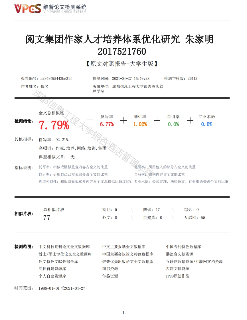 维普论文检测系统/IP PAPER CHECK SYSTEM阅文集团作家人才培养体系优化研究朱家明2017521760【原文对照报告-大学生版】报告编号:a2949495442bc31f检测时间:2021-04-2715:19:28检测字符数:26412作者姓名:佚名所属单位:成都信息工程大学银杏酒店管理学院全文总相似比复写率他引率自引率专业术语检测结论:7.79%6.77%1.02%0.0%0.0%其他指标:自写率:92.21%典型相似文章:无指标说明:复写率:相似或疑似重复内容占全文的比重他引率:引用他人的部分占全文的比重自引率:引用自己已发表部分占全文的比重自写率:原创内容占全文的比重典型相似性:相似或疑似重复内容占全文总相似比超过30%专业术语:公式定理、法律条文、行业用语等占全文的比重总相似片段期刊:5博硕:17综合:0相似片段:77外文:0自建库:0互联网:55检测范围:中文科技期刊论文全文数据库中文主要报纸全文数据库中国专利特色数据库博士/硕士学位论文全文数据库中国主要会议论文特色数据库港澳台文献资源外文特色文献数据全库维普优先出版论文全文数据库互联网数据资源/互联网文档资源高校自建资源库图书资源古籍文献资源个人自建资源库年鉴资源IPUB原创作品时间范围:1989-01-01至2021-04-27维普论文检测系统VIP PAPER CHECK SYSTEM原文对照颜色标注说明:■自写片段■复写片段(相似或疑似重复)口引用片段(引用)■专业术语(公式定理、法律条文、行业用语等)成都信息工程大学银杏酒店管理学院本科生毕业论文(设计)题目阅文集团作家人才培养体系优化研究系别工商管理学院专业人力资源管理专业代码120206学生姓名朱家明学号2017521760班级17人力2班指导教师晏志谦职称副教授阅文集团作家人才培养体系优化研究摘要:随着智能手机、平板电脑等众多移动互联网设备的普及,移动网络的提速和WF覆盖面积的增加,移动互联网用户的访问量近些年来呈现高速增长态势,而网络文学这个新兴行业也随之崛起。网络文学作家作为网络文学行业中的产品输出者,其本身创作能力应该是核心竞争力,而目前的网络文学平台都没有一个行之有效的网文作家人才培养体系用以增强网文作者创作能力和创作兴趣。本文以网络文学企业龙头阅文集团为目标研究对象,利用文献查阅法查阅相关理论知识、利用调查法分析调查目前阅文集团作家人才培养体系的实际内容和实施情况。从阅文集团作家人才的培训体系、激励制度、个人发展三方面进行分析,运用所学的培训需求分析理论、激励理论等对阅文集团作家人才培养体系进行审查和优化,增强整体作家人才培养体系的科学性、合理性,提升阅文集团的竞争力,完善阅文集团的作家培养体系,也是对网文行业供给侧效能的一次改革。关键词:培养体系人才培养网络文学阅文集团Research on Optimization of Writer Talent Training System of Reading GroupAbstract:With the popularization of many mobile Internet devices such as smartphones and tabletcomputers,the acceleration of mobile networks and the increase in WiFi coverage,the traffic ofmobile Internet users has shown rapid growth in recent years,and the emerging industry of onlineliterature has also risen.As a product exporter in the network literature industry,networkliterature writers should have their own creative ability as their core competitiveness.However,none of the current network literature platforms has an effective network literature writer talent2维普论文检测系统VIP PAPER CHECK SYSTEMtraining system to enhance the creative ability and creativity of network writers.Creativeinterest.This article takes the leading online literature company Reading Group as the targetresearch object,using the literature search method to access relevant theoretical knowledge,andusing the survey method to analyze and investigate the actual content and implementation of thecurrent Reading Group's writer talent training system.Analyze the training system,incentivesystem and personal development of the writers of the Reading Group,and use the training demandanalysis theory and motivation theory to review and optimize the training system of the writers ofthe Reading Group to enhance the overall training of writers.The scientificity and rationality ofthe system,enhancing the competitiveness of the Reading Group and improving the writer trainingsystem of the Reading Group are also a reform of the supply-side efficiency of the online literatureindustry.Keywords:Training system Personnel training Network literature Reading group目录1引言11.1研究背景11.2研究意义21.3研究现状21.4研究方法41.4.2调查法42理论综述4都信息工程大学银杏酒店管理学院1.3.1国外研究现状21.3.2国内研究现状31.4.1文献研究法42.1相关概念界定42.1.1网络文学42.1.2网络文学作家52.1.3人才培养体系52.2人才培养体系设计的相关理论基础52.2.1培训需求分析理论52.2.2激励理论63阅文集团作家人才培养体系现状及问题分析73.1阅文集团发展概况73.2阅文集团作家人才培养体系现状分析73.2.1采用专家讲座等面对面培训形式开展作家业务能力培训73.2.2借助作家培训学校和网站内部专栏对作家进行系统培养83.2.3建设作家积分体系激励作家成长103.2.4采用作家分级激励措施激发作家自我培养与成长103.2.5设置作家奖励保障制度助力作家培养113.3阅文集团作家人才培养体系的调查分析133.3.1问卷设计133.3.2问卷调查对象与目的143.3.3问卷发放与回收143.3.4问卷问卷数据输出与分析143.4阅文集团作家人才培养体系问题分析203.4.1培养需求问题分析203.4.2培养计划问题分析203.4.3培养实施问