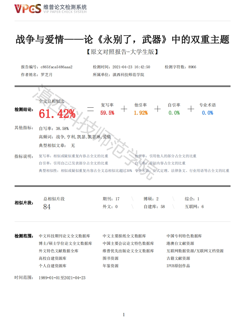 维普论文检测系统/IP PAPER CHECK SYSTEM战争与爱情—一论《永别了,武器》中的双重主题【原文对照报告-大学生版】报告编号:c865faca5486aaa2检测时间:2021-04-2316:42:50检测字符数:8966作者姓名:罗芝月所属单位:滇西科技师范学院全文总相似比复写率他引率自引率专业术语检测结论:61.42%59.5%1.92%0.0%0.0%其他指标:自写率:38.58%高频词:战争,亨利,凯瑟,凯瑟琳,爱情典型相似文章:无指标说明:复写率:相似或疑似重复内容占全文的比重引用他人的部分占全文的比重自引率:引用自己已发表部分占全文的比重自写率:原创内容占全文的比重典型相似性:相似或疑似重复内容占全文总相似比超过30%专业术语:公式定理、法律条文、行业用语等占全文的比重总相似片段期刊:17博硕:2综合:1相似片段:84外文:0自建库:58互联网:6检测范围:中文科技期刊论文全文数据库中文主要报纸全文数据库中国专利特色数据库博士/硕士学位论文全文数据库中国主要会议论文特色数据库港澳台文献资源外文特色文献数据全库维普优先出版论文全文数据库互联网数据资源/互联网文档资源高校自建资源库图书资源古籍文献资源个人自建资源库年鉴资源IPUB原创作品时间范围:1989-01-01至2021-04-23维普论文检测系统VIP PAPER CHECK SYSTEM原文对照颜色标注说明:■自写片段■复写片段(相似或疑似重复)引用片段(引用)■专业术语(公式定理、法律条文、行业用语等)滇西科技师范学院战争与爱情--一论《永别了,武器》中的双重主题学院:文学院专业:汉语言文学年级:2019级学生姓名:罗芝月学号:1901470334指导教师:孔镭职称:讲师论文完成时间:师范学院滇西科技师范学院教务处制滇西科技师范学院毕业论文(设计)原创性声明本人郑重声明:所呈交的论文是本人在导师的指导下独立进行研究所取得的研究成果。除了文中特别加以标注引用的内容外,本论文不包括任何其他个人或集体己经发表或撰写的成果作品。本人完全意识到本声明的法律后果由本人承担。毕业论文(设计)作者签名:日期:年月日本人完全了解滇西科技师范学院有关保留、使用毕业论文(设计)的规定,即:学校有权保留毕业论文并向国家主管部门或其指定机构送交论文的电子版和纸质版。允许论文进入学校图书馆被查阅,学校可以公布论文(设计)的全部或部分内容,有权将毕业论文的内容编入有关数据库进行检索。有权将毕业论文的标题和摘要汇编出版。(保密论文在解密后遵守)指导教师签名:毕业论文(设计)作者签名:日期:年月日摘要《永别了,武器》是美国小说家海明威所创作的长篇小说,这部小说的出版不仅成就了海明威伟大悲剧小说作家的身份,而且因其独特的创作风格成为了一部现代的世界文学名著。战争与爱情是海明威着笔最多的两点,也是故事发展的两条主线。海明威以自己的亲身经历为创作基础,通过描写亨利和凯瑟琳的爱情故事,揭示了战争的荒唐和残酷。战争成就了亨利和凯瑟琳的爱情,同时也在很大程度上毁灭了他们的爱情。本文主要通过爱情和战争的2维普论文检测系统VIP PAPER CHECK SYSTEM关系入手,分析两者之间既相互对立又彼此联系的关系,深入了解小说的反战主题,进而从中领悟到人们厌恶战争、向往和平的理想。关键词:《永别了,武器》:战争:爱情:悲剧:ABSTRACTA Farewell to Arms is a novel by created by Ernest Hemingway,an American novelist.Thepublication of this novel does not reflect Hemingway's great tragedy and identity as a novel writerMoreover it has become a modern world literary classic due to its unique creation style.Ware andlove are the two most frequently written by Hemingway and they are also the two main lines of thestory development.Hemingway with his own experience as his creation,reveals the absurdity andcruelty of war by describing the love story between Henry and Catherine.War made Henry andCatherine's love but also largely destroyed out of their love,this paper analyses the relationshipof love and war,both between each other,each other respectively,the relationship betweenunderstanding the anti-war theme of the novel,thus to realize people hate war,to yearn for the idealof peace.Keywords:Farewell to Arms:The war Love:Tragedy:目录引言1一、《永别了,武器》中的战争主题1(一)亨利的悲剧命运1(二)凯瑟琳的悲剧命运3二、《永别了,武器》中的爱情主题5(一)亨利对爱情的态度5(二)凯瑟琳对爱情的态度7三、战争与爱情的关系8(一)战争促成爱情的产生8师范学院(二)战争阻碍并且破坏了爱情9(三)爱情是向战争永别的力量源泉10结语11参考文献13致谢14引言海明威的战争三部曲之一《永别了,武器》从战争和爱情的双重视角刻画了亨利和凯瑟琳之间的悲剧爱情。海明威通过对两人爱情故事的刻画、人物的设定、悲剧结局的描写,表达了作者对人类精神生存状态的担忧,阐释了死亡意识,赞颂了敢于反抗悲剧命运的英雄们。战争是残酷的,它能摧毁人类的意志和爱。海明威通过这部小说表达了他对战争的厌恶和对和平的渴望。一、《永别了,武器》中的战争主题《永别了,武器》是一部以海明威的战争经历和当时的社会为背景的自传体小说,深刻反映了海明威的世界观、人生观和价值观。小说从战争和爱情两个轴心刻画了亨利和凯瑟琳的爱情悲剧,揭示了战争的残酷、世界的冷漠和人类的之间情感的淡薄。(一)亨利的悲剧命运在《永别了,武器》一书中,海明威讲述了亨利在理想战争与残酷的现实战争的对立及冲突中