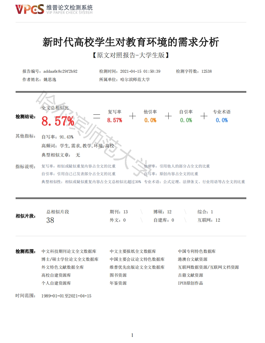 维普论文检测系统VIP PAPER CHECK SYSTEM新时代高校学生对教育环境的需求分析【原文对照报告-大学生版】报告编号:addaa0c8c29f2b92检测时间:2021-04-1501:50:39检测字符数:12538作者姓名:姚思逸所属单位:哈尔滨师范大学全文总相似比复写率他引率自引率专业术语检测结论:8.57%8.57%0.0%0.0%0.0%其他指标:自写率:91.43%高频词:学生,需求,教学,环境,高校典型相似文章:无指标说明:复写率:相似或疑似重复内容占全文的比重引用他人的部分占全文的比重自引率:引用自己已发表部分占全文的比重自写率:原创内容占全文的比重典型相似性:相似或疑似重复内容占全文总相似比超过30%专业术语:公式定理、法律条文、行业用语等占全文的比重总相似片段期刊:13博硕:12综合:1相似片段:38外文:0自建库:0互联网:12检测范围:中文科技期刊论文全文数据库中文主要报纸全文数据库中国专利特色数据库博士/硕士学位论文全文数据库中国主要会议论文特色数据库港澳台文献资源外文特色文献数据全库维普优先出版论文全文数据库互联网数据资源/互联网文档资源高校自建资源库图书资源古籍文献资源个人自建资源库年鉴资源IPUB原创作品时间范围:1989-01-01至2021-04-15维普论文检测系统VIP PAPER CHECK SYSTEM原文对照颜色标注说明:■自写片段■复写片段(相似或疑似重复)口引用片段(引用)■专业术语(公式定理、法律条文、行业用语等)学号:2017020065哈尔滨师范大学学士学位论文题目新时代高校学生对教育环境的需求学生姚思逸指导教师孟庆红年级2017级专业教育技术学系别教育技术学学院教育科学学院范大学哈尔滨师范大学2021年5月目录1.问题提出32.新时代高校教育环境现状32.1物理环境使用32.2心理环境作用43.研究设计43.1研究工具与方法43.2被试的选取43.3研究过程44.不同高校学生对教育环境的需求及改进建议54.1物理环境需求及改进建议54.1.1学生对教学设施的需求及改进建议54.1.2学生对教学场地的需求及改进建议84.2心理环境需求及改进建议114.2.1学生对教学气氛的需求及改进建议115.不同专业学生对教育环境的需求分析145.1物理环境需求及改进建议145.1.1文科学生需求分析145.1.2理科学生需求分析155.2心理环境需求及改进建议155.2.1文科学生需求分析152维普论文检测系统VIP PAPER CHECK SYSTEM5.2.2理科学生需求分析166.不同年级学生对教育环境的需求分析176.1物理环境需求及改进建议176.1.1一至二年级学生需求分析176.1.2三至四年级学生需求分析176.2心理环境需求及改进建议176.2.1一至二年级学生需求分析176.2.2三至四年级学生需求分析187.总结18参考文献19Abstract20致谢21新时代高校学生对教育环境的需求分析姚思逸摘要:出现多媒体教育环境以来,各个高校的学生对教育环境的需求逐渐变化,全国各大高校也开始注重学生对教育环境的需求。从表面上看,教育环境只在学习过程的最外层并且是相对稳定的状态,但其实对学生的学习过程有着潜在的影响,并以其特有的效果对学习过程产生系统性的影响。然而,在实际的高校教学中教育环境仍然存在诸多问题。所以本文按照不同高校、不同年级、不同专业等标准进行了问卷式调查,探究高校学生对于教育环境的需求的不同。各个不用类型的高校学生的意愿及建议都将在本文中呈现出来,希望本文能够以这样的方式促进教育环境的发展以及进一步促进教育水平的发展。本文以问卷调查的方式,对各高校学生对教育环境的需求进行分析。关键词:教育环境:高校学生:学生需求教育环境是学习者进行学习行为最重要的环境,其中包括学校内部的有形物质环境和无形的心理环境,前者包括教学设施、教学场所甚至是讲堂的色彩和光影艺术,后者包括个人及学校精神、教师期望、教学氛围等。现如今,中国各高校教育环境中存在诸多问题,国际上类似高校也存在着相似的问题。其实,教育环境的变革时期处于20世纪80年代,在那时就开始出现采用多种电子媒体如幻灯、投影、录音、录像等综合运用与课堂教学相结合。1.问题提出高校是培养人才的花园,对于学生来说,教育高校环境被誉为“学生的第三任老师”,教育环境的好坏对学生的成长起着至关重要的作用,教育环境是影响高校教学的主要因素之一。教育环境是一个由多种不同要素构成的复杂系统,广义的教学环境是指影响学校教学活动的全部条件(包括物质的和精神的),它可以是物理环境和心理环境。然而目前,各高校对学生教育环境需求的重视程度较小,高校教育环境并没有得到大多数高校的重视。因此对各高校学生对教育环境的需求进行分析是很有必要的。2.新时代高校教育环境现状2.1物理环境使用经查阅文献,物理环境是指教学环境中有形的、静态的硬环境部分,也是我们常说的狭义的教学环境。如自然环境(学校的选址、气候条件、自然景观等),设施环境(教学场所、教学设施、现代化的教学手段、课桌椅、图书资料等),时空环境(教学时间的安排、班级规模、座位编排方式等)。而其中对学生学习过程最具有影响作用的是设施环境即教学设施、教学场地、实验设备等物理环境因素。对物理环境的合理、较好的使用是学生学习成长至关重要的关键一环。2.2心理环境作用新时代的教育环境潜移默化地影响着学生的心灵,丰富着学生的审美能力,使学生的个性得到不断的完善和丰富。在学校的教育活动过