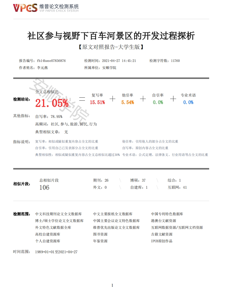 维普论文检测系统/IP PAPER CHECK SYSTEM社区参与视野下百车河景区的开发过程探析【原文对照报告-大学生版】报告编号:fb14beee07836876检测时间:2021-04-2714:45:21检测字符数:11760作者姓名:李元燕所属单位:安顺学院全文总相似比复写率他引率自引率专业术语检测结论:21.05%15.51%5.54%0.0%0.0%其他指标:自写率:78.95%高频词:社区,参与,旅游,居民,行为典型相似文章:无指标说明:复写率:相似或疑似重复内容占全文的比重他引率:引用他人的部分占全文的比重自引率:引用自己已发表部分占全文的比重自写率:原创内容占全文的比重典型相似性:相似或疑似重复内容占全文总相似比超过30%专业术语:公式定理、法律条文、行业用语等占全文的比重总相似片段期刊:26博硕:37综合:1相似片段:106外文:0自建库:1互联网:41检测范围:中文科技期刊论文全文数据库中文主要报纸全文数据库中国专利特色数据库博士/硕士学位论文全文数据库中国主要会议论文特色数据库港澳台文献资源外文特色文献数据全库维普优先出版论文全文数据库互联网数据资源/互联网文档资源高校自建资源库图书资源古籍文献资源个人自建资源库年鉴资源IPUB原创作品时间范围:1989-01-01至2021-04-27维普论文检测系统VIP PAPER CHECK SYSTEM原文对照颜色标注说明:■自写片段■复写片段(相似或疑似重复)口引用片段(引用)■专业术语(公式定理、法律条文、行业用语等)安顺学院安顺学院ANSHUN UNIVERSITY本科毕业论文(2017~2021年)安题目:社区参与视野下百车河景区的开发过程探析院别:旅游学院专业班级:旅游管理2017级学生姓名:李元燕学号:201713024016指导教师:陈斌职称:讲师起讫日期:2020年6月一-一2021年5月安顺学院本科毕业论文原创性申明本人郑重申明:所呈交的论文是本人在导师的指导下独立进行研究所取得的研究成果。除了文中特别加以标注引用的内容外,本论文不包含任何其他个人或集体已经发表或撰写的成果。对本文的研究作出重要贡献的个人和集体,均已在文中以明确方式表明。本人完全意识到本申明的法律后果由本人承担。作者签名:日期:安顺学院本科毕业论文版权使用授权书本毕业论文作者完全了解学校有关保留、使用论文的规定,同意学校保留并向国家有关部门或机构送交论文的复印件和电子版,允许论文被查阅和借阅。本人授权安顺学院可以将本论文的全部或部分内容编入有关数据库进行2维普论文检测系统VIP PAPER CHECK SYSTEM检索,可以采用影印、缩印或扫描等复制手段保存和汇编本论文。作者签名:日期:导师签名:日期:社区参与视野下百车河景区的开发过程探析专业:旅游管理学号:201713024016姓名:李元燕指导教师:陈斌摘要社区参与旅游发展是促进旅游业可持续发展和旅游公平的重要方式和有效手段,但现在却出现了一些旅游景区的居民对于社区参与度仍处于弱势地位的现象,社区居民作为旅游地的核心利益相关者,在旅游开发中处于弱势地位,缺少话语权,参与度不高,这在根本上不利于旅游业可持续发展。本文采用文献研究法与实地调查法,以六盘水市水城县百车河景区周边居民为考察对象,对该地区的社区居民参与旅游过程中存在的种种问题进行分析,以协调当地居民与旅游公司的矛盾,为社区居民获取权益,同时促进旅游开发商在开发过程中与社区居民之间的沟通。最终以促进景区和社区的可持续发展,实现景区和社区共赢的目的。关键词:百车河社区参与开发过程反参与行为Analysis on the development process of Baiche River Scenic Area under the vision of communityparticipationAbstractCommunity participation in tourism development is an important way and effective means topromote sustainable development of tourism and tourism equity,but now it appears the phenomenon oftourism scenic area residents of community participation in a weak position,community residents,which is the core of the tourism destination stakeholders in the tourism development in a weakposition,lack of voice,participation is not high,this fundamentally not conducive to thesustainable development of tourism.In this paper,using the literature research and field surveymethod,shuicheng best car river scenic area in liupanshui city as investigation object,theresidents in the area of community residents to participate in the analysis of existing problems inthe process of tourism,to coordinate the contradiction between local residents and tourismcompanies,access rights for the community residents,and promote the tourism developers in thedevelopment process and the communication between the community.Finally,to promote the sustainabledevelopment of scenic spots and communities,to achieve the goal of win-win situation between scenicspots and communities.Key words:Baichehe;Community participation;In the development process;Antiparticipatorybehavior目录引言1一、概念界定及概述1(一)社区参与1(二)反行为2(三)“反参与”2二、百车河概况2三、百车河旅游资源简介2(一)气候景观2(二)水域风光3(三)生物景观3(四)农民画3四、百车河景区开发过程中的反参与行为4(一)上访43