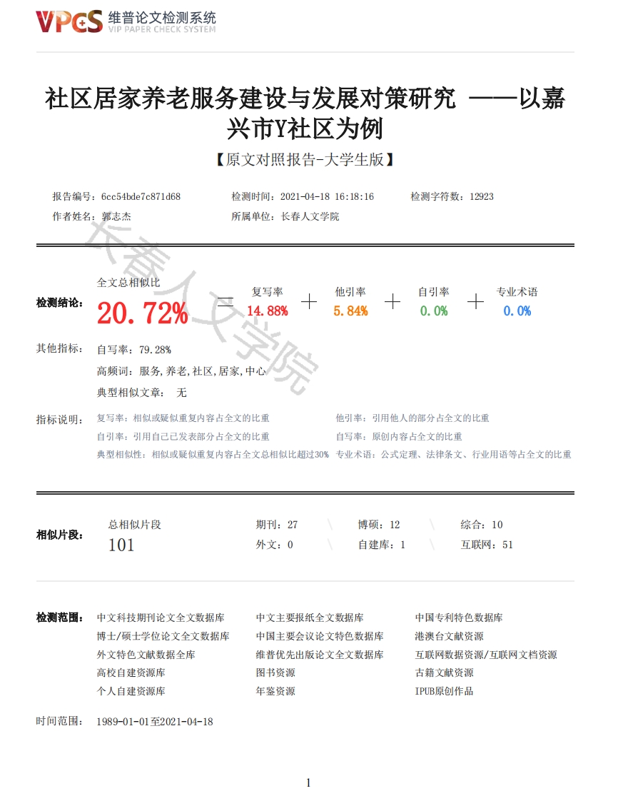 维普论文检测系统VIP PAPER CHECK SYSTEM社区居家养老服务建设与发展对策研究一一以嘉兴市Y社区为例【原文对照报告-大学生版】报告编号:6cc54bde7c871d68检测时间:2021-04-1816:18:16检测字符数:12923作者姓名:郭志杰所属单位:长春人文学院全文总相似比复写率他引率自引率专业术语检测结论:20.72%14.88%5.84%0.0%0.0%其他指标:自写率:79.28%高频词:服务,养老,社区,居家,中院典型相似文章:无指标说明:复写率:相似或疑似重复内容占全文的比重他引率:引用他人的部分占全文的比重自引率:引用自己已发表部分占全文的比重自写率:原创内容占全文的比重典型相似性:相似或疑似重复内容占全文总相似比超过30%专业术语:公式定理、法律条文、行业用语等占全文的比重总相似片段期刊:27博硕:12综合:10相似片段:101外文:0自建库:1互联网:51检测范围:中文科技期刊论文全文数据库中文主要报纸全文数据库中国专利特色数据库博士/硕士学位论文全文数据库中国主要会议论文特色数据库港澳台文献资源外文特色文献数据全库维普优先出版论文全文数据库互联网数据资源/互联网文档资源高校自建资源库图书资源古籍文献资源个人自建资源库年鉴资源IPUB原创作品时间范围:1989-01-01至2021-04-18维普论文检测系统VIP PAPER CHECK SYSTEM原文对照颜色标注说明:■自写片段■复写片段(相似或疑似重复)口引用片段(引用)■专业术语(公式定理、法律条文、行业用语等)目录第一章绪论1一、研究性背景1二、研究的价值和意义1三、文献研究1学院四、嘉兴市Y社区选择理由11.选题的代表性12.研究的便利性2第二章本论2一、Y社区居家养老服务中心基本情况21.中心概述22.老年人基本情况2二、Y社区居家养老服务中心的运营21.老人需求情况22.中心运营状况3(1)运营主体3(2)运营内容3三、Y社区居家养老服务建设的经验3(一)场所布局合理,三治融合促发展3(二)“经开夕阳红”智慧医养结合服务平台建设3(1)“经开夕阳红”居家养老品牌3(2)智慧医养结合服务平台建设3(三)专项考核建设4四、居家养老服务建设存在的问题5(一)政策有待完善,政府资金压力大5(二)服务质量不高,供需关系不平衡5(三)专业人才缺乏,服务效果质量低5(四)功能定位偏差,机构运作衔接差6五、推进社区居家养老服务对策建议6(一)政策支持,履行主导责任62维普论文检测系统VIP PAPER CHECK SYSTEM(二)资金筹集,拓宽发展道路6(三)资金筹集,拓宽发展道路7(四)介入模式,智慧社区建设7(五)壮大队伍,推动人才构建7(六)社工融入,助推服务建设7第三章结论8参考文献9社区居家养老服务建设与发展对策研究一一以嘉兴市Y社区为例摘要随着老龄化程度的不断加剧,家庭养老和机构养老之间发展不平衡的问题,不能满足老年人的多元化需求。近年来,民政部门出台相关政策推动居家养老的发展。社区居家养老模式充分发挥了社区的功能,通过将家庭养老和机构养老两者之间的优点进行有机结合,调动政府、社区、社会组织等多方力量,建立起了以居家为基础、社区为依托的社区居家养老服务支持体系。本文通过对Y社区“经开夕阳红”养老服务中心进行走访调查研究,结合Y社区居家养老服务的基本情况,分析其发展现状和面临困境,寻找出现在大多数城市社区居家养老存在的“碎片化”困境,浅析社区居家养老服务中存在的普遍性问题,为养老服务中心未来发展提出合理建议。关键词:社区居家养老:养老服务:发展对策AbstractWith the aggravation of the aging degree,the imbalance between the family pension andinstitutional pension can not meet the diversified needs of the elderly In recent years,the CivilAffairs Department has issued relevant policies to promote the development of home-based care Thecommunity home-based pension model gives full play to the function of the community.By organicallycombining the advantages of family pension and institutional pension,and mobilizing the forces ofthe government,community,social organizations and other parties,the community home-based pensionservice support system has been established.Based on the investigation and research of the "JingkaiSunset Hong"old-age care service center in Y community,this paper analyzes its development statusand difficulties combined with the basic situation of the home-based old-age care service in Ycommunity.Looking for the "fragmentation"dilemma that appears in most urban community home careservices,analyzing the common problems in community home care services,and putting forwardreasonable suggestions for the future development of pension service centers.Key words:Community home care:Pension services:Development countermeasures第一章绪论一、研究性背景随着人口老龄化程度的不断加深,养老这一社会问题备受关注,国务院相关部门针对老龄事业的建设发布一系列政策。2011年3月,民政部组织编制的《社区老年人日间照料中心建设标准》实施,标准对日间照料中心做出了明确说明。“十三五”时期,制定了《国家老龄事业发展和养老体系建设规划》,在“夯实居家社区养老服务基础”一节中,进一步明确了社区养老服务的地位。2019年8月,国务院常务会议上提出了“依托社区发展以居家为基础的多样化养老服务”的构想。2020年,党的十九届五中全会提出构建居家社区机构相协调、医养康养相结合的养老服务体系,明确了养老服务体系的发展趋势,点明了社区居家养老的基础性地位。老年人口是养老服务需求的主体,中国人口老龄化和老龄人口高龄化都呈现