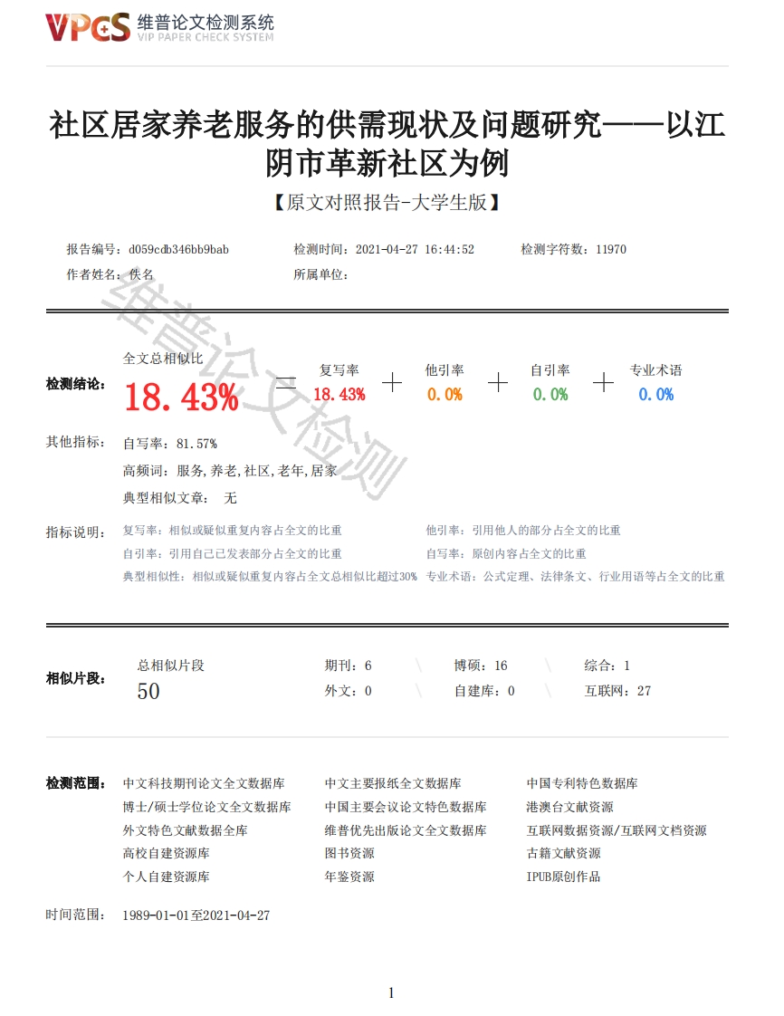 维普论文检测系统VIP PAPER CHECK SYSTEM社区居家养老服务的供需现状及问题研究一一以江阴市革新社区为例【原文对照报告-大学生版】报告编号:d059cdb346bb9bab检测时间:2021-04-2716:44:52检测字符数:11970作者姓名:佚名所属单位:全文总相似比复写率他引率自引率专业术语检测结论:18.43%18.43%十0.0%0.0%0.0%其他指标:自写率:81.57%高频词:服务,养老,社区,老年,居家典型相似文章:无指标说明:复写率:相似或疑似重复内容占全文的比重他引率:引用他人的部分占全文的比重自引率:引用自己已发表部分占全文的比重自写率:原创内容占全文的比重典型相似性:相似或疑似重复内容占全文总相似比超过30%专业术语:公式定理、法律条文、行业用语等占全文的比重总相似片段期刊:6博硕:16综合:1相似片段:50外文:0自建库:0互联网:27检测范围:中文科技期刊论文全文数据库中文主要报纸全文数据库中国专利特色数据库博士/硕士学位论文全文数据库中国主要会议论文特色数据库港澳台文献资源外文特色文献数据全库维普优先出版论文全文数据库互联网数据资源/互联网文档资源高校自建资源库图书资源古籍文献资源个人自建资源库年鉴资源IPUB原创作品时间范围:1989-01-01至2021-04-27维普论文检测系统VIP PAPER CHECK SYSTEM原文对照颜色标注说明:■自写片段■复写片段(相似或疑似重复)口引用片段(引用)■专业术语(公式定理、法律条文、行业用语等)UNIVWEn2HEnG苏WENZHENG COLLEGE OF SOOCHOW UNIVERSITY本科毕业设计(论文)题目社区居家养老服务的供需现状及问题研究一一以江阴市革新社区为例院系法政学院专业劳动与社会保障年级2017级学号20170104218姓名华千禧指导老师刘绮莉职称讲师论文提交日期2020年5月目录摘要1Abstract2前言3一、江阴市革新社区居家养老服务的供给现状4(一)革新社区简介4(二)革新社区居家养老服务供给主体4(三)革新社区居家养老服务供给现状4二、江阴市革新社区居家养老服务的供需分析7(一)需求调研的数据解读及问题7(二)供需方面的原因分析11三、改善江阴市革新社区居家养老服务的相关建议132维普论文检测系统VIP PAPER CHECK SYSTEM(一)发挥政府主导作用,建立相关政策规划及配套措施13(二)整合养老服务资源,完善居家养老服务体系13(三)坚持以服务为本,实现养老服务供给与需求的整体契合14(四)加大对社区居家养老服务宣传力度,增强意识14结论16参考文献17致谢19附录20摘要革新社区作为江阴市中心区域,老龄化率约33%,远远高出江阴市24%的平均水平,已成为目前老龄化程度最高的社区之一。同时,作为国家居家和社区养老服务改革试点城市之一,江阴市已采取了一系列政策和措施。然而,在发展过程中一些问题逐渐显露,其中服务供需矛盾以及居家养老规范化管理最为突出。本文选取江阴市革新社区老年人为研究对象,采用多阶段随机抽样调查的方式,选取革新社区内的各100名60周岁以上的老年人进行调查,数据收据完成后进行分析。从供需角度出发,探讨了养老服务供需失衡的原因并提出相关建议。关键词:社区居家养老:供给:需求:革新社区AbstractAs the downtown area of Jiangyin,Gexin Community has an aging rate of about 33%,which is farhigher than the average level of 24%in Jiangyin City.It has become one of the most agingcommunities at present.At the same time,Jiangyin City has adopted a series of policies andmeasures as one of the pilot cities for the reform of national home and community services for theelderly.However,some problems have gradually emerged in the development process,among which thecontradiction between service supply and demand and the standardized management of home care are themost prominent.This paper selects the elderly in Jiangyin City's Gexin Community as the researchobject,adopts a multi-stage random sampling survey method,selects 100 elderly people over 60 yearsold in the Gexin Community for investigation,and analyzes the data after the receipt is completed.From the perspective of supply and demand,the reasons for the imbalance between supply and demandof elderly care services are discussed and relevant suggestions are made.Key words:community home care;supply:demand;reform community前言全世界中国老年人口绝对规模最大、老龄发展速度最快,高龄老人、失能老人、空巢老人、贫困老人比例较高。预测到2050年,我国60岁以上老年人口数量将达到4.83亿人占总人口比重的34.1%,其中80岁以上的高龄老人将达到1.08亿。社区居家养老是一项符合老年人特点与需求的养老服务模式。截至2018年底,江阴市有常年居住人口160万人,户籍人口125万人,其中60岁以上人口数为38.4万人,老龄化率达24%,老龄化严重。在此背景下,为积极应对城市人口老龄化问题,江阴市革新社区探索和试点寻求发展社区居家养老服务的有效方案。本文从供需角度出发,全面探讨当前社区居家养老服务的供给现状和需求现状并分析其影响因素,总结归纳供需失衡的具体方面和产生原因。在此基础上提出更具科学化、规范化的意见和建议,从而提升社区居家服务具有针对性和专业性的供给。一、江阴市革新社区居家养老服务的供给现状(一)革新社区简介革新社区由革新村与原永安社区合并而成,办公地址位于江阴市永安路2号。辖区总面积约2.38平方公里,它东起澄扬路,南至新长铁路、芙蓉大道,西至绮山路、大桥路、应天河,北至毗陵路、人民东路。目前辖区居民总户数约4516户,常住人口6578人,寄住人口3785人,暂住人口4901人,空挂户