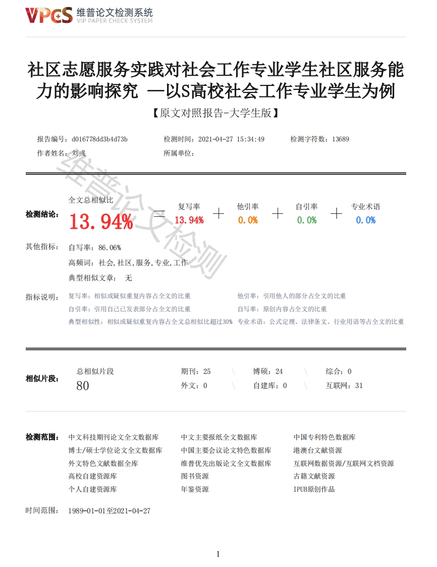 维普论文检测系统VIP PAPER CHECK SYSTEM社区志愿服务实践对社会工作专业学生社区服务能力的影响探究一以$高校社会工作专业学生为例【原文对照报告-大学生版】报告编号:d016778dd3b4d73b检测时间:2021-04-2715:34:49检测字符数:13689作者姓名:刘彧所属单位:全文总相似比复写率他引率自引率专业术语检测结论:13.94%13.94%0.0%0.0%0.0%其他指标:自写率:86.06%高频词:社会,社区,服务,专业,工作典型相似文章:无指标说明:复写率:相似或疑似重复内容占全文的比重他引率:引用他人的部分占全文的比重自引率:引用自己已发表部分占全文的比重自写率:原创内容占全文的比重典型相似性:相似或疑似重复内容占全文总相似比超过30%专业术语:公式定理、法律条文、行业用语等占全文的比重总相似片段期刊:25博硕:24综合:0相似片段:80外文:0自建库:0互联网:31检测范围:中文科技期刊论文全文数据库中文主要报纸全文数据库中国专利特色数据库博士/硕士学位论文全文数据库中国主要会议论文特色数据库港澳台文献资源外文特色文献数据全库维普优先出版论文全文数据库互联网数据资源/互联网文档资源高校自建资源库图书资源古籍文献资源个人自建资源库年鉴资源IPUB原创作品时间范围:1989-01-01至2021-04-27维普论文检测系统VIP PAPER CHECK SYSTEM原文对照颜色标注说明:■自写片段■复写片段(相似或疑似重复)口引用片段(引用)■专业术语(公式定理、法律条文、行业用语等)社区志愿服务实践对社会工作专业学生社区服务能力的影响探究一以$高校社会工作专业学生为例前言摘要:近年来,随着社会需求的多元发展,社会工作作为重要的社会力量逐渐参与到社会治理中来,而社区作为社会治理的基本单元,为社会工作专业学生施展专业技术提供了全方位的实践平台。社会工作专业学生从事社区志愿服务活动,既是个人服务社会的精神体现,也是社会工作专业能力提升的必然要求。通过参与社区志愿服务实践,一定程度上能够提升社会工作专业学生的通识素养,增进他们对社区服务专业价值与理念的认同,进而提升其社区实务能力。本研究以参与过社区志愿服务的$高校社会工作专业在校大学生为研究对象,运用文献法、访谈法等研究方法,以增能理论为指导,从社会工作专业学生所参与社区志愿服务的内容入手,探究参与社区志愿服务实践对提升社会工作专业学生社区服务能力的影响,以鼓励更多的社会工作专业学生参与到社区志愿服务实践中来。关键词:社会工作专业学生、社区志愿服务、社区服务能力一、导论(一)研究的背景和意义1.研究背景社会工作专业学生是城市社区服务的主要后备力量,在社区服务的各个领域都发挥着重要作用。他们社区服务能力的高低将影响着建构和谐社区的进程,因此,培养其社区服务能力是十分必要的。在社会工作专业教育的过程中,社区是社会工作专业学生进行专业实践与实习的重要场所与平台之一。社区志愿服务则是本专业学生进行专业实践与实习的重要形式。大学生通过在社区内进行持续时间较短、涉及各个领域、形式多样的义务服务,能够在服务过程中提升他们的社会性与专业性:但是当前大学生进入社区进行志愿服务仍然面临着积极性不高、服务效果不理想以及评价激励措施不到位等一系列问题。社会工作学生虽然具备一定理论知识,但他们的实践能力还有很大的提升空间。已有的专业实践已经向我们证明,社区志愿服务使学生在深入社区开展活动的过程中既能够完善在理论方面的不足,又可以弥补课堂教育在增强学生专业实务能力方面的空缺。但是在这一方面依然缺少深入具体的研究,社区志愿服务在哪些方面能够提升专业学生的社区服务能力依然还缺少研究支持。2.研究意义(1)理论意义通过研究的开展,全面了解高校社会工作专业学生参与社区志愿服务的现状,对社会工作在社区志愿服务中所涉及的专业领域进行详尽的划分。以专业视角为出发点,结合增能理论透过社会工作专业学生参与社区志愿服务的收获,探究社区志愿服务对社会工作专业学生社区服务能力提升的影响,一方面有助于拓宽高校社会工作专业教育2维普论文检测系统VIP PAPER CHECK SYSTEM的能力建设路径,另一方面也可以为社区志愿服务方面的相关研究提供理论补充。(2)实践意义社会工作作为应用性学科和实践性取向的专业,在教学过程以实务为导向具有理论性和现实必要性,所以社会工作专业学生参与社区志愿服务具有普遍性也具有重大意义。在参与的过程中,学生是主体,只有充分把握学生在参与过程中获得的在专业领域的成长和变化,高校、社区等校内外的督导等系统才能在社区志愿服务发挥的积极作用的同时,针对区志愿服务过程中对于提升专业学生社区服务能力依然存在的局限,为参与学生提供针对性的指导和培训,改进专业学生参与社区志愿服务的模式以提升参与效果,加强社会工作专业学生的服务能力建设,从而为社会工作继续提供源源不断的兼具理论与实务经验的一线工作者。(二)文献综述1.国内研究现状(1)关于高校社区志愿服务实践积极影响的相关研究高校社区志愿服务不仅能提高专业学生的专业能力和综合素质,更能为社区治理、社区发展贡献力量,是新时代国家治理体系和治理能力现代化改革不可或缺的一部分。落脚到微观方面,即在专业学生