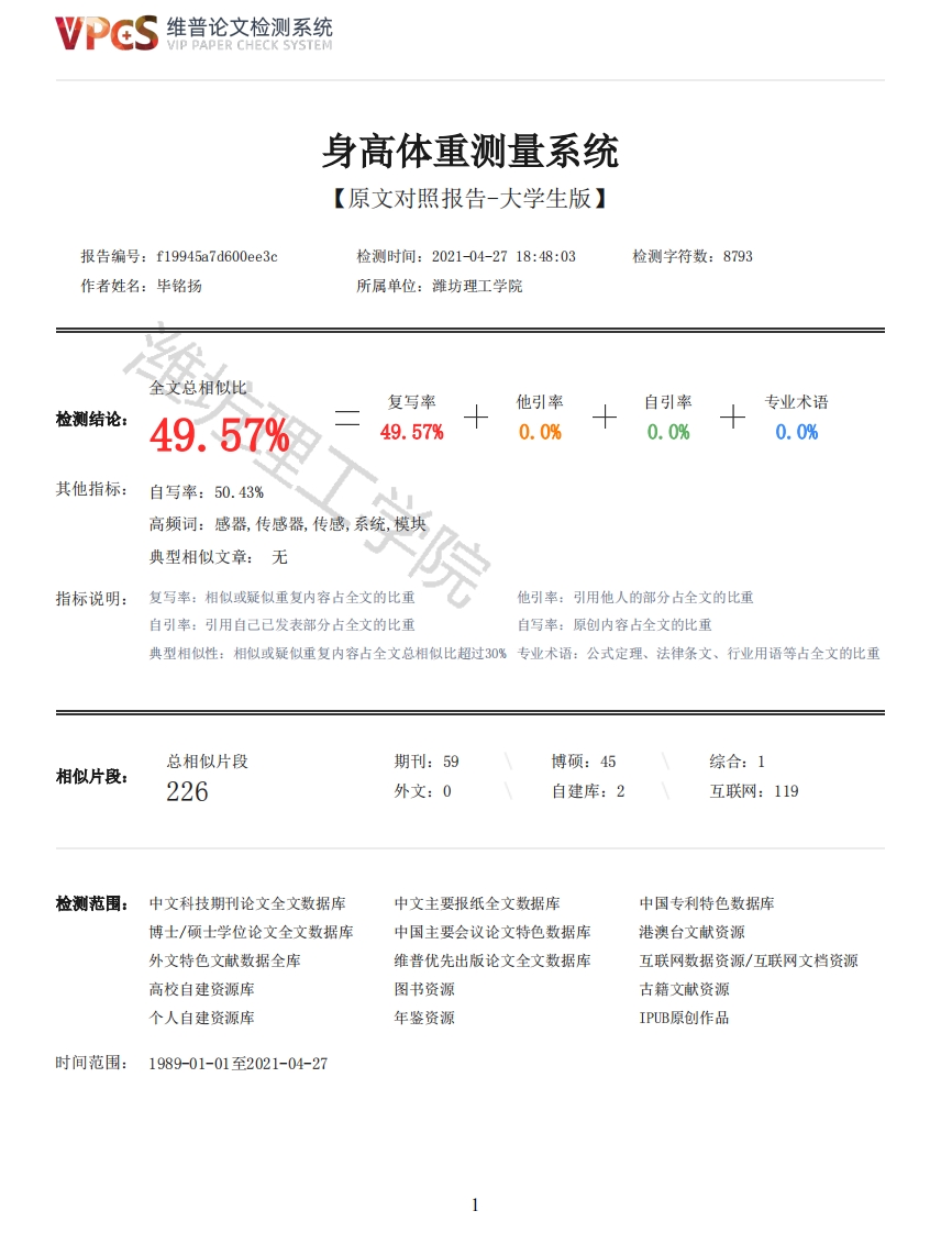 维普论文检测系统VIP PAPER CHECK SYSTEM身高体重测量系统【原文对照报告-大学生版】报告编号:f19945a7d600ee3c检测时间:2021-04-2718:48:03检测字符数:8793作者姓名:毕铭扬所属单位:潍坊理工学院全文总相似比复写率他引率自引率专业术语检测结论:49.57%49.57%0.0%0.0%0.0%其他指标:自写率:50.43%高频词:感器,传感器,传感,系统,模块典型相似文章:无指标说明:复写率:相似或疑似重复内容占全文的比重他引率:引用他人的部分占全文的比重自引率:引用自己已发表部分占全文的比重自写率:原创内容占全文的比重典型相似性:相似或疑似重复内容占全文总相似比超过30%专业术语:公式定理、法律条文、行业用语等占全文的比重总相似片段期刊:59博硕:45综合:1相似片段:226外文:0自建库:2互联网:119检测范围:中文科技期刊论文全文数据库中文主要报纸全文数据库中国专利特色数据库博士/硕士学位论文全文数据库中国主要会议论文特色数据库港澳台文献资源外文特色文献数据全库维普优先出版论文全文数据库互联网数据资源/互联网文档资源高校自建资源库图书资源古籍文献资源个人自建资源库年鉴资源IPUB原创作品时间范围:1989-01-01至2021-04-27维普论文检测系统VIP PAPER CHECK SYSTEM原文对照颜色标注说明:■自写片段■复写片段(相似或疑似重复)口引用片段(引用)■专业术语(公式定理、法律条文、行业用语等)题目身高体重测量系统姓名毕铭扬学号201701011102院部新松机器人学院专业电子信息工程指导教师陈宪琳职称副教授2021年4月3日潍坊理工学院教务处制院目录摘要IABSTRACTII第1章绪论11.1发展背景及意义11.2系统研究的预期目标和任务1第2章系统方案22.1组成22.2工作原理22.3超声波传感器选型32.4压力传感器选型32.5温度传感器选型42.6主控芯片选型52.7显示屏选型52.8语音播报模块选型6第3章身高体重测量系统硬件设计83.1STM32F107VC最小系统83.2超声波测高模块电路83.3HX711称重模块电路93.4温度传感器测温模块电路103.512864液晶显示电路113.6语音播报模块电路133.7蜂鸣器电路132维普论文检测系统VIP PAPER CHECK SYSTEM第4章身高体重测量系统软件设计154.1主流程图154.2超声波模块程序设计174.3体温测量程序设计18参考文献19附录20附录120附录221摘要身高体重测量在当今体检中是必要的测量部分,传统方法是通过秤称尺量来进行身高体重的数据获取,效率并不高而且容易出现测量偏差。而本设计采用了超声波和压力传感器进行测量,不仅提高了效率,也提高了测量精度。并且还加入了体温监测系统和语音播报系统,让本系统的功能更加多元化。本系统是基于ST32的测量系统,包括数据收集、数据分析、数据输出三个模块。数据收集部分由超声波传感器、温度传感器、压力传感器组成。这部分收集外部数据后利用AD转换器进行数据转换,通过与系统内设置的阈值进行比较,出现体温过高的情况会立即蜂鸣器报警。另外,外部数据可以通过语音播报电路进行播报,让使用者实时了解测量数据。关键词:身高体重测量:单片机:多元化系统Greenhouse control systeABSTRACTThe measurement of height and weight is a necessary part in today's physical examination.The traditional method is to obtain the data of height and weight by weighing ruler,which is notefficient and prone to measurement deviation.This design uses ultrasonic and pressure sensor tomeasure,which not only improves the efficiency,but also improves the measurement accuracy.Andalso joined the temperature monitoring system and voice broadcast system,so that the function ofthe system is more diversified.The system is based on STM32 measurement system,including data collection,data analysis,dataoutput three modules.The data collection part is composed of ultrasonic sensor,pressure sensor andtemperature sensor.After collecting external data,this part uses AD converter for data conversion.By comparing with the threshold value set in the system,if the temperature is too high,the buzzerwill alarm immediately.In addition,the external data can be broadcast through the voice broadcastcircuit,so that users can understand the measurement data in real time.Keywords:Height and weight measurement:single chip microcomputer;diversified system第1章绪论1.1发展背景及意义随着社会的不断发展,各种新兴技术也相继出现,传感器技术一直发挥着重要作用,是贯穿各种技术和应用领域的关键。在所有人类触及过的领域,都能找到它的身影。在当今世界上发展最迅猛的技术中,传感器技术占据了一席之地。在全球科研人员。相关机构与产业共同努力下,传感器技术得到了快速的发展和进步。然而以当前的技术水平来说,可供人们使用的传感器技术仍然有限。因此,这是一个充满无限可能的技术和工业领域,而身高体重测量系统就采用了传感器技术。人们生活水平越来越高,身高体重测量系统在快捷体检领域也开始大面积普及。随着科学技术的进步与发展,身高体重测量系统已经在身体发育状况,身体素质等各个方面的综合测定中起到关键作用。随着我国经济社会的进步与发展,人们的生活水平与压力也逐渐增大,人们的身心健康每况愈下,每一个人都更加关心与注重自己的身心状况,对于高质量,高效率的要求也越来越严格。身高体重测量系统在进行测量时不仅能够全自动地测量一个人的身高体重,还能够及时地进行体温监控,当一旦出现体温异常情况时会及时向报警或者提醒。放眼未来,身高体重测量系统将会有很大的技术提升和应用